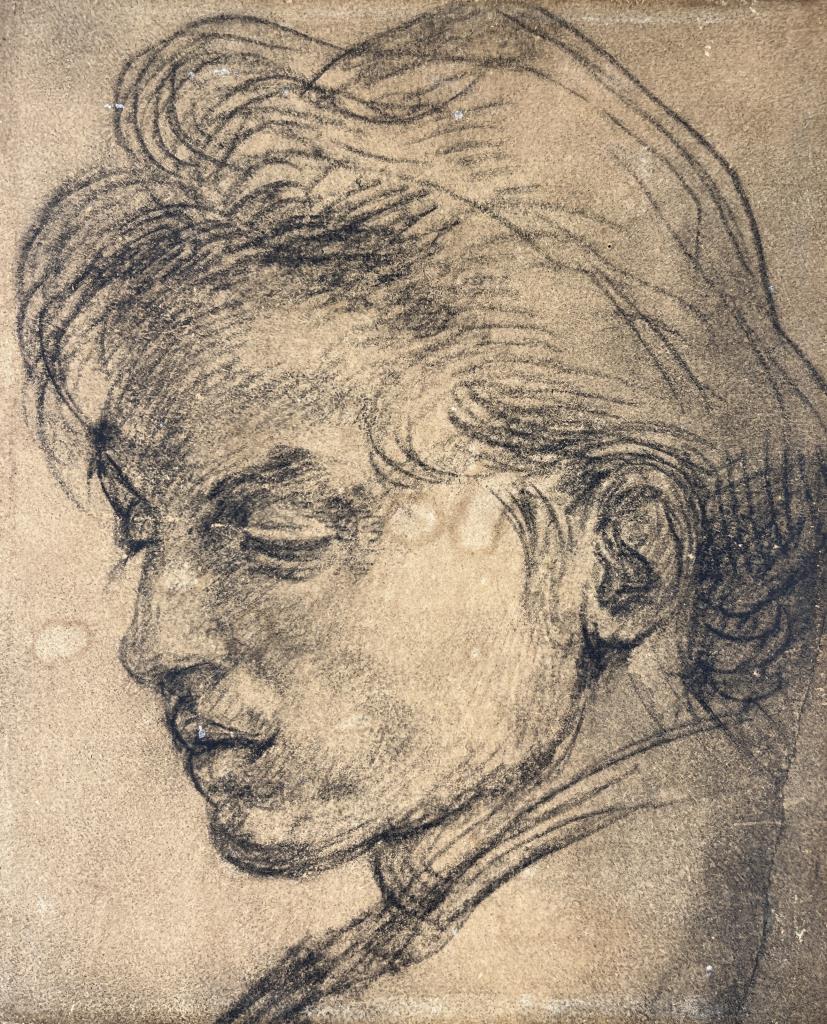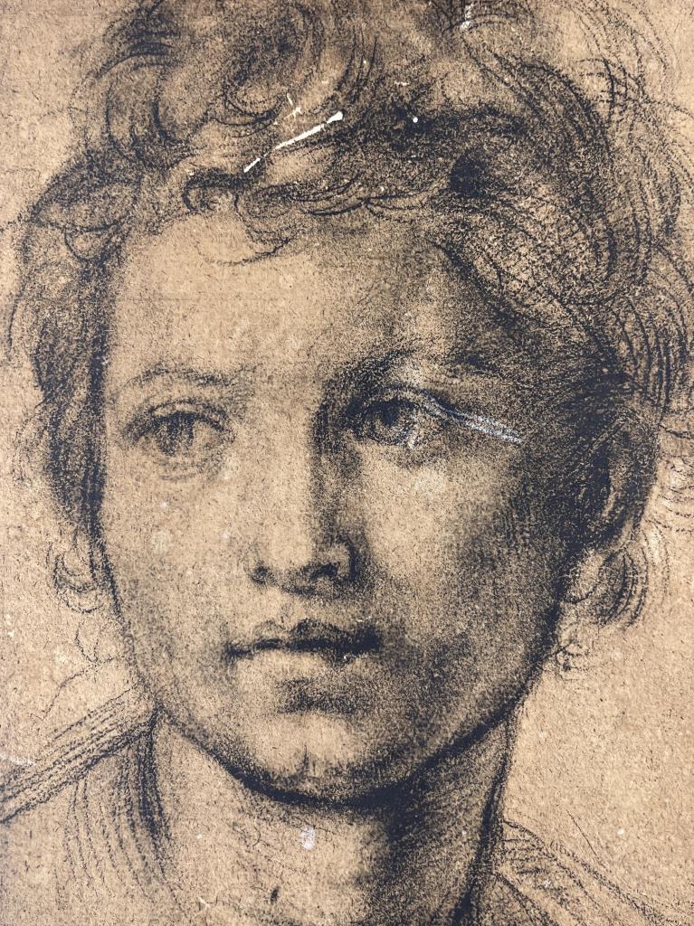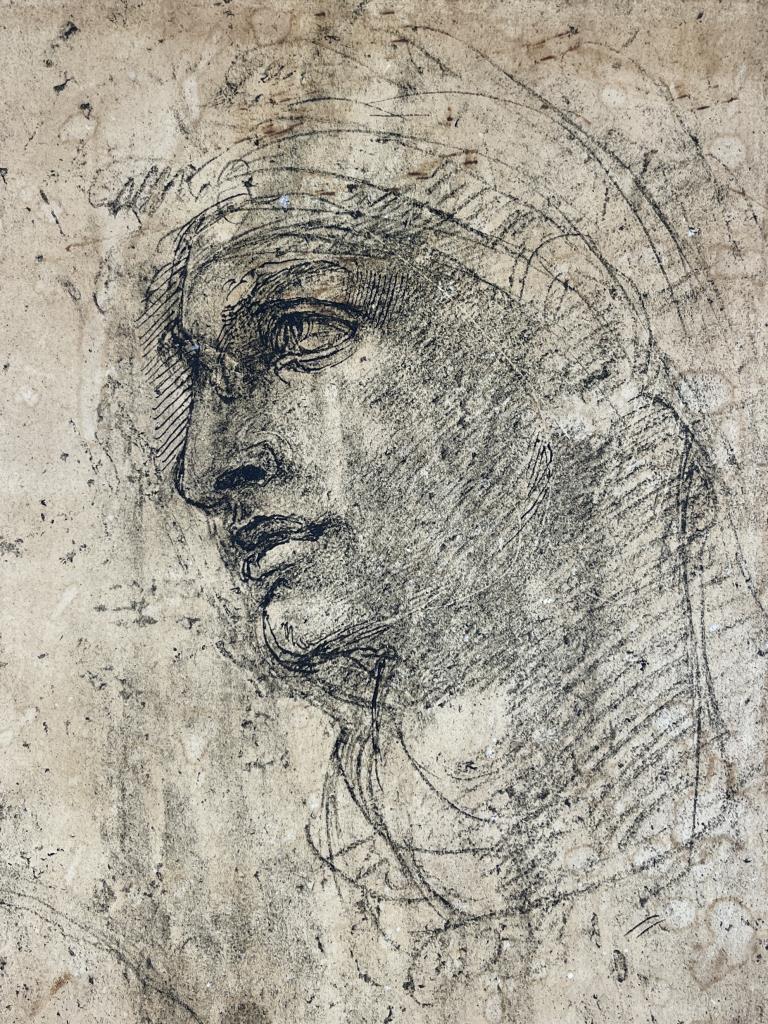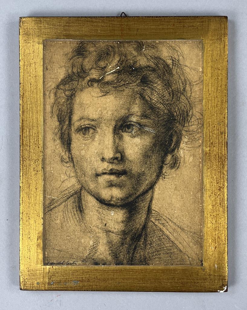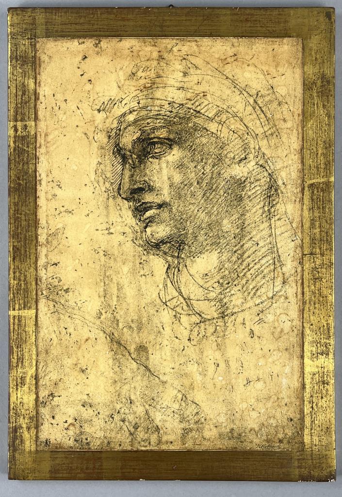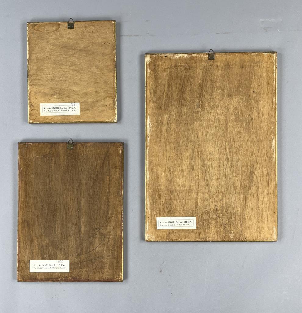 Three Italian Florentine portrait plaques or pictures, featuring the works of Renaissance masters Michelangelo and Andre del Sarto, lithographs mounted to wood, surrounded with painted and gilt gesso, paper labels on the back of each piece for “Fratelli Alinari Societa Anonima Istituto di Edizioni Artistiche,” circa 1960s, the largest measuring 15-3/8″ x 10-5/8. CONDITION: Some scratching and chipping, please see photos. SHIPPING: In-House Shipping Available. Please read our Shipping Policies and Terms and Conditions