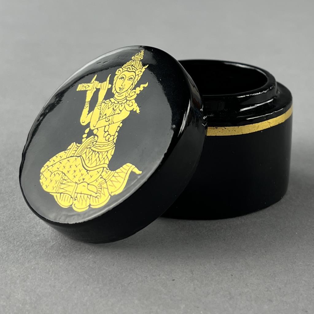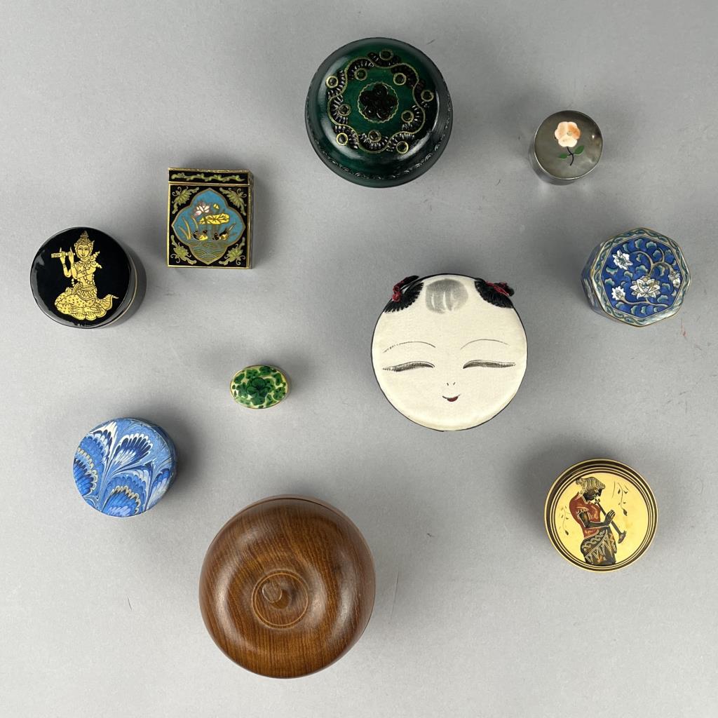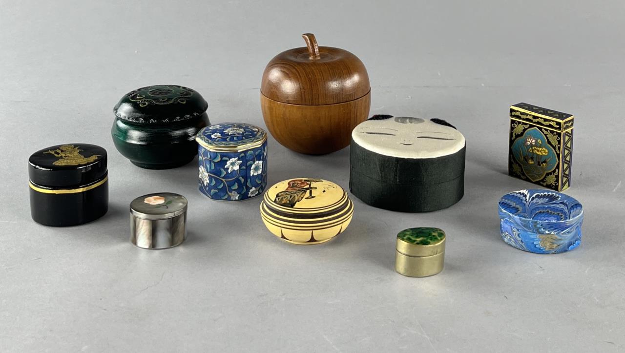 Collection of ten trinket boxes, including examples in turned wood, hand marbelized Italian paper, Chinese cloisonne, Thai and decorated lacquer, hand carved and painted wood, embroidered and painted silk, hand painted porcelain, and more. The largest box, the turned wood apple, is approximately 3-1/4″ (D) x 3-5/16″ (H). CONDITION: SHIPPING: In-House Shipping Available. Please read our Shipping Policies and Terms and Conditions