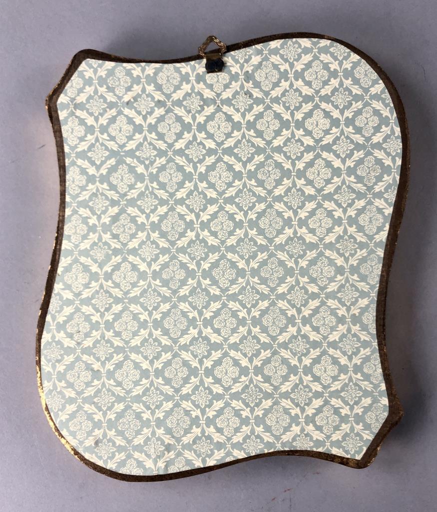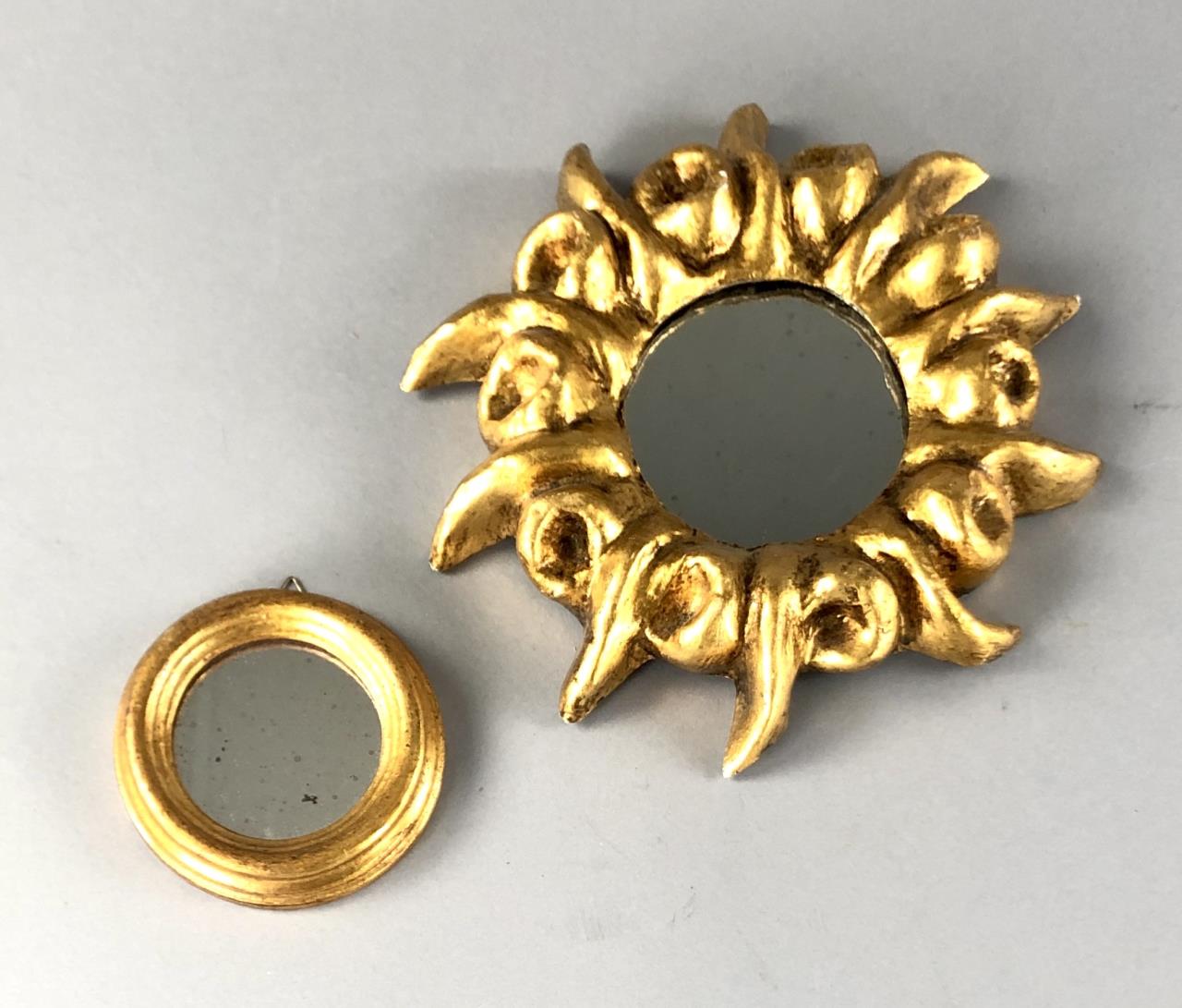 Five small decorative gilt wall hanging mirrors, one is Italian Florentine carved gilt wood, the largest measuring approximately 9-5/8″ x 9-5/8″. CONDITION: Some minor chipping to a couple of the tips of the sunburst style mirror, please see photos. SHIPPING: In-House Shipping Available. Please read our Shipping Policies and Terms and Conditions
