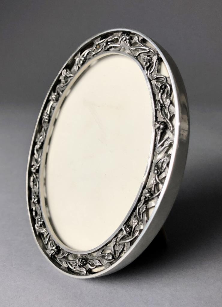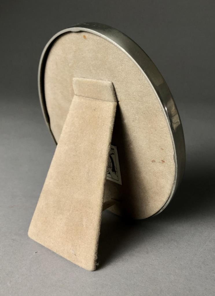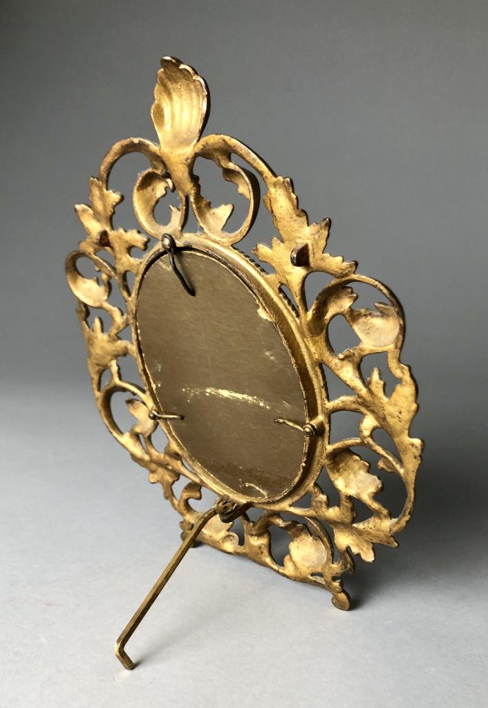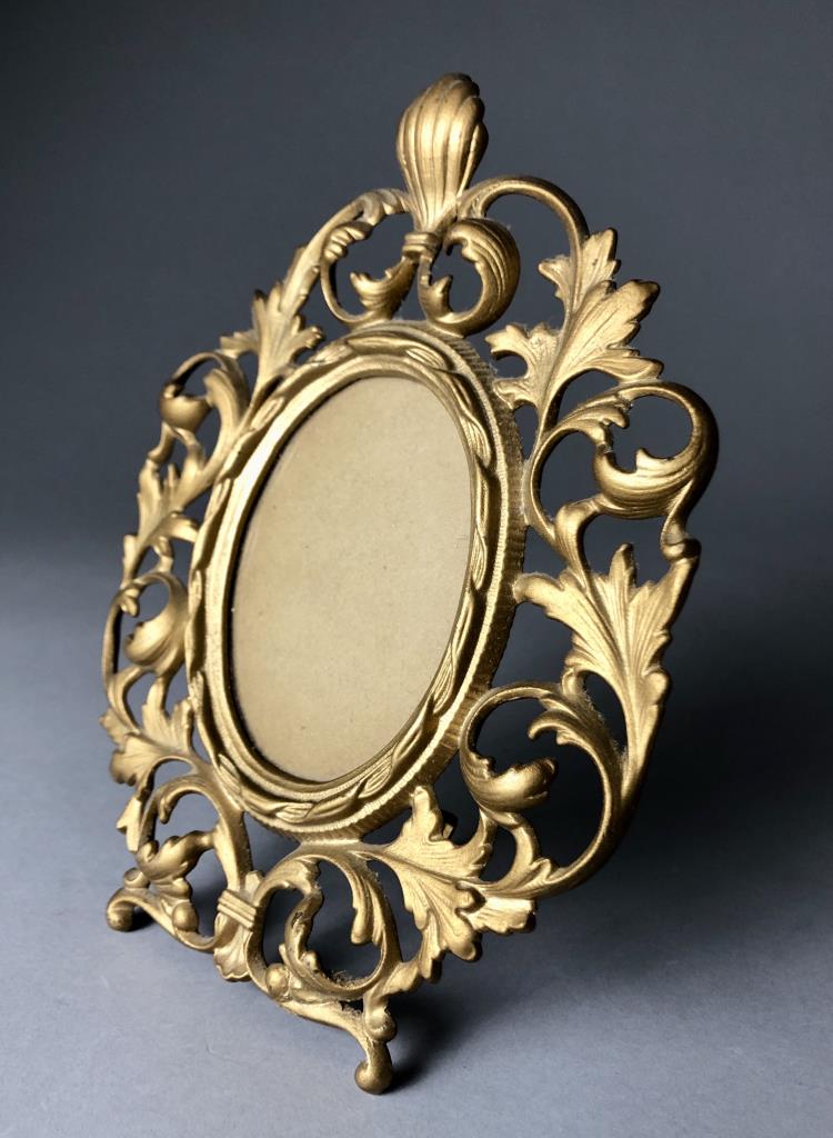 Three small easel back picture frames: antique Victorian gold painted oval cast iron; Crown & Rose oval pewter; and rectangular Italian Johnson’s & Relatives printed paper. The largest measuring approximately 7-1/2″ x 9-1/2″. CONDITION: SHIPPING: In-House Shipping Available. Please read our Shipping Policies and Terms and Conditions