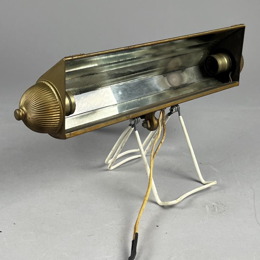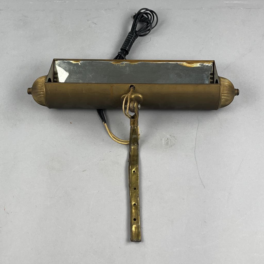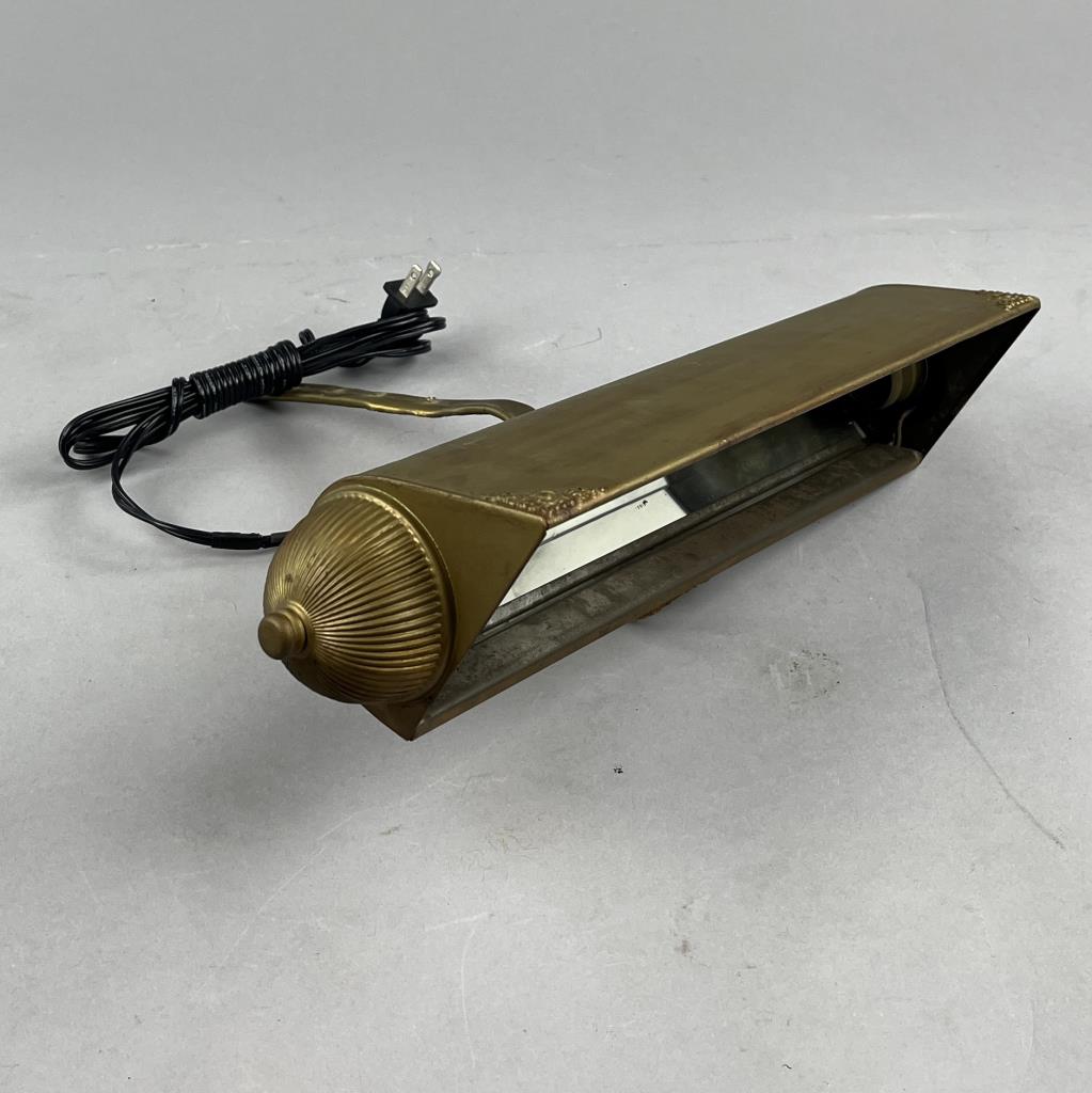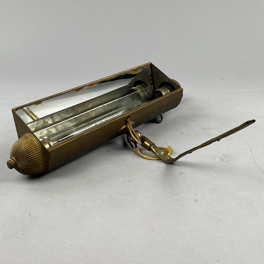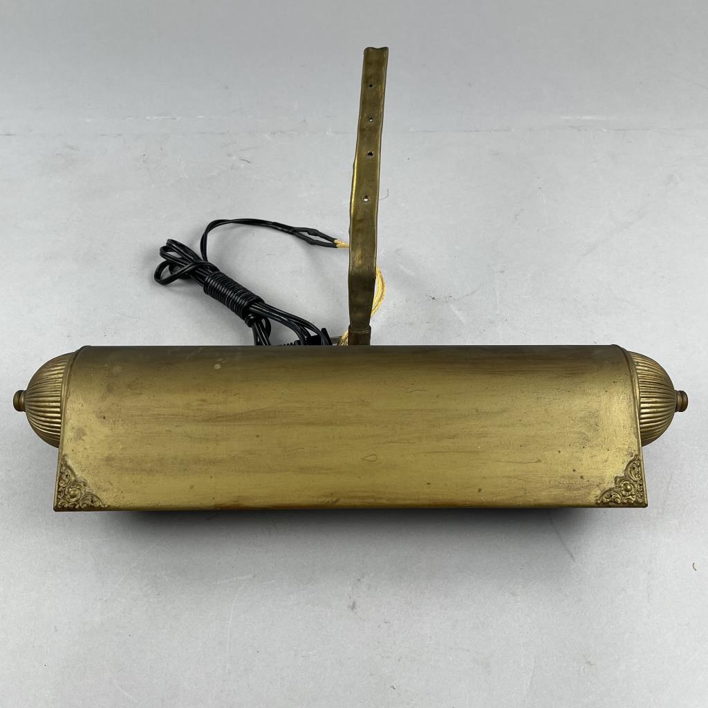 Double light picture frame light, gilt metal, 16″ (L). CONDITION: Untested. Will need to be rewired. Appears to have been repainted at some point. SHIPPING: In-House Shipping Available. Please read our Shipping Policies and Terms and Conditions