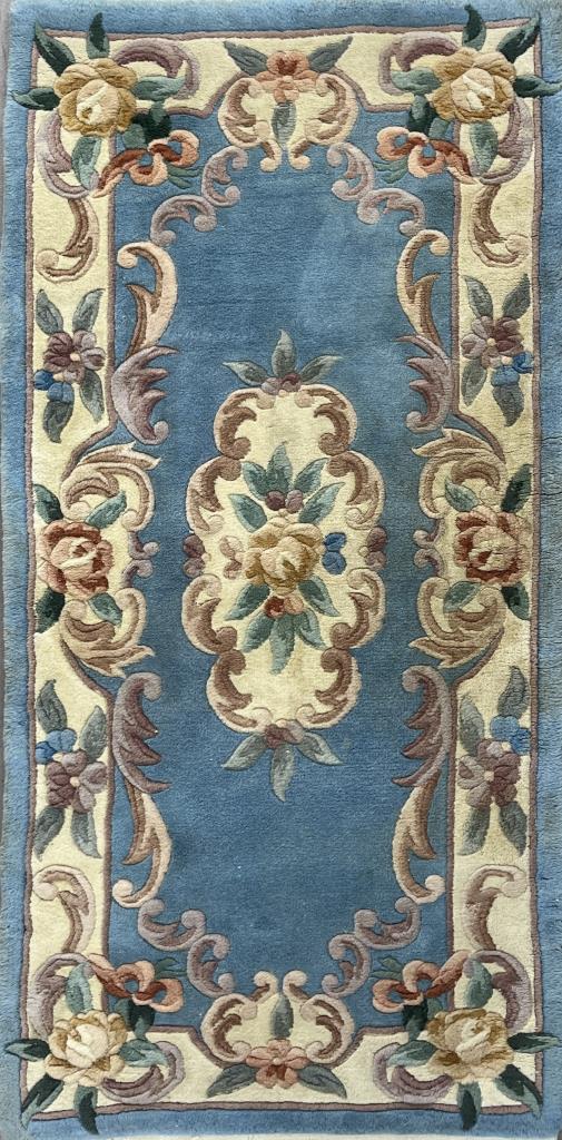 Two hand knotted Aubusson style wool rugs, Chinese, late 20th Century, 49″ x 24-5/16″ and 47-1/4″ x 28-11/16″ ( not including fringes). CONDITION: Some minor areas of discoloration and possible staining. SHIPPING: In-House Shipping Available. Please read our Shipping Policies and Terms and Conditions