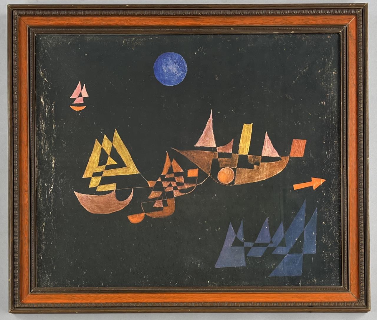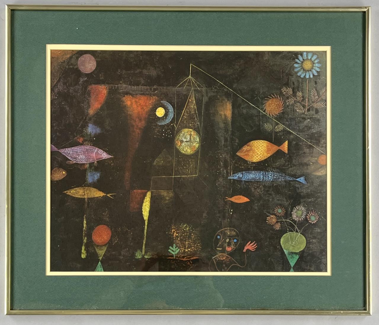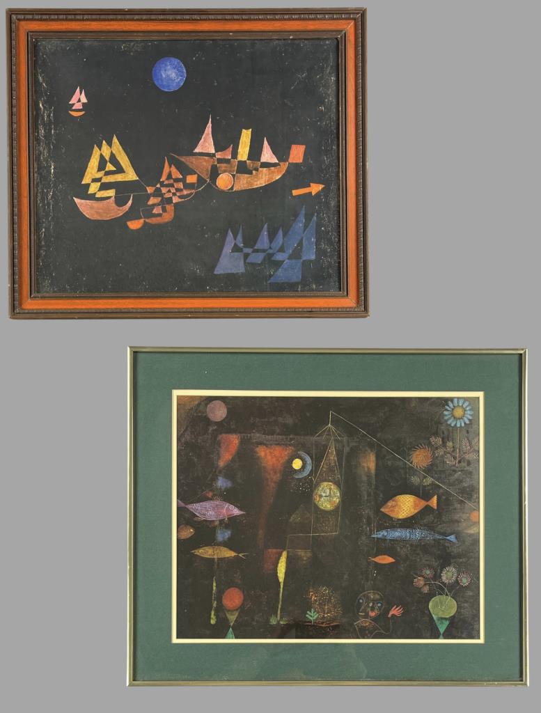 Two framed pictures by the Swiss/German artist Paul Klee (1879-1940): “Fish Magic” (1925) in a metal frame (22-1/4″ x 26-1/4″) and “Departure of the Ships” (1927) in a wood frame (20-3/16″ x 23-1/2″). These modern offset printed copies most likely date from the 1970s or 1980s. CONDITION: Not examined out of frames. Possible sun fading. SHIPPING: Local pick-up or third party shipping only for this lot. Please see the Shipping Policy for information on suggested shippers. We recommend the Pak Mail Store of Battle Creek to assist you. Please contact the shipper of your choice for shipping estimates on this lot. Refer to the Shipping section in our full Terms and Conditions for all information on shipping.