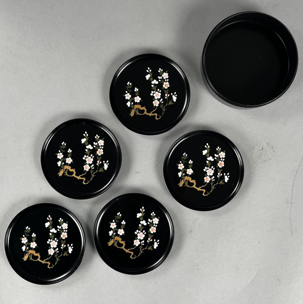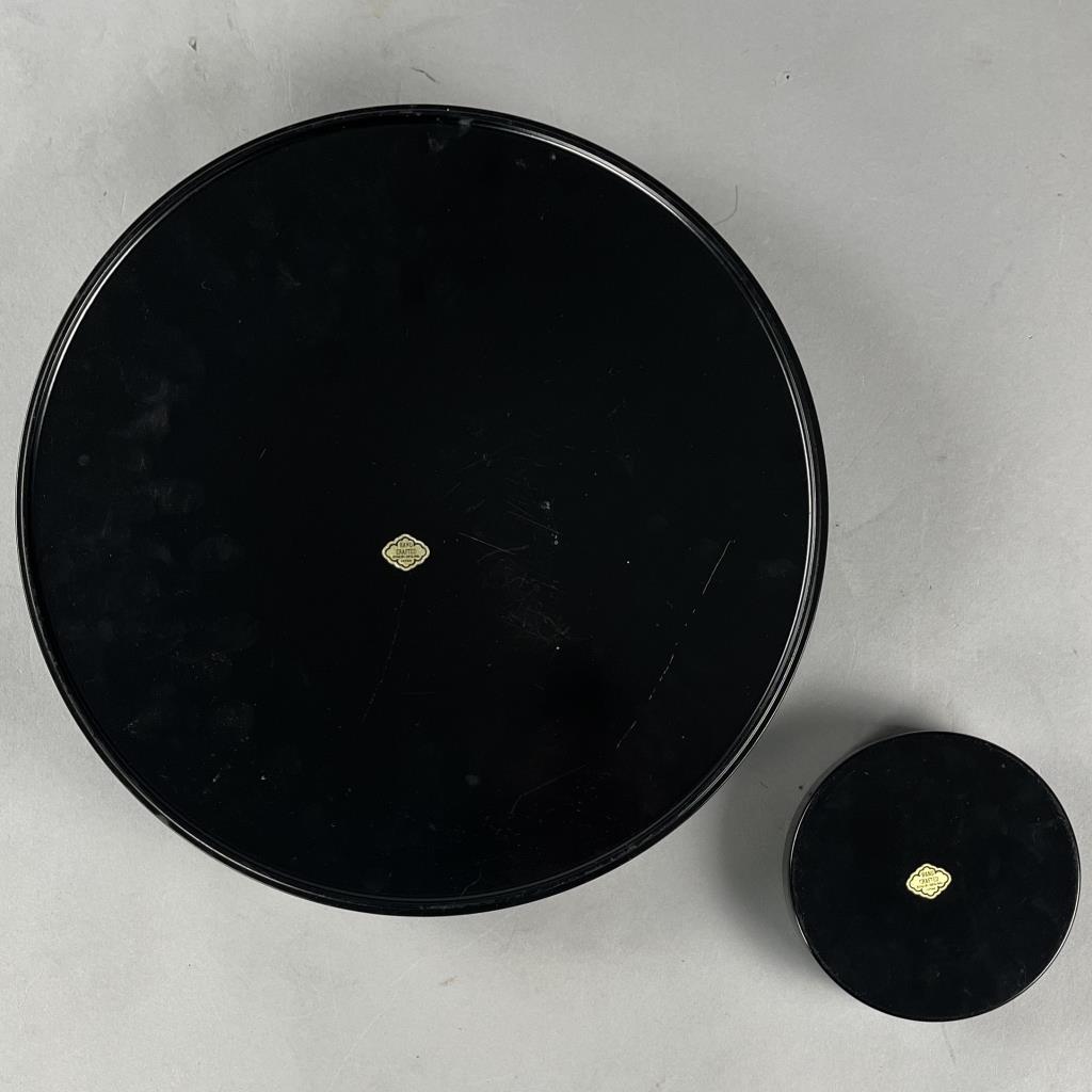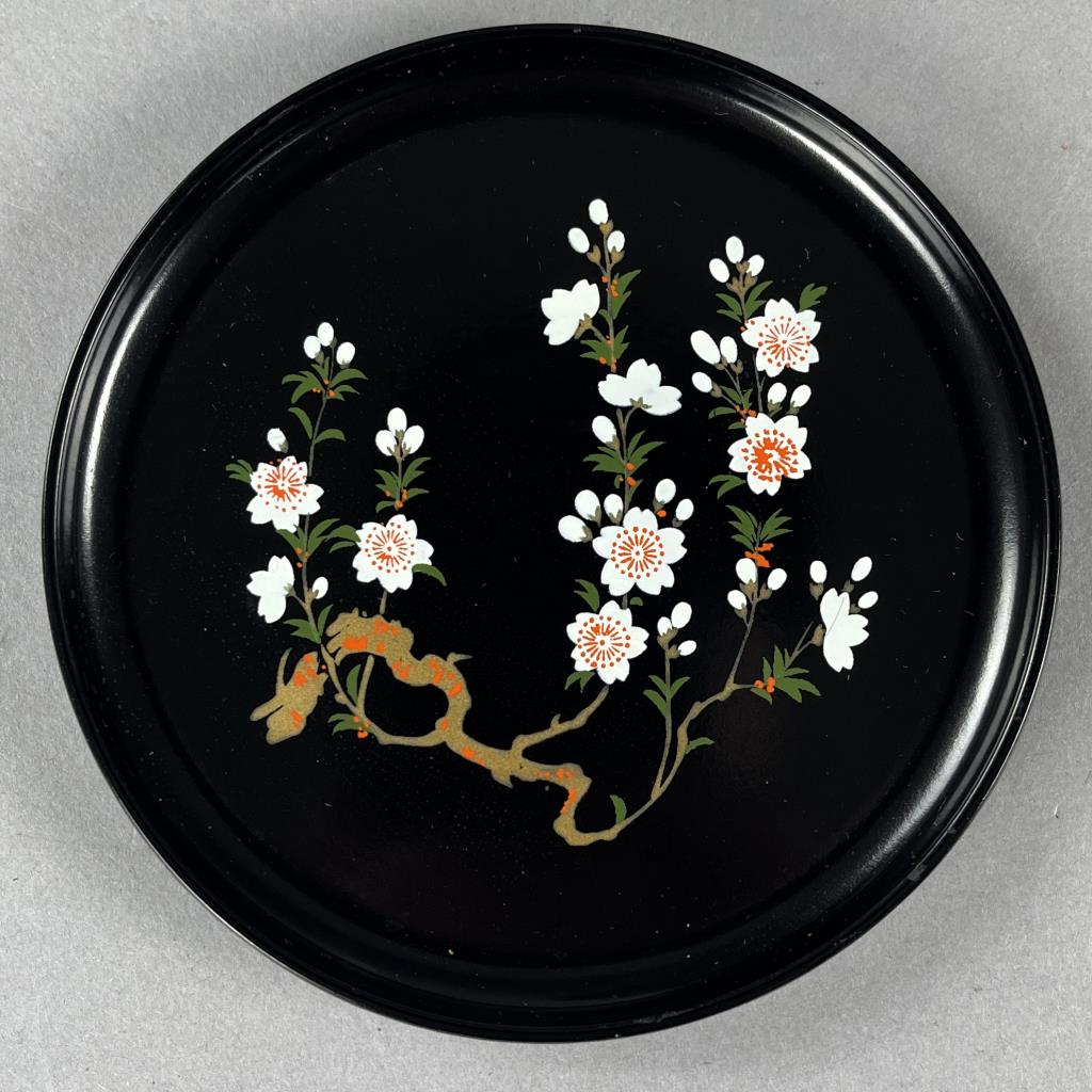 Faux Japanese lacquerware, enamel decorated plastic, round lidded and divided storage container (13-1/8″ D) , and a set of 5 coasters (4-1/8″ D) in a partial box, both pieces marked on the bottom with foil label for Otagiri Mercantile Company, mid 20 Century. CONDITION: The box for the coasters is missing the lid and is chipped on one side. SHIPPING: In-House Shipping Available. Please read our Shipping Policies and Terms and Conditions