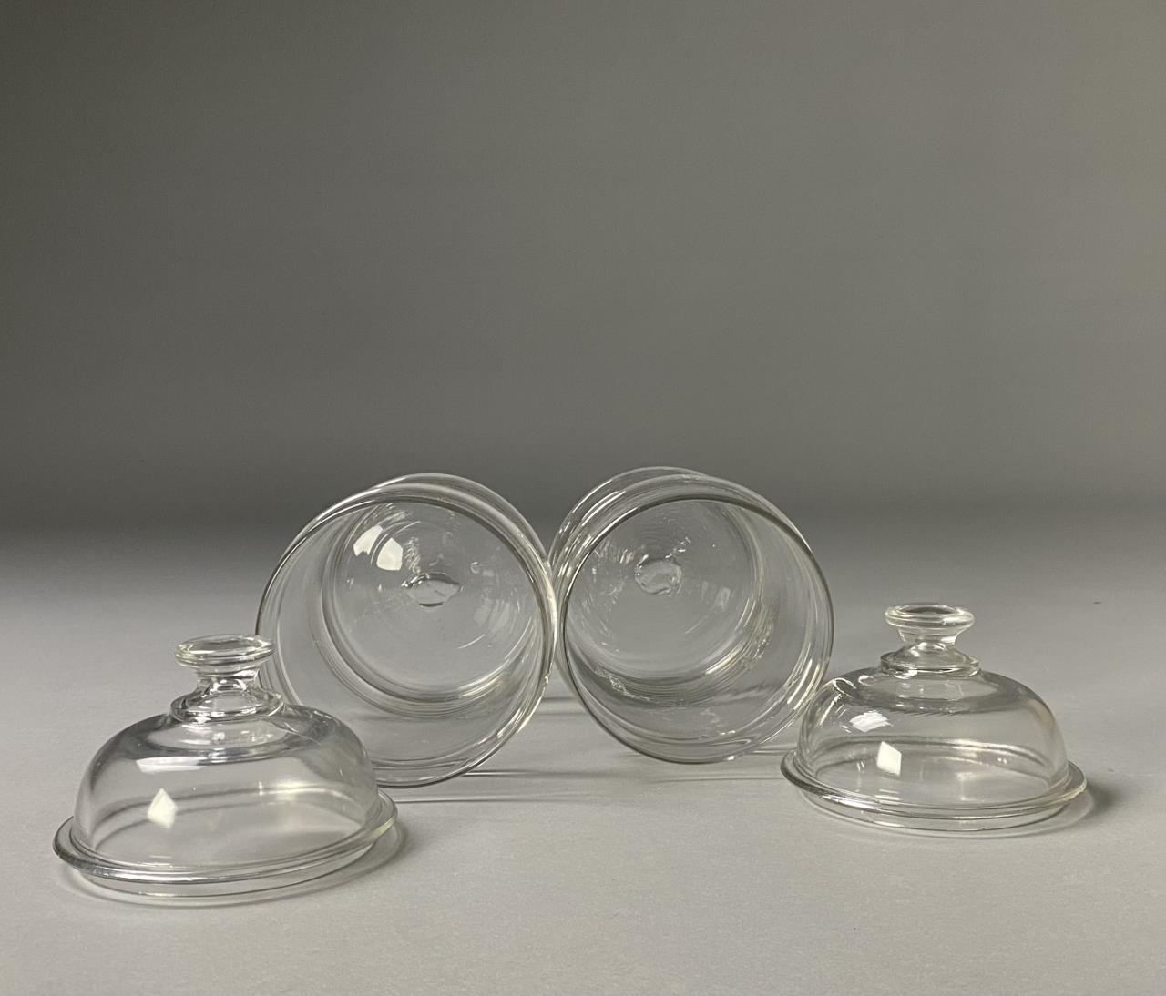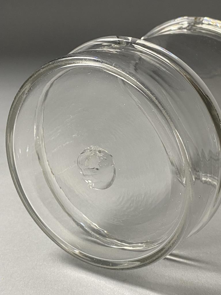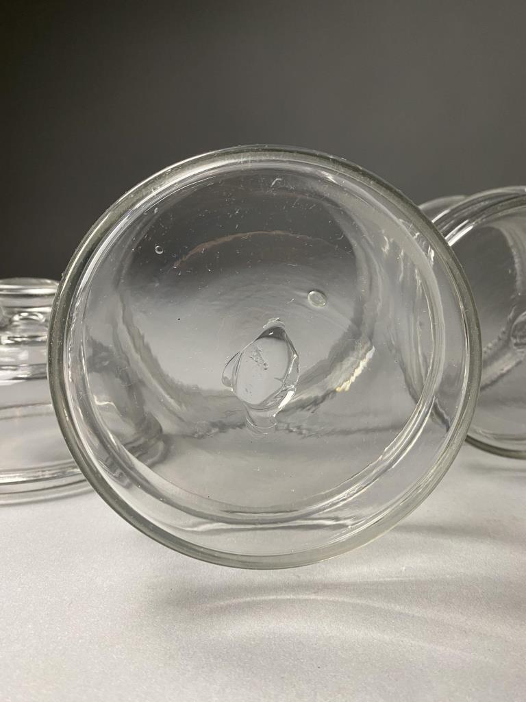 Two19th century American hand blown clear glass apothecary or druggist jars with 2 applied rings for better grip, and unground pontil marks, 5-18″ Dia. x 8″ H. Lids may be a later addition, 5-1/4″ Dia. x 3-1/2″ H.