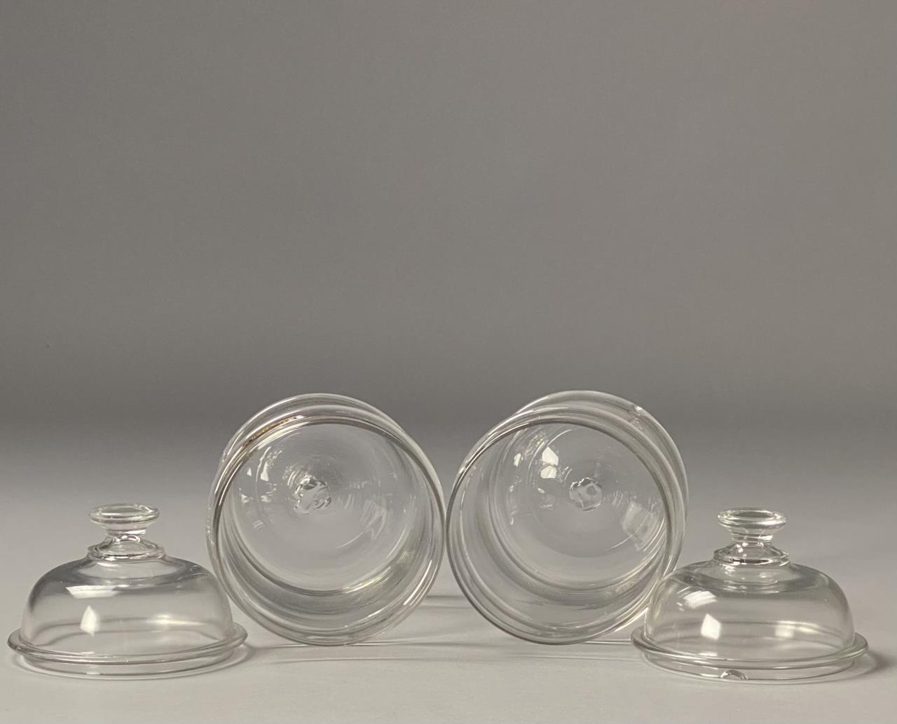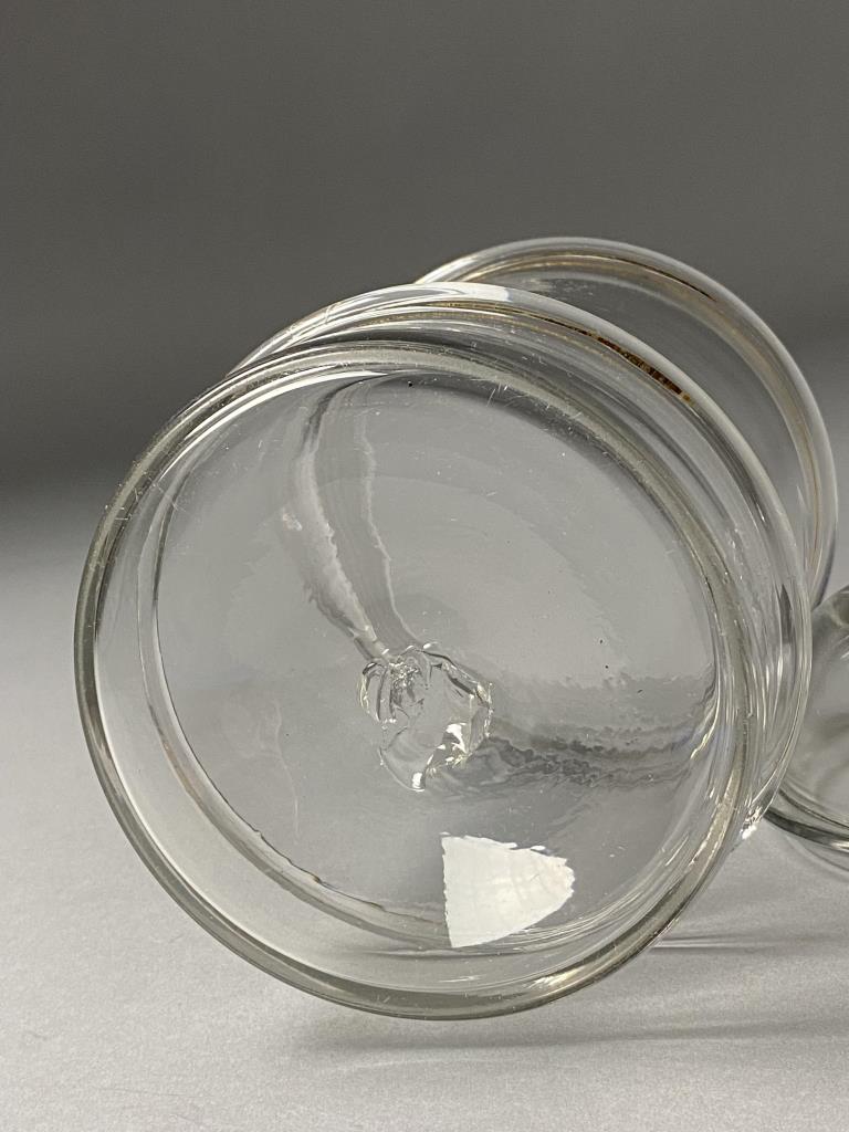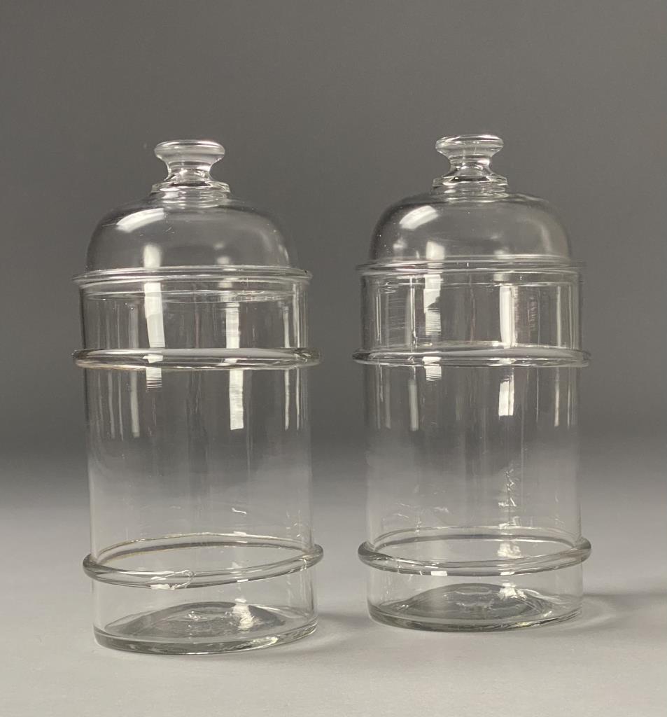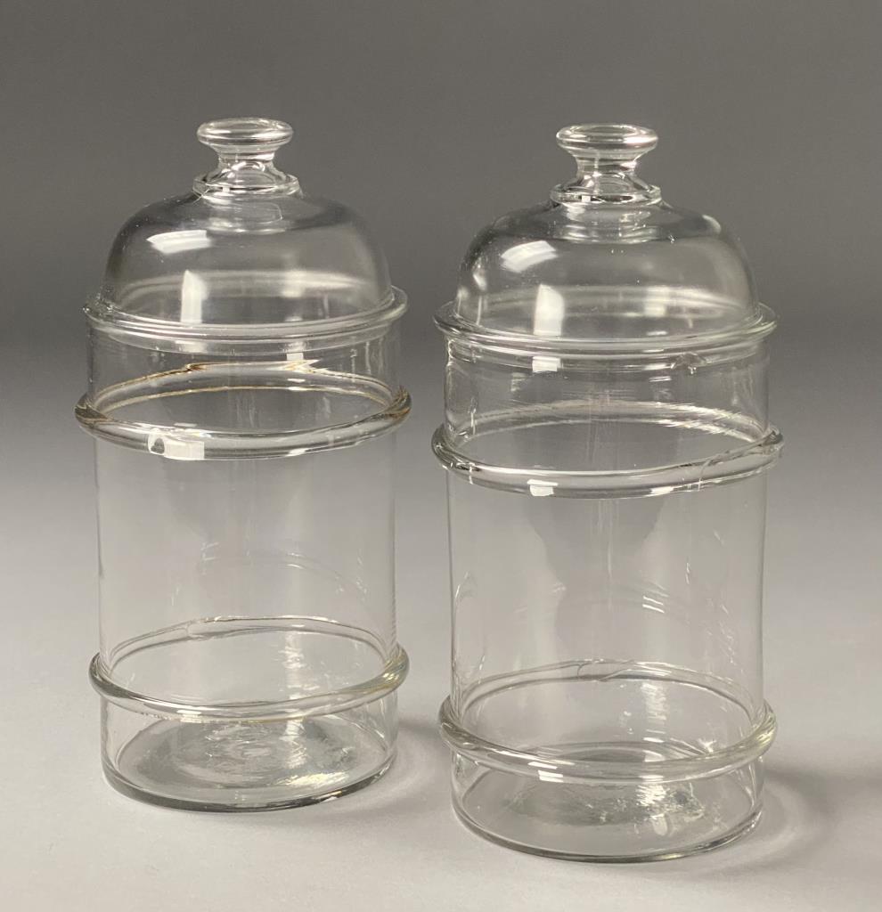 Two19th century American hand blown clear glass apothecary or druggist jars with 2 applied rings for better grip, and unground pontil marks, 5-18″ Dia. x 8″ H. Lids may be a later addition, 5-1/4″ Dia. x 3-1/2″ H.