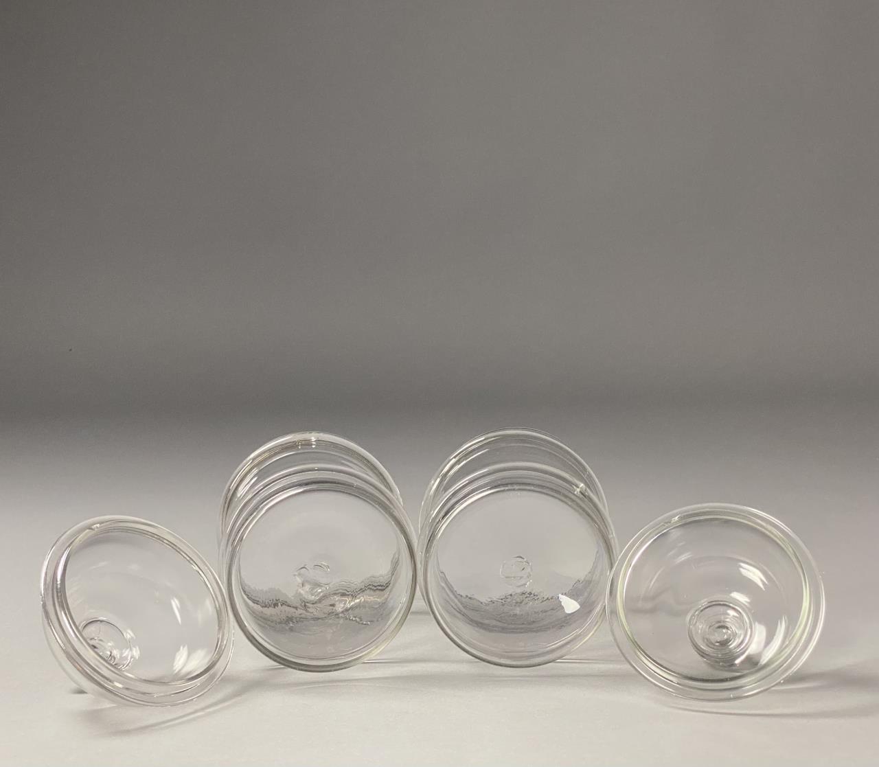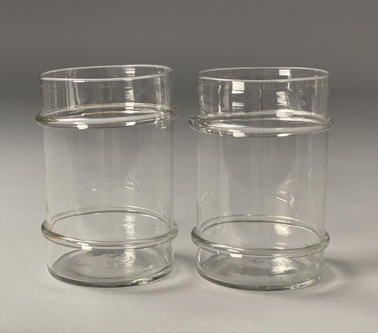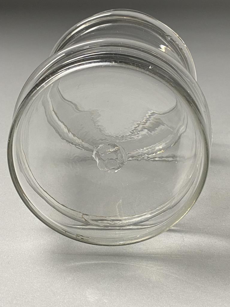Two19th century American hand blown clear glass apothecary or druggist jars with 2 applied rings for better grip, and unground pontil marks, 5-18″ Dia. x 8″ H. Lids may be a later addition, 5-1/4″ Dia. x 3-1/2″ H.