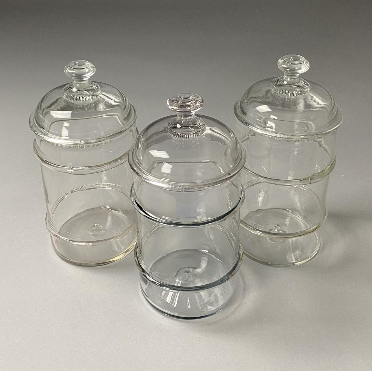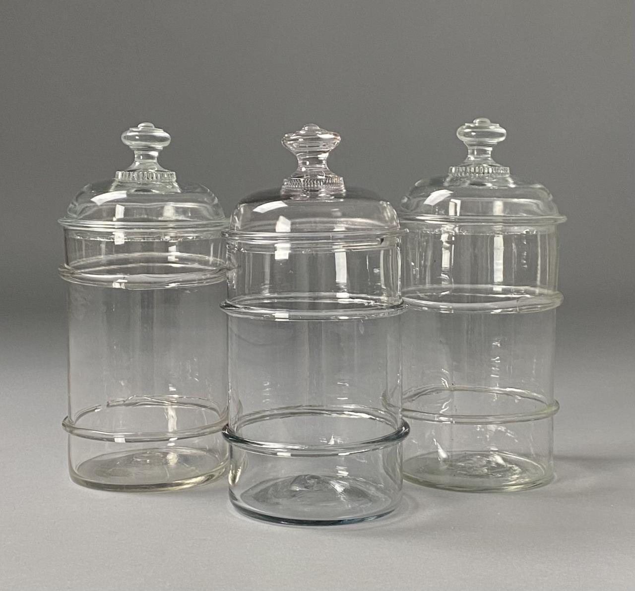 Three American Blown Glass Apothecary Jars & Lids