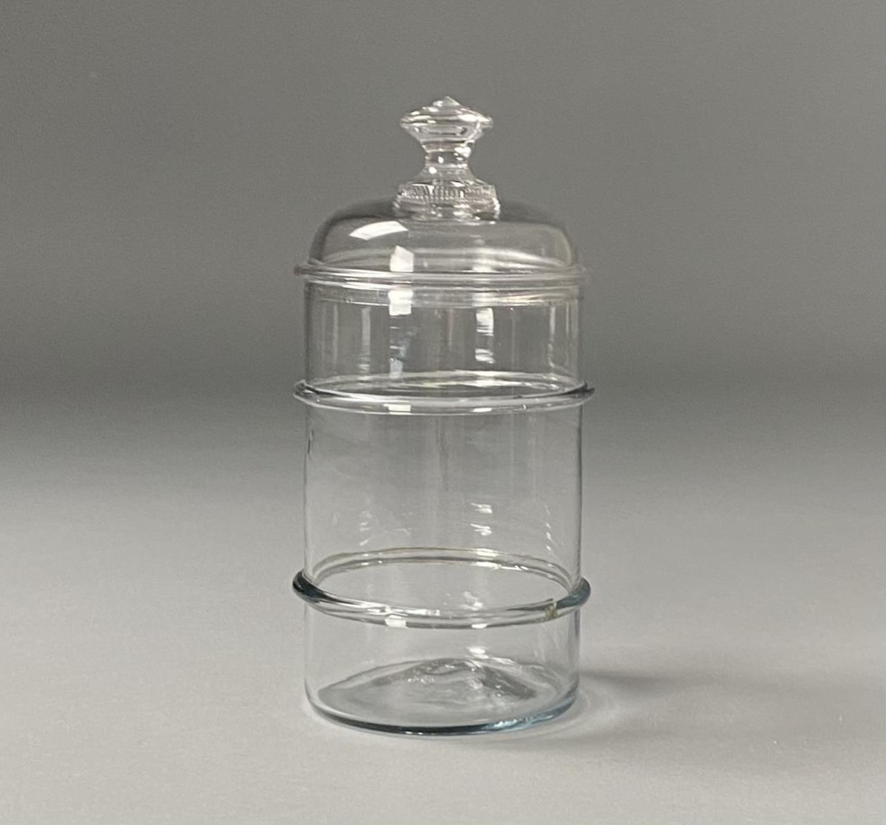 Three19th century American hand blown clear glass apothecary or druggist jars with 2 applied rings for better grip, and unground pontil marks, 5-18″ Dia. x 8″ H. Lids may be a later addition, 5-1/4″ Dia. x 3-1/2″ H.