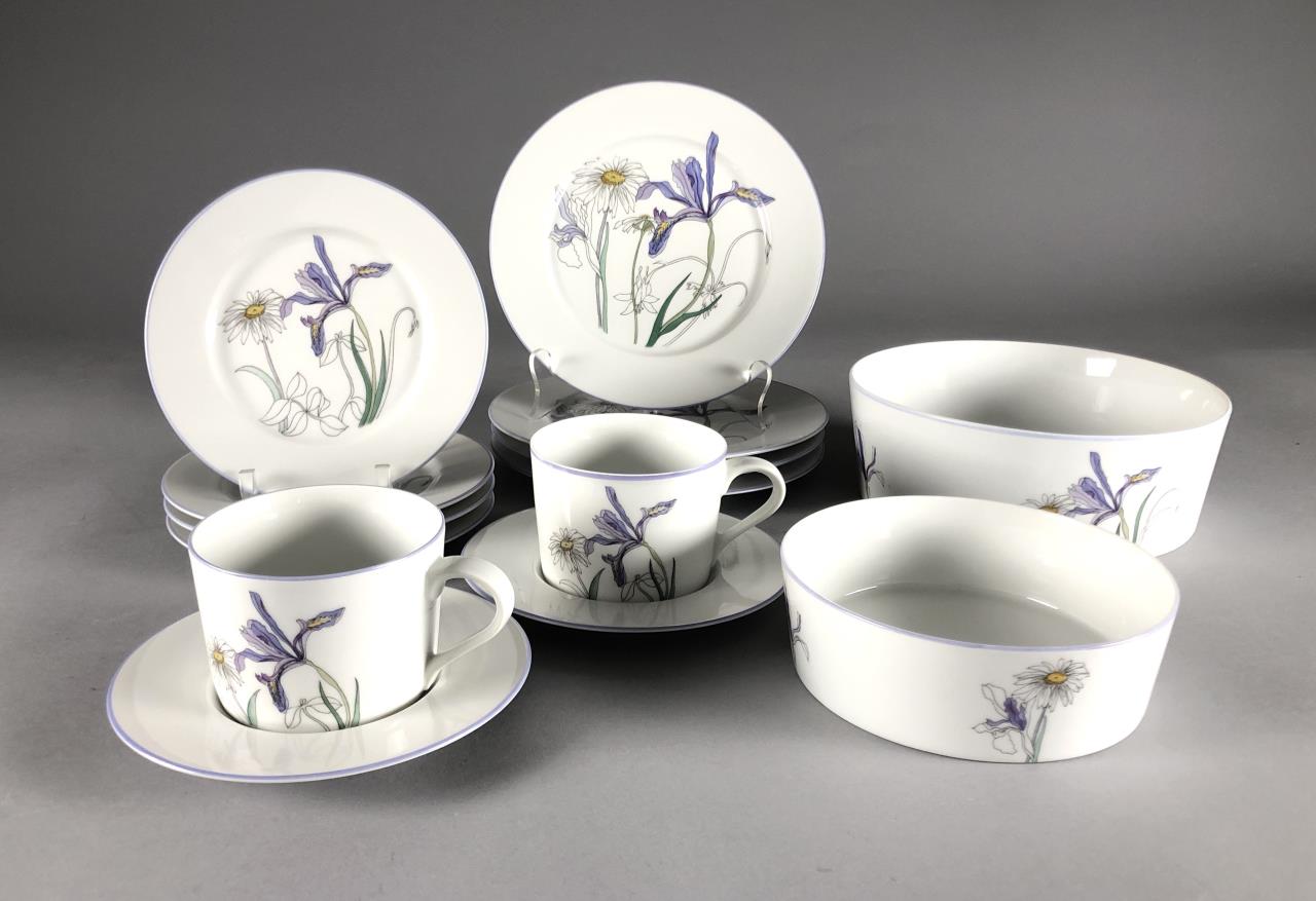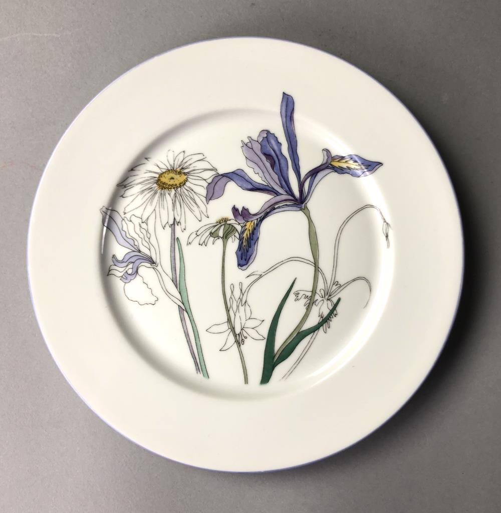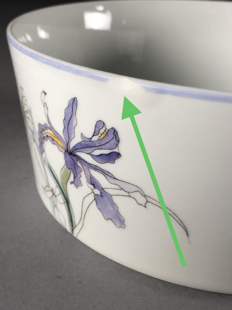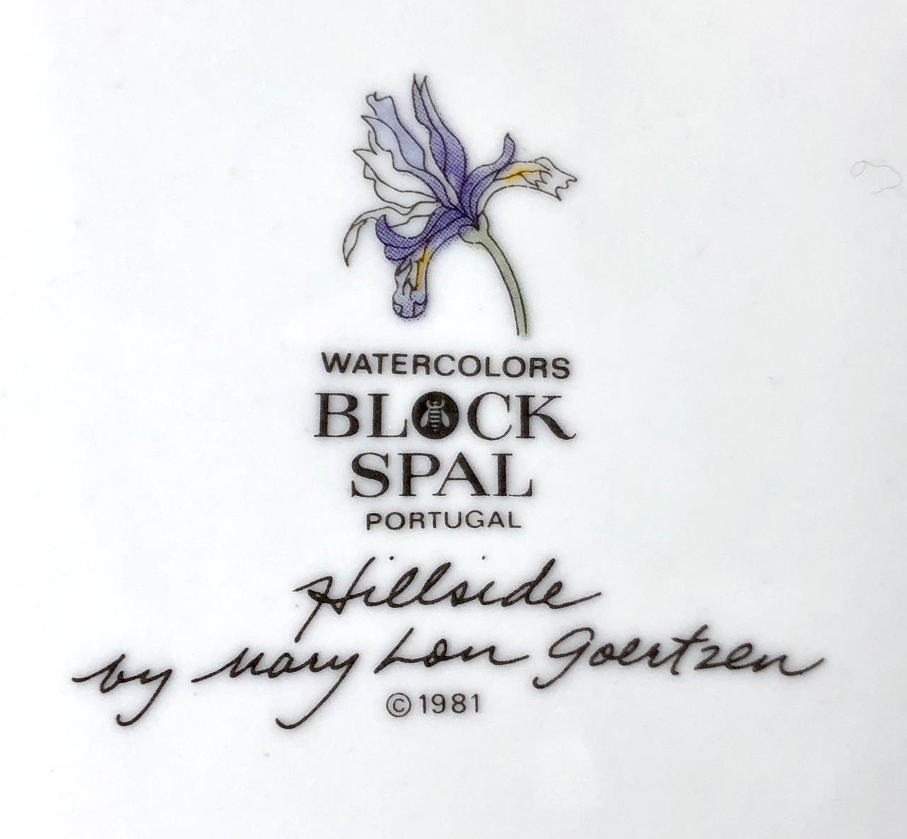 Fourteen pieces of Mid Century Modern, Block China (Portugal), in the “Hillside” pattern (introduced in 1982 and discontinued in 2000), from the Watercolors series, by Mary Lou Goertzen (American, 1929 – 2020), includes: (4) 8″ salad plates; (4) 6-3/8″ bread and butter plates; (2) flat cup and saucer sets; (1) 5-7/8″ coupe cereal bowl; and (1) 7″ (7-3/4″) round open vegetable bowl. CONDITION: Some pieces show signs of use and wear such as knife scratches and loss of pattern in some areas. There is a chip on one of the bread and butter plate and also on the 7″ round open vegetable bowl, please see last two photos. SHIPPING: In-House Shipping Available. Please read our Shipping Policies and Terms and Conditions