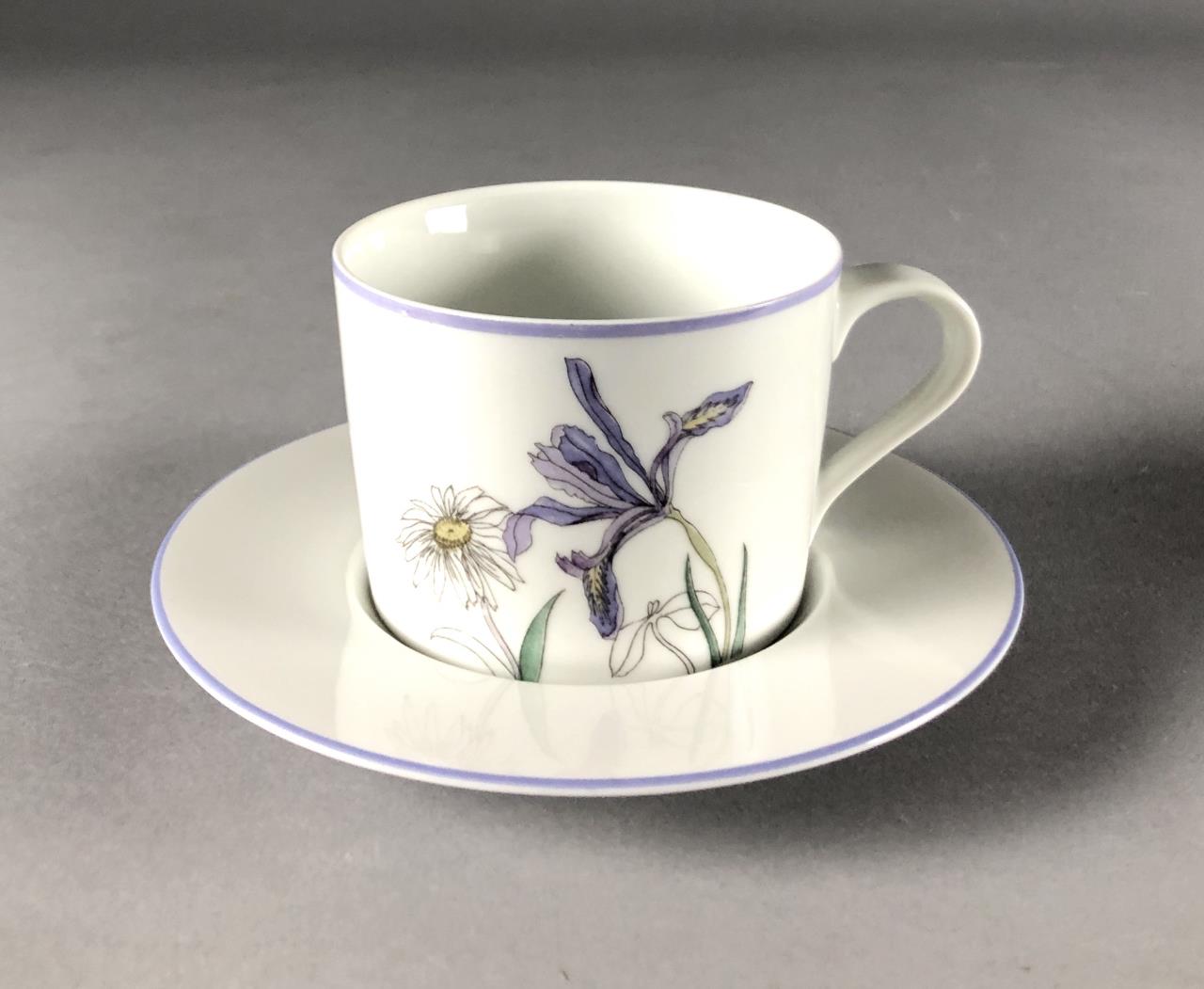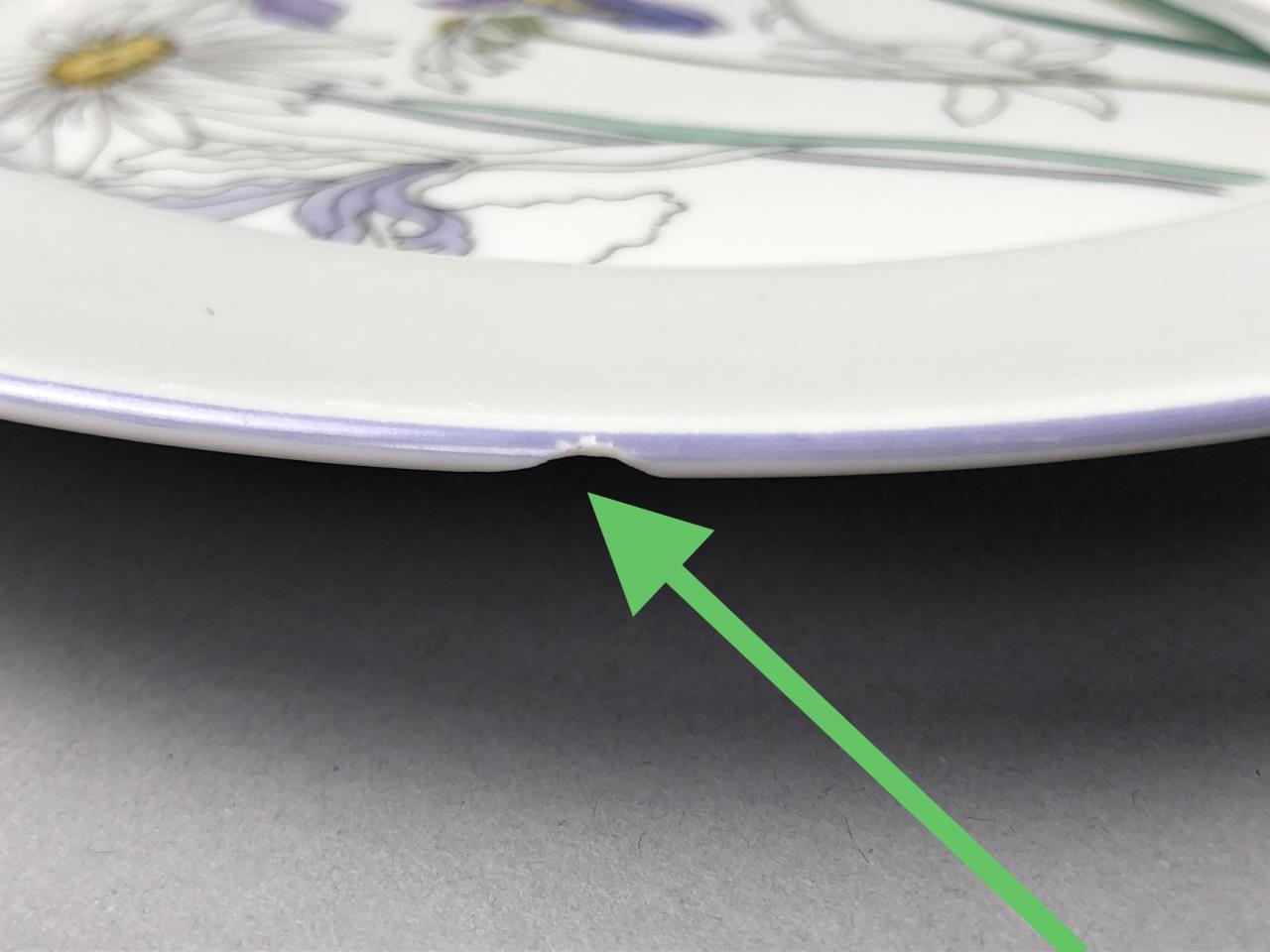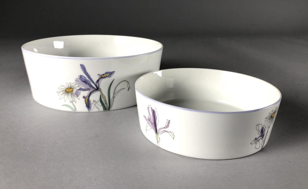 Fourteen pieces of Mid Century Modern, Block China (Portugal), in the “Hillside” pattern (introduced in 1982 and discontinued in 2000), from the Watercolors series, by Mary Lou Goertzen (American, 1929 – 2020), includes: (4) 8″ salad plates; (4) 6-3/8″ bread and butter plates; (2) flat cup and saucer sets; (1) 5-7/8″ coupe cereal bowl; and (1) 7″ (7-3/4″) round open vegetable bowl. CONDITION: Some pieces show signs of use and wear such as knife scratches and loss of pattern in some areas. There is a chip on one of the bread and butter plate and also on the 7″ round open vegetable bowl, please see last two photos. SHIPPING: In-House Shipping Available. Please read our Shipping Policies and Terms and Conditions