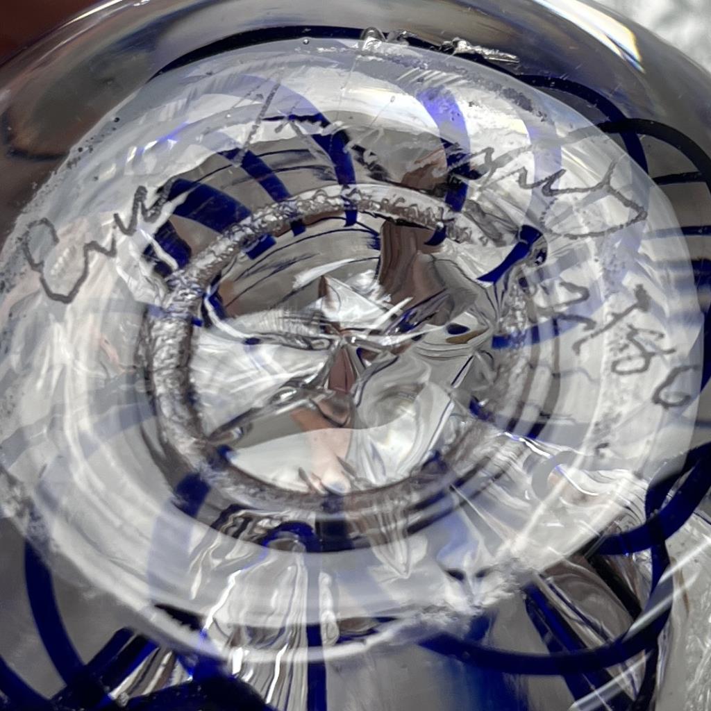 Cobalt swirl art glass paperweight, Eric Harrall Kvarnes (America, 1952-2018), etched signature on bottom as well as date “2/80,” approximately 3″ (D). CONDITION: Two possible small internal fractures towards base, please see photos. SHIPPING: In-House Shipping Available. Please read our Shipping Policies and Terms and Conditions