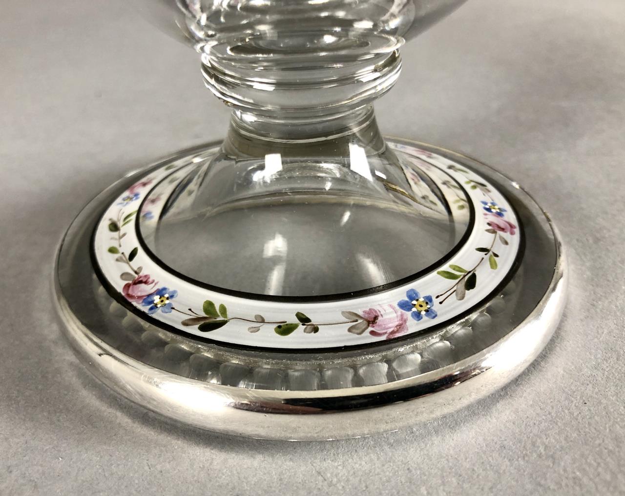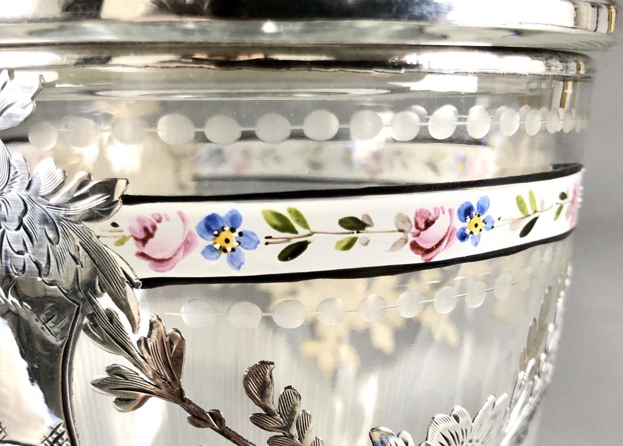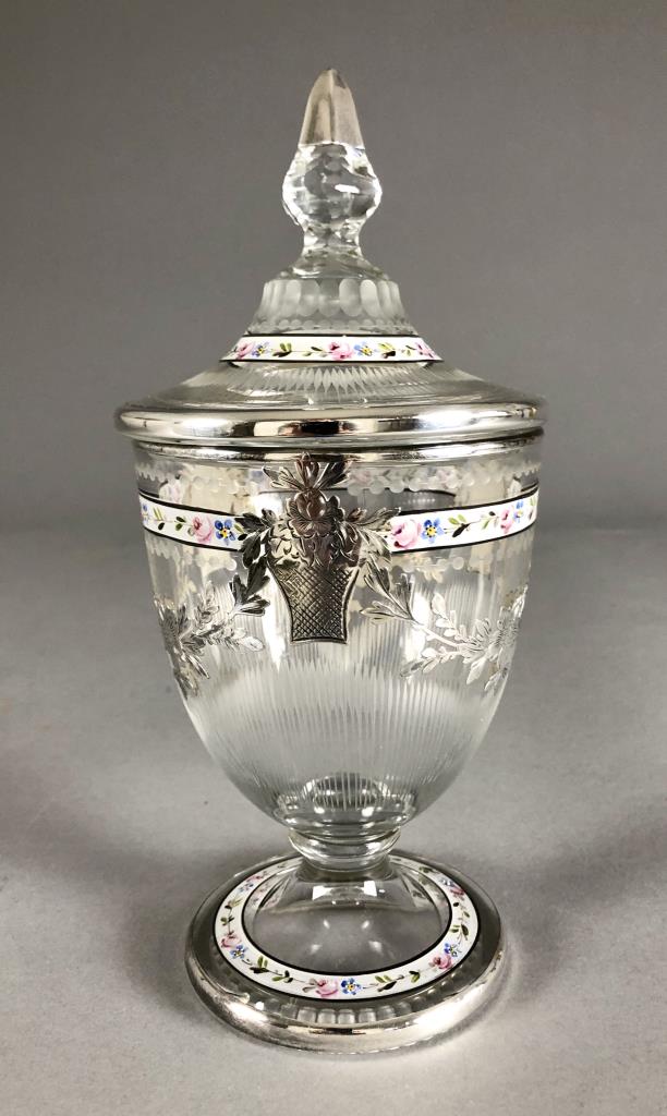 Heisey Enameled & Sterling Overlay Candy Jar w Lid