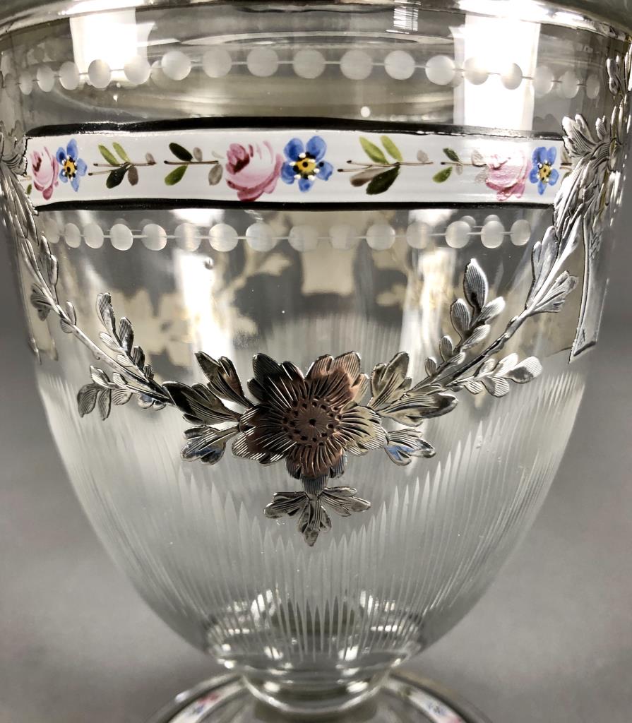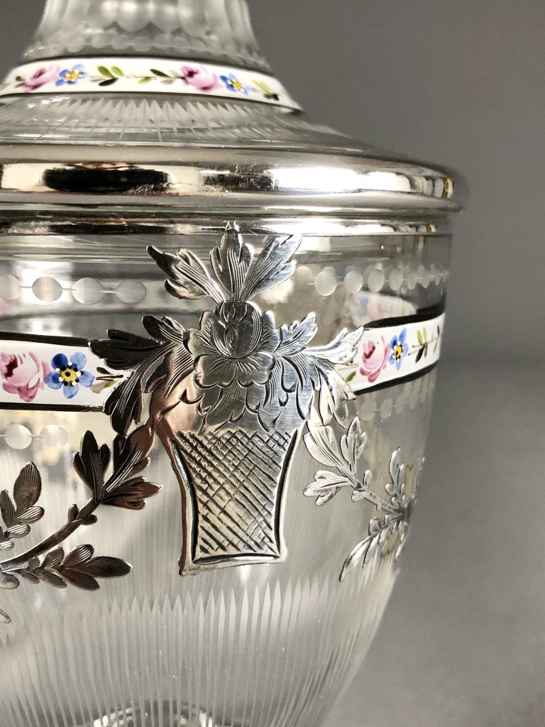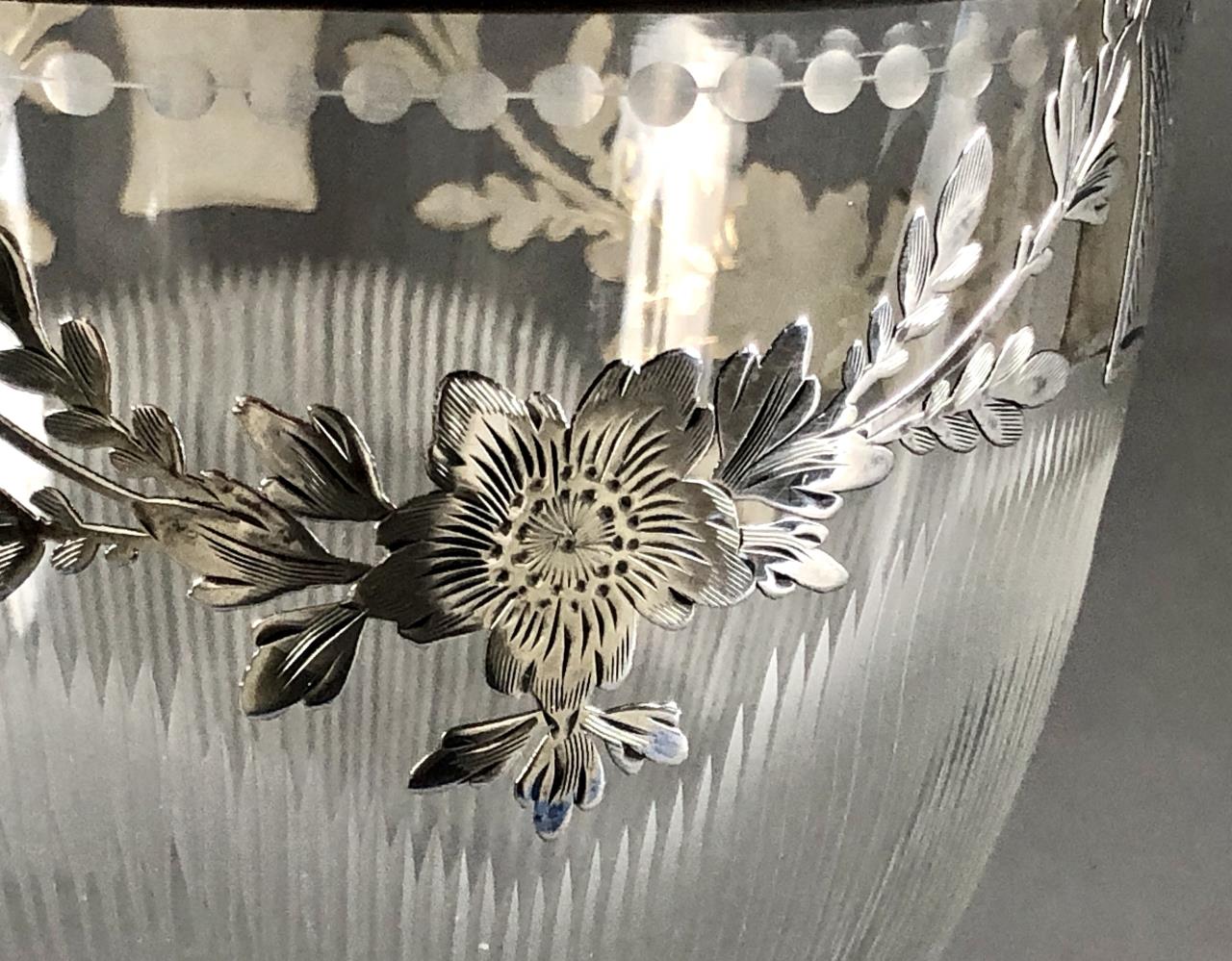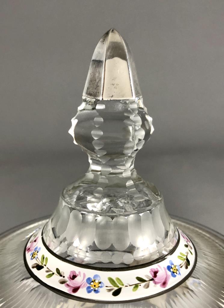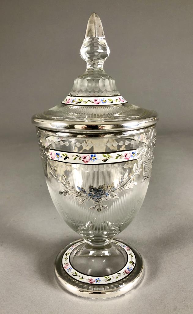 Heisey Glass Company (Newark, Ohio), cut glass lidded candy jar, with enameled and sterling silver overlay of floral garlands, the cutting may possibly be attributed to Emil Krall and the sterling overlay to the RS Sterling Company, circa 1930s, approximately 9″ H. CONDITION: SHIPPING: In-House Shipping Available. Please read our Shipping Policies and Terms and Conditions