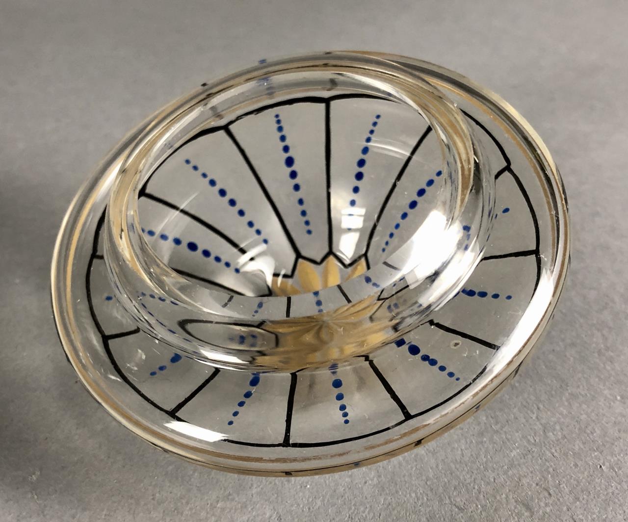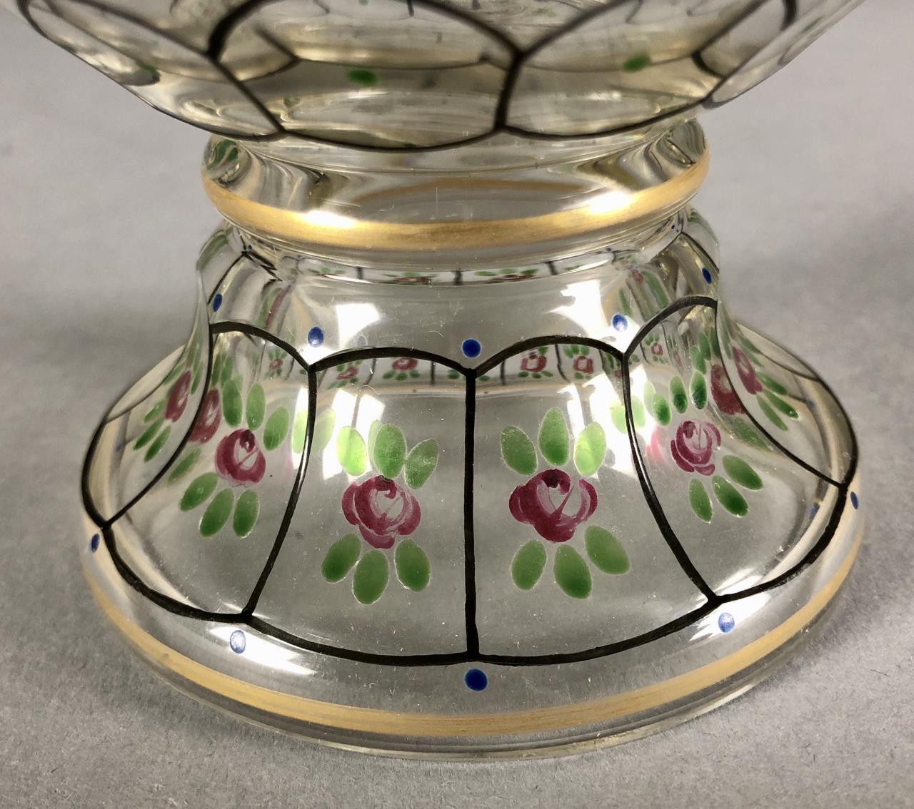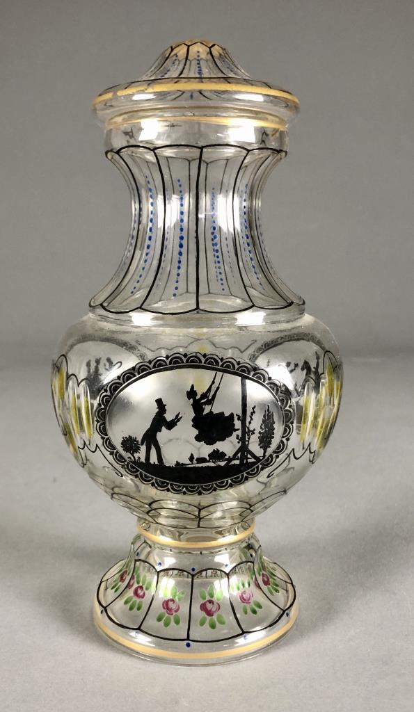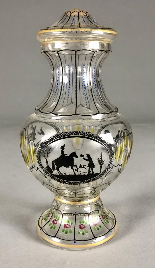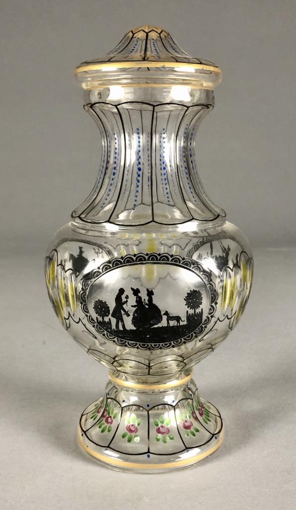 Antique lidded and footed jar, of a bulbous form, hand cut and hand painted or enameled decoration, attributed to Glasraffinerie Friedrich Pietsch Steinschonau (Bohemia / Czech Republic), circa 1910 – 1920, approximately 8-1/2″ H. CONDITION: SHIPPING: In-House Shipping Available. Please read our Shipping Policies and Terms and Conditions