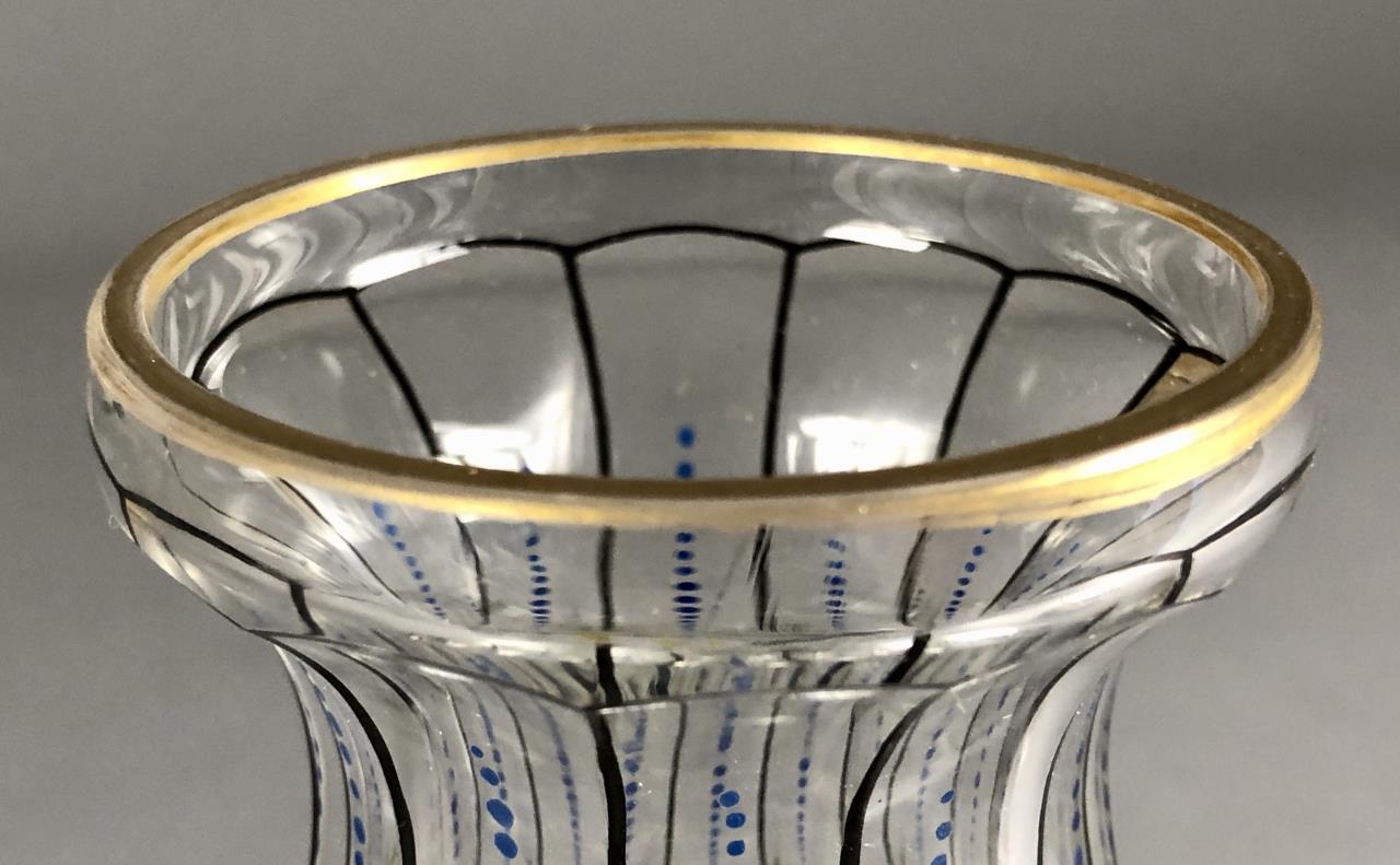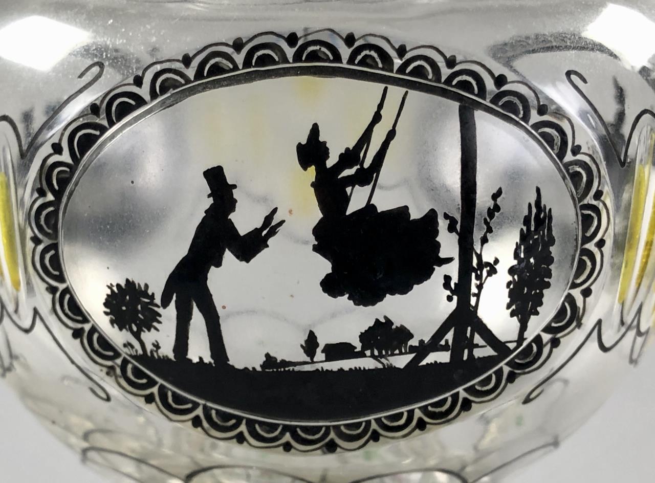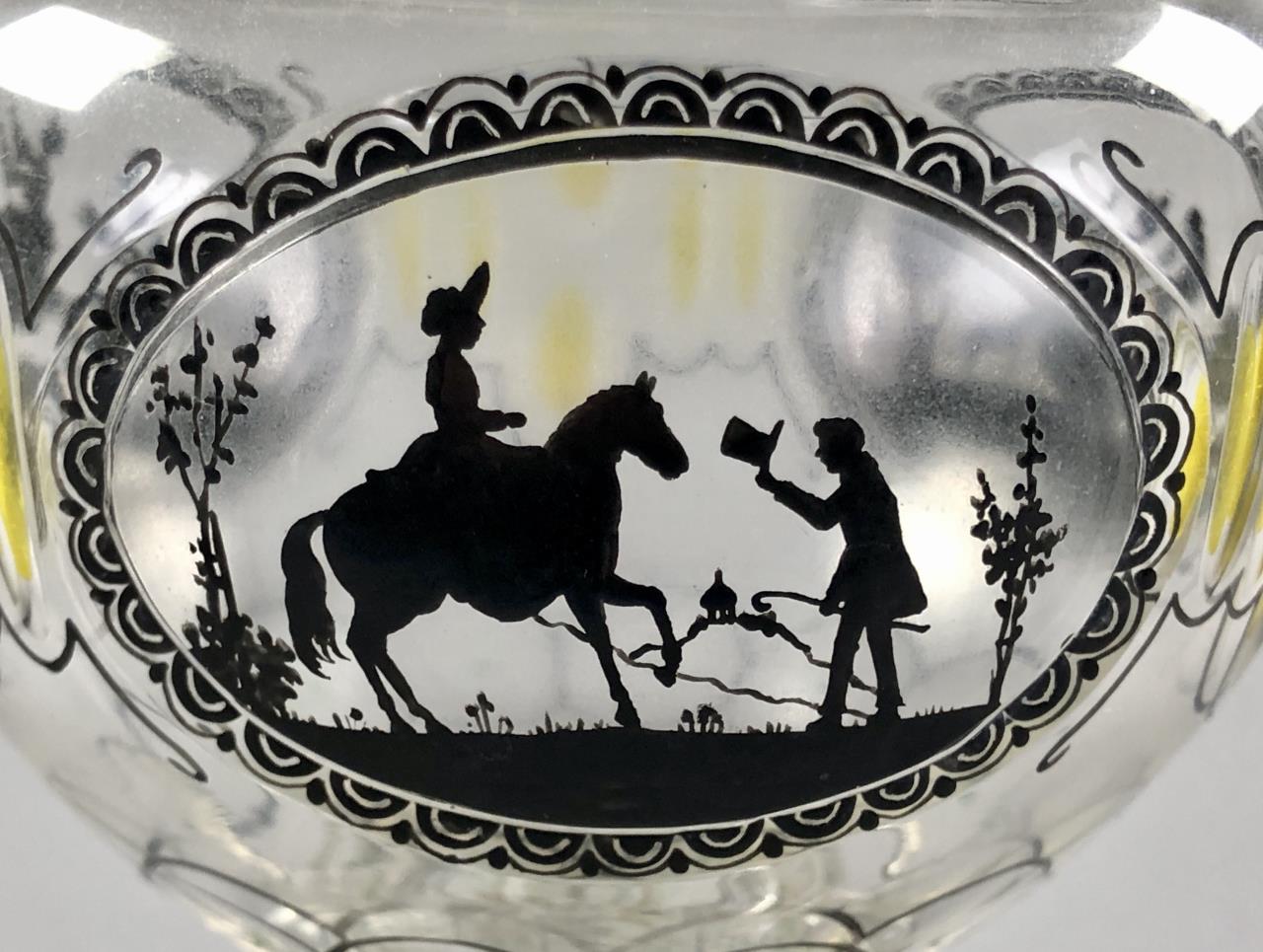 Antique lidded and footed jar, of a bulbous form, hand cut and hand painted or enameled decoration, attributed to Glasraffinerie Friedrich Pietsch Steinschonau (Bohemia / Czech Republic), circa 1910 – 1920, approximately 8-1/2″ H. CONDITION: SHIPPING: In-House Shipping Available. Please read our Shipping Policies and Terms and Conditions