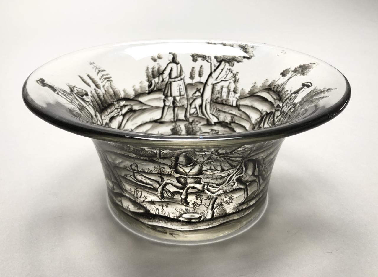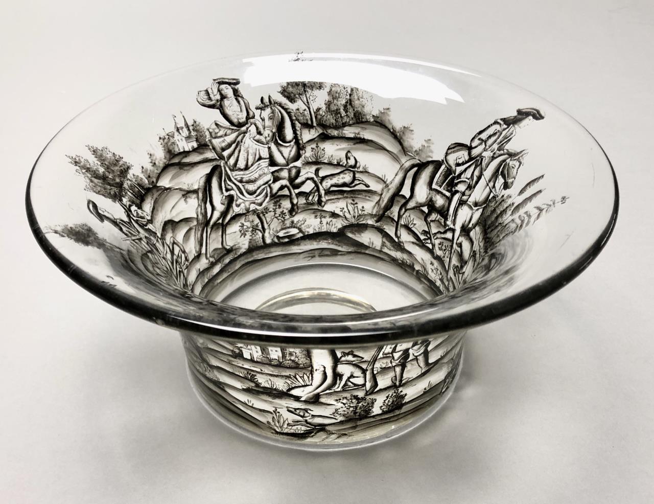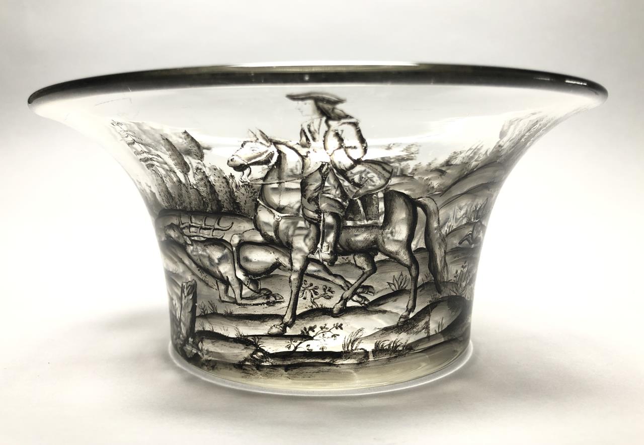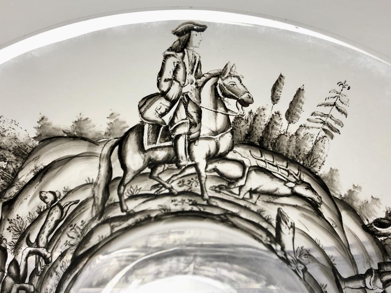 Antique Schwarzlot wine coaster, or bowl, enameled hand painted glass, depicting a hunting scene with a stag and riders on horses, attributed to Josef Lenhardt, Steinschonau, circa late 19th Century, approximately 7-1/2″ D x 3-1/2″ H. CONDITION: One minor chip on the rim. SHIPPING: In-House Shipping Available. Please read our Shipping Policies and Terms and Conditions