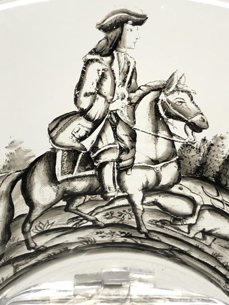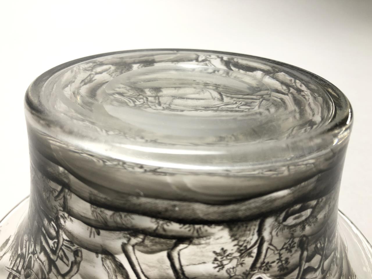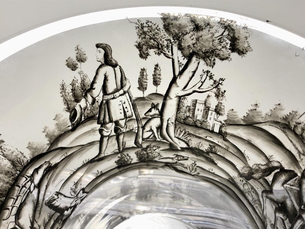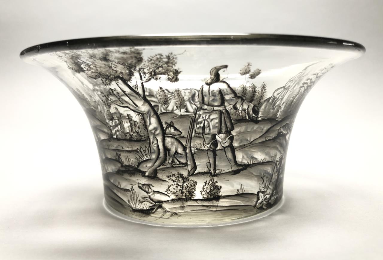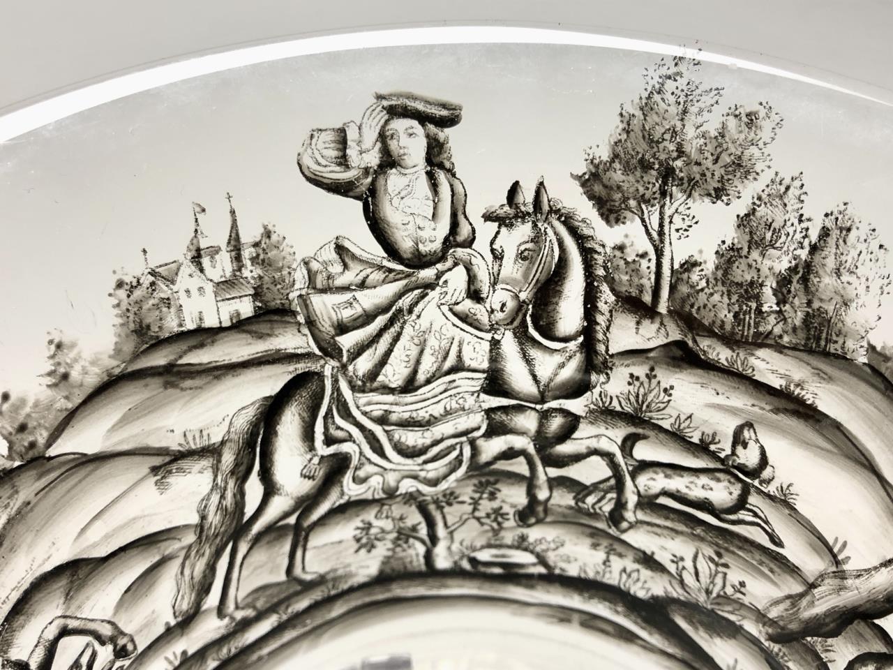 Antique Schwarzlot wine coaster, or bowl, enameled hand painted glass, depicting a hunting scene with a stag and riders on horses, attributed to Josef Lenhardt, Steinschonau, circa late 19th Century, approximately 7-1/2″ D x 3-1/2″ H. CONDITION: One minor chip on the rim. SHIPPING: In-House Shipping Available. Please read our Shipping Policies and Terms and Conditions