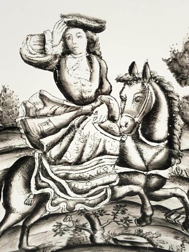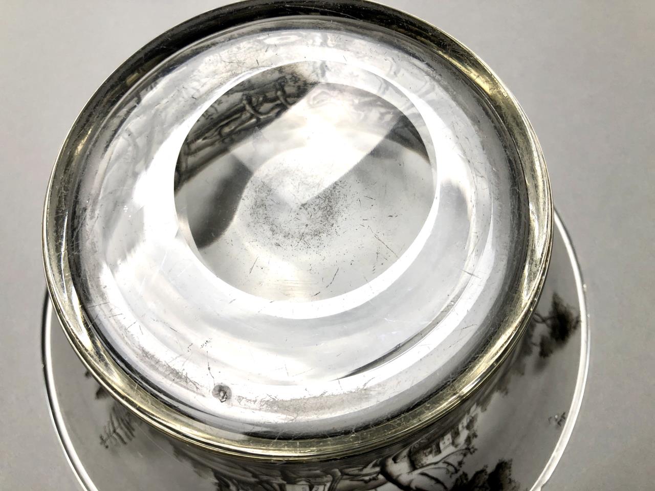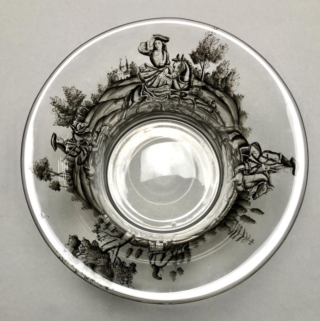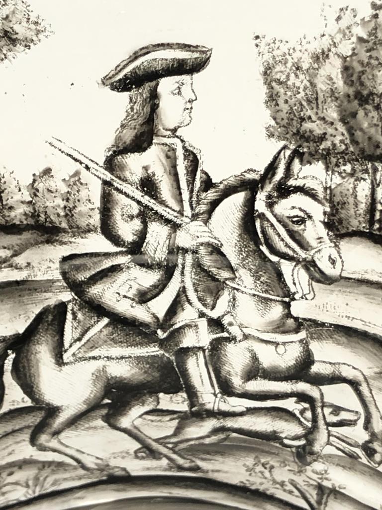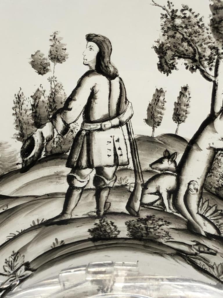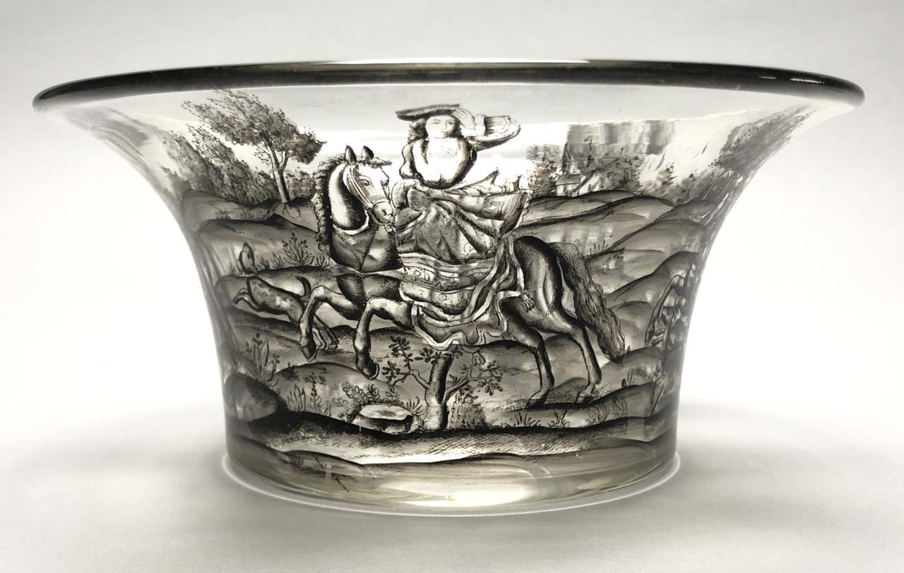 Antique Schwarzlot wine coaster, or bowl, enameled hand painted glass, depicting a hunting scene with a stag and riders on horses, attributed to Josef Lenhardt, Steinschonau, circa late 19th Century, approximately 7-1/2″ D x 3-1/2″ H. CONDITION: One minor chip on the rim. SHIPPING: In-House Shipping Available. Please read our Shipping Policies and Terms and Conditions