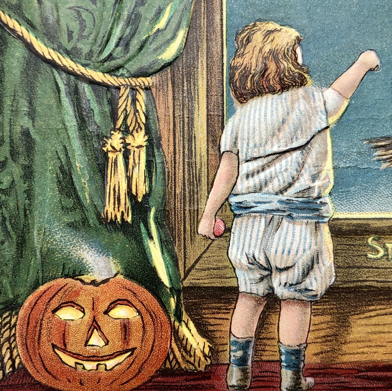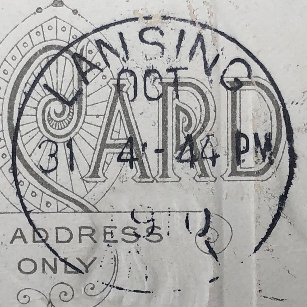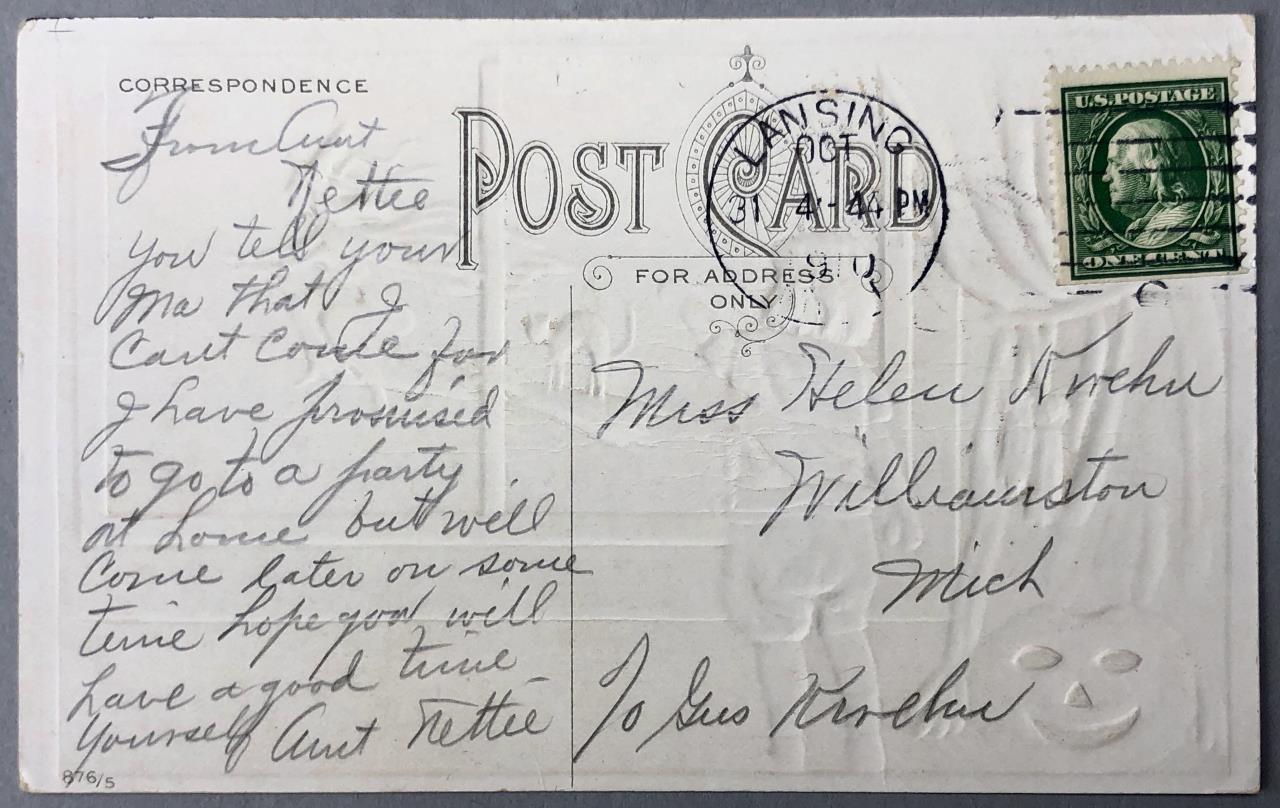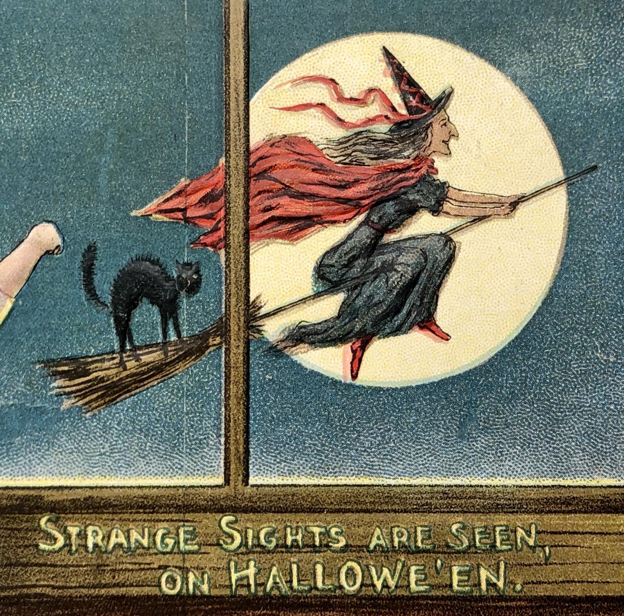 Antique embossed divided Halloween postcard, “Strange Sights are Seen, on Hallowe’en,” featuring a jack-o’-lantern, and a witch and a black cat on a broom silhouetted against a full moon, postmarked 1910 from Lansing Michigan. CONDITION: SHIPPING: In-House Shipping Available. Please read our Shipping Policies and Terms and Conditions