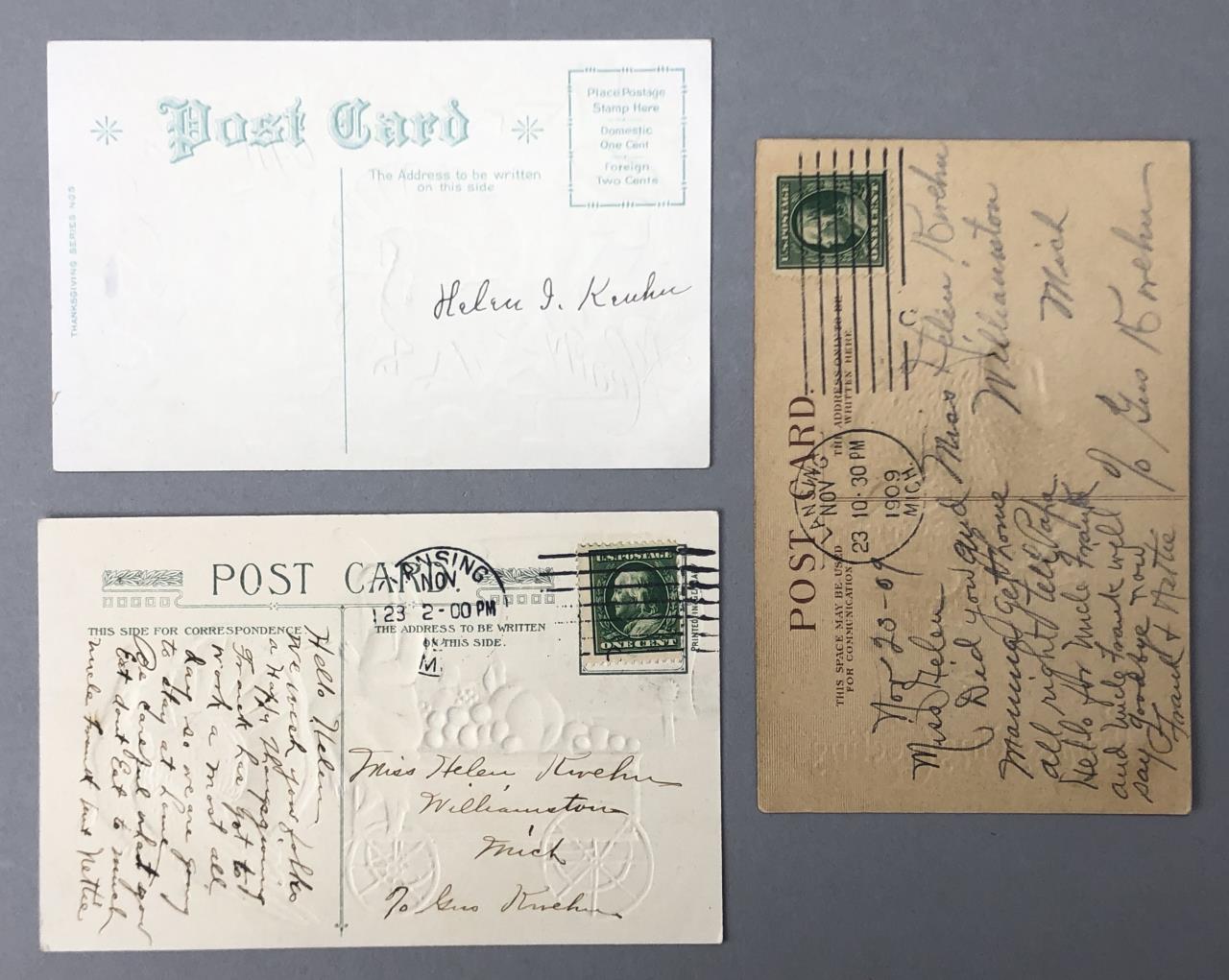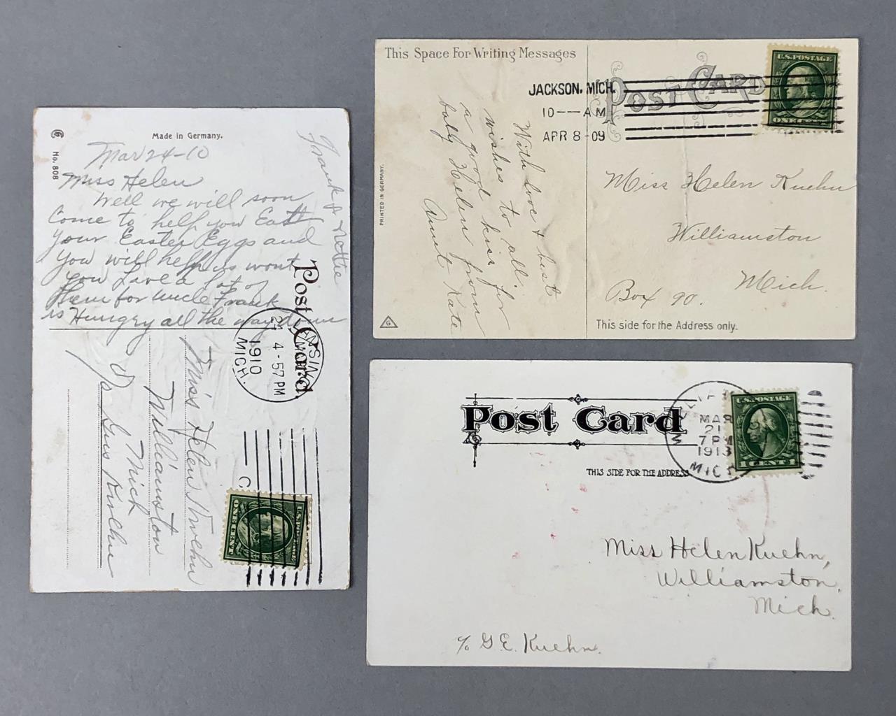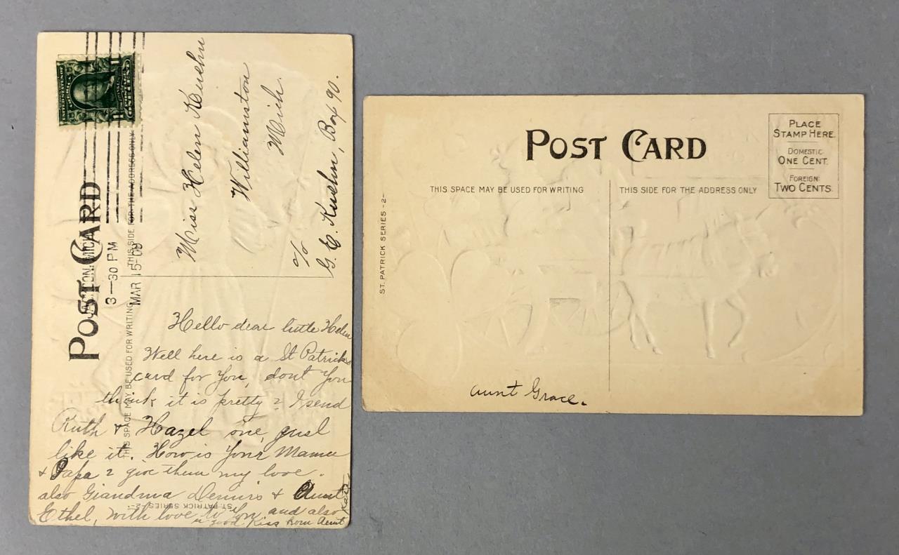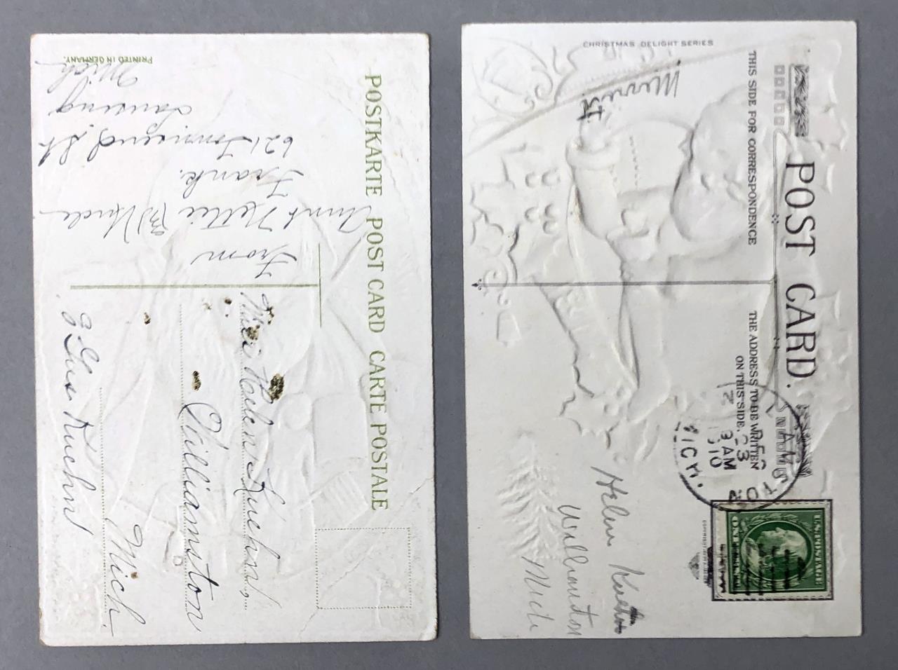 Collection of 12 antique holiday postcards. Includes: (2) Saint Patrick’s Day; (3) Easter; (1) patriotic Memorial Day; (3) Thanksgiving; (2) Christmas with Santas; and (1) Black memorabilia or Black Americana New Year’s. Postmarked between 1908 and 1913 and from various Michigan cities and towns including Jackson, Williamston, Grand Rapids, and Lansing. CONDITION: Condition varies, please see photos. SHIPPING: In-House Shipping Available. Please read our Shipping Policies and Terms and Conditions