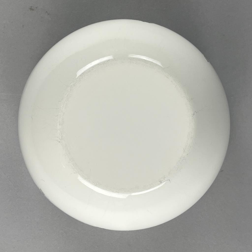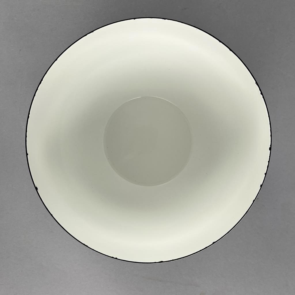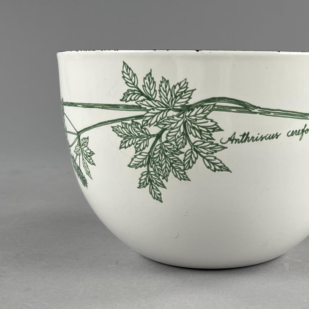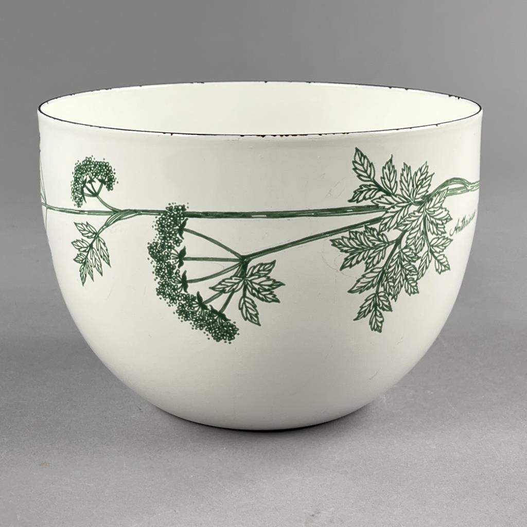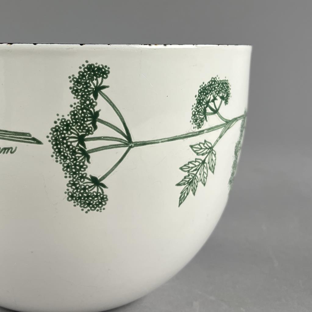 Mid Century Modern serving or mixing bowl from Finel Arabia (Finland), designed by Kaj Franck (Finnish, 1911-1989), featuring a botanical motif in green of Anthriscus cerefolium, also known as chervil, on white enameled steel, circa 1960s, 5-1/2″ (H) x 8-1/4″ (D). CONDITION: Some minor chipping to the enamel on rim and some minor surface scratches and wear commensurate with age and use. SHIPPING: In-House Shipping Available. Please read our Shipping Policies and Terms and Conditions