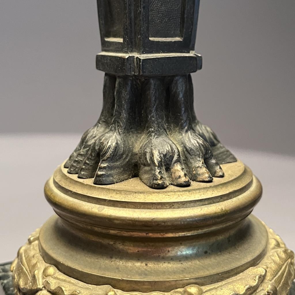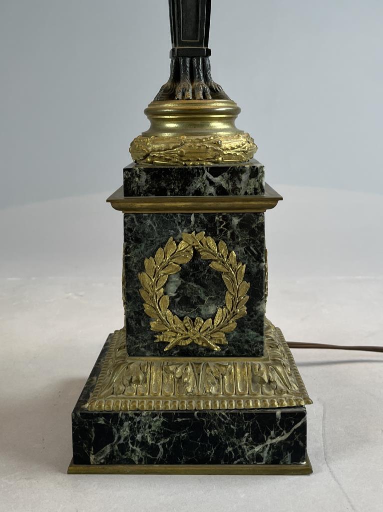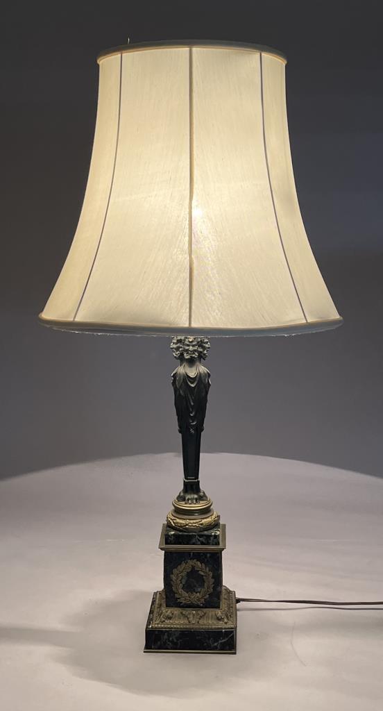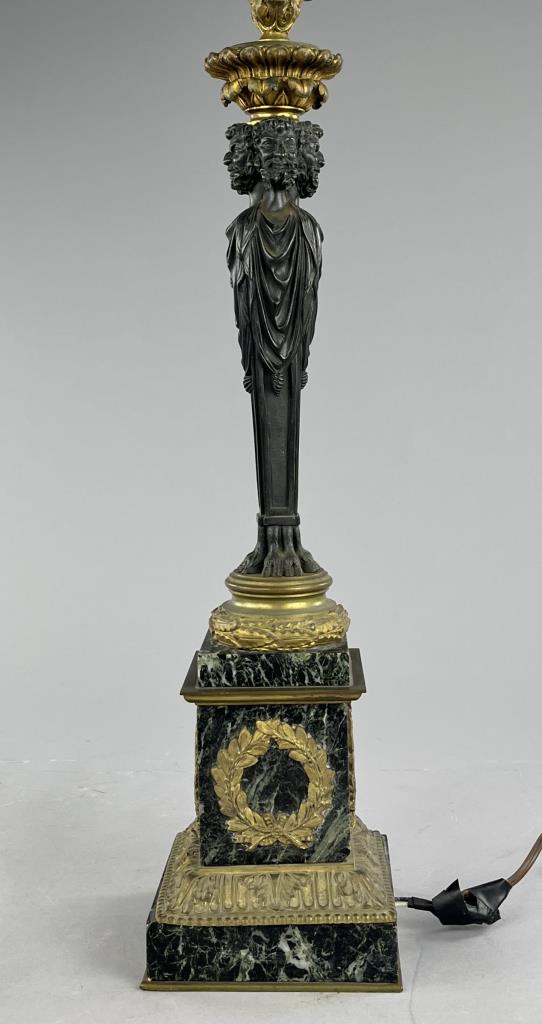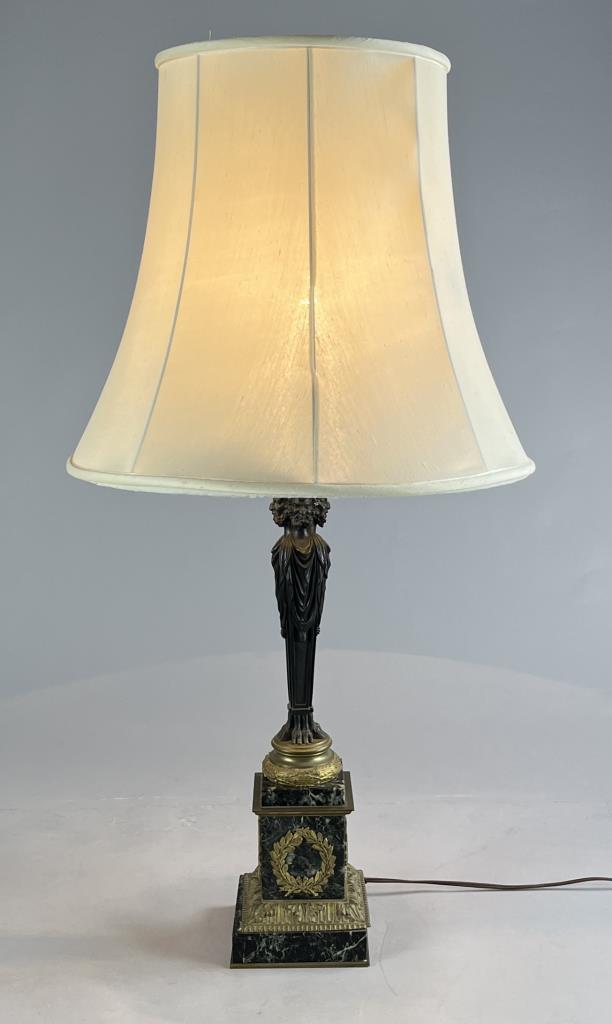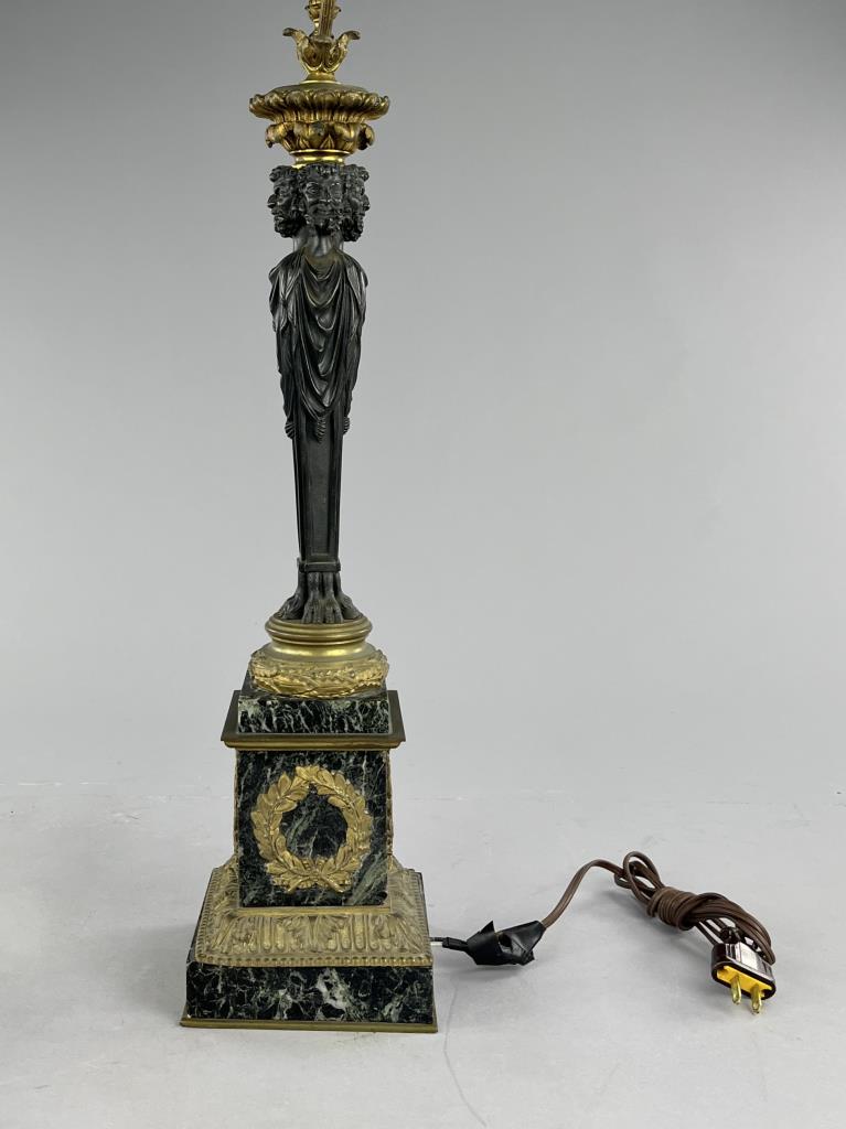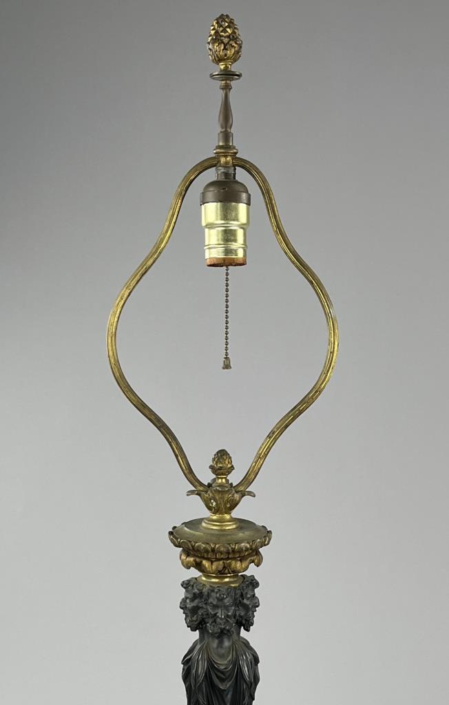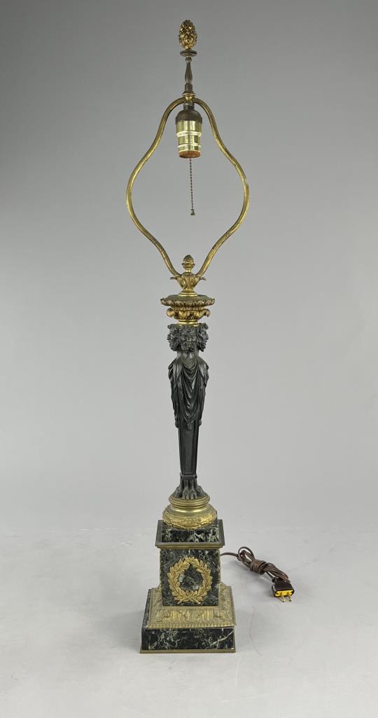 Neoclassical style table lamp, with Atlantis figures and laurel wreaths, marble and bronze dore, circa early to mid 20th Century, 36″ to top finial CONDITION: Working at time of cataloguing. Some elements of the lamp are loose. SHIPPING: Local pick-up or third party shipping only for this lot. Please see the Shipping Policy for information on suggested shippers. We recommend the Pak Mail Store of Battle Creek to assist you. Please contact the shipper of your choice for shipping estimates on this lot. Refer to the Shipping section in our full Terms and Conditions for all information on shipping.