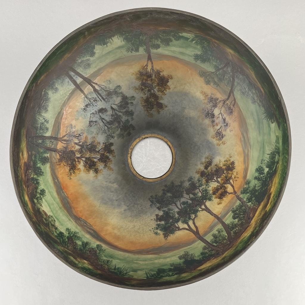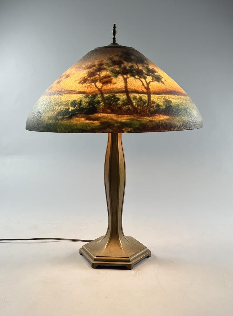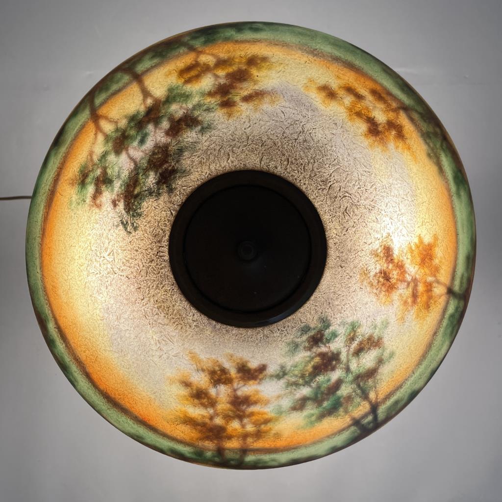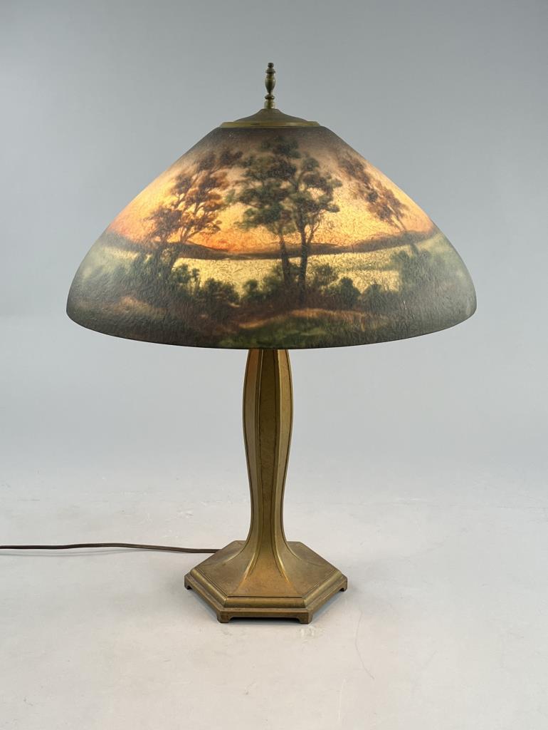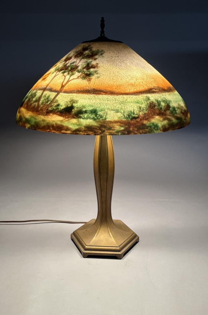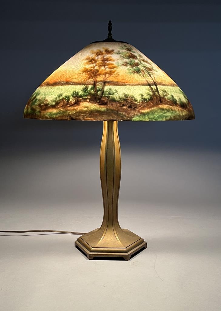 Jefferson Glass Company (Follansbee, West Virginia), Arts and Crafts Period table lamp #1896, with a domed reverse painted glass shade depicting a landscape with silhouette trees in the foreground and water and mountains in the background, over a hexagonal painted metal base with two pull-chain sockets, signed on inside of shade “1896 Jefferson Co”, circa 1910-1920, 18″ (D) x 25 (H). CONDITION: Please Refer to Photos and Description for Condition. SHIPPING: In-House Shipping is available on this item. PLEASE read our Shipping Policies and our full Terms and Conditions prior to bidding.