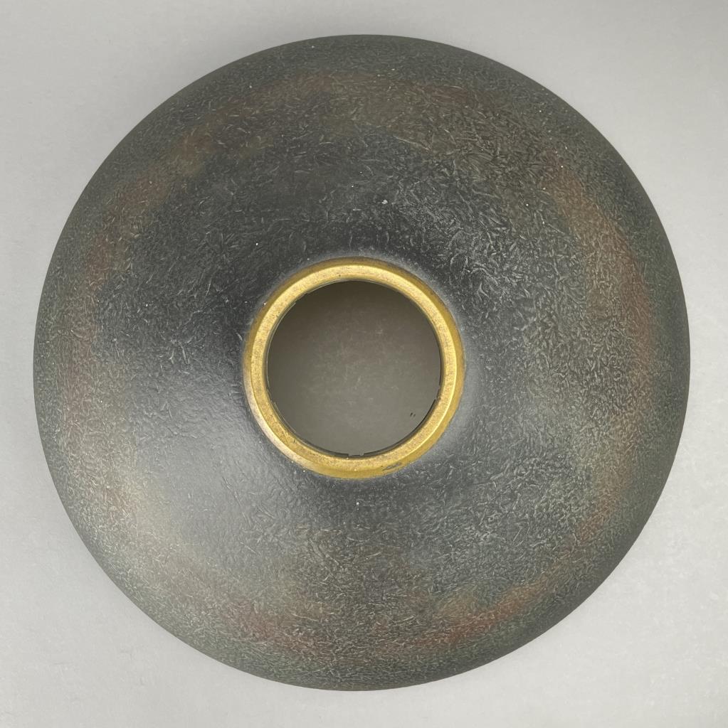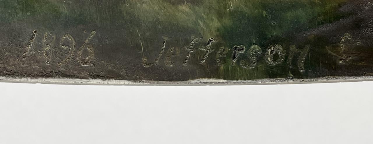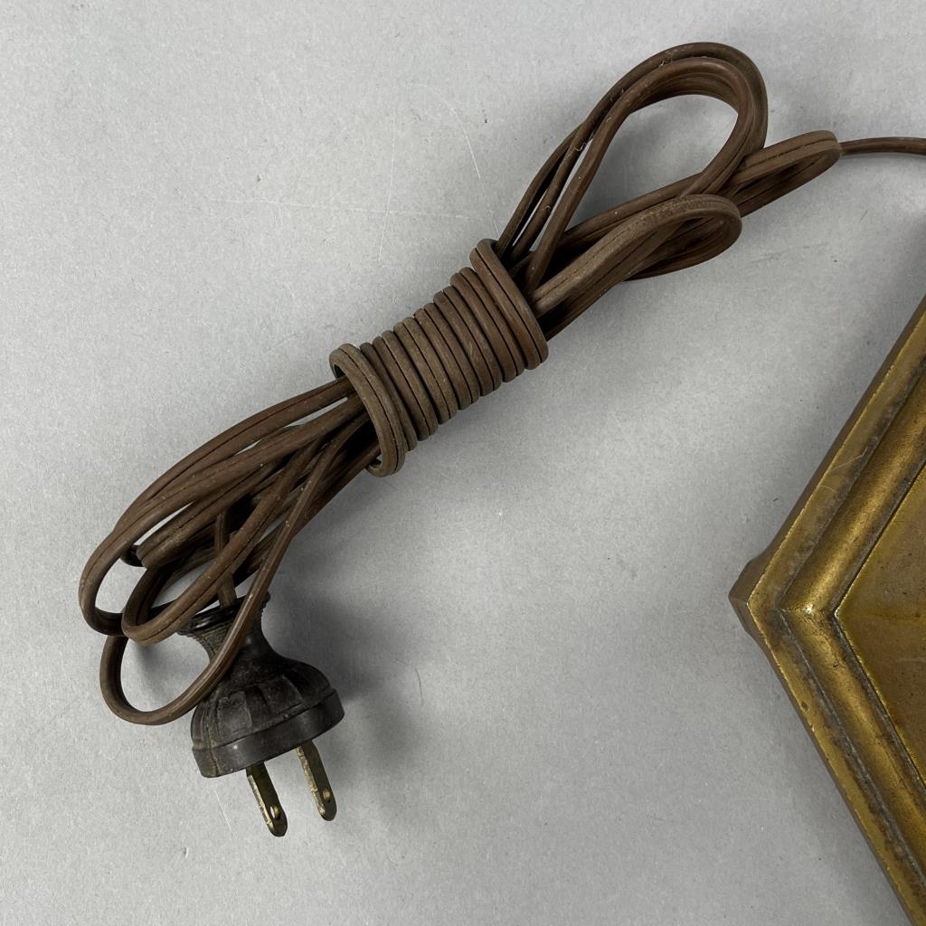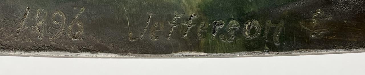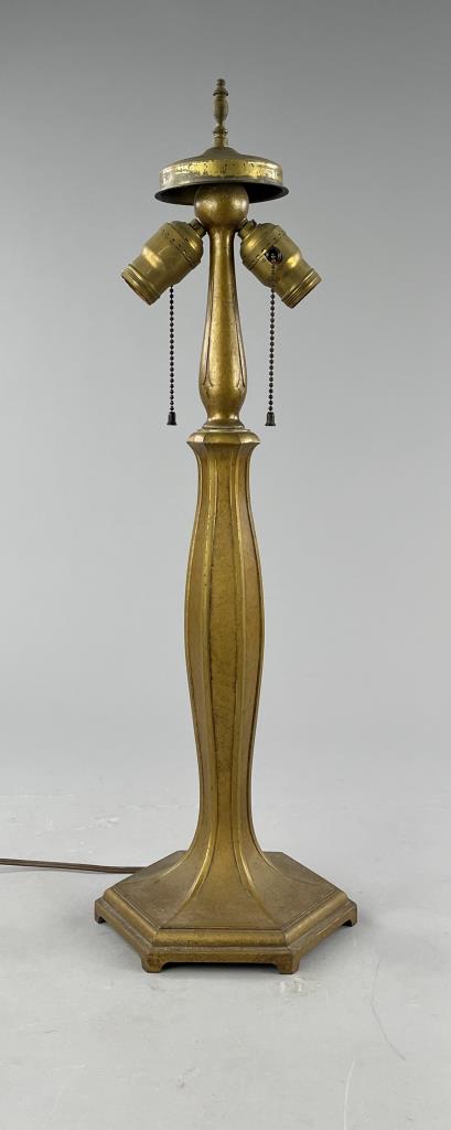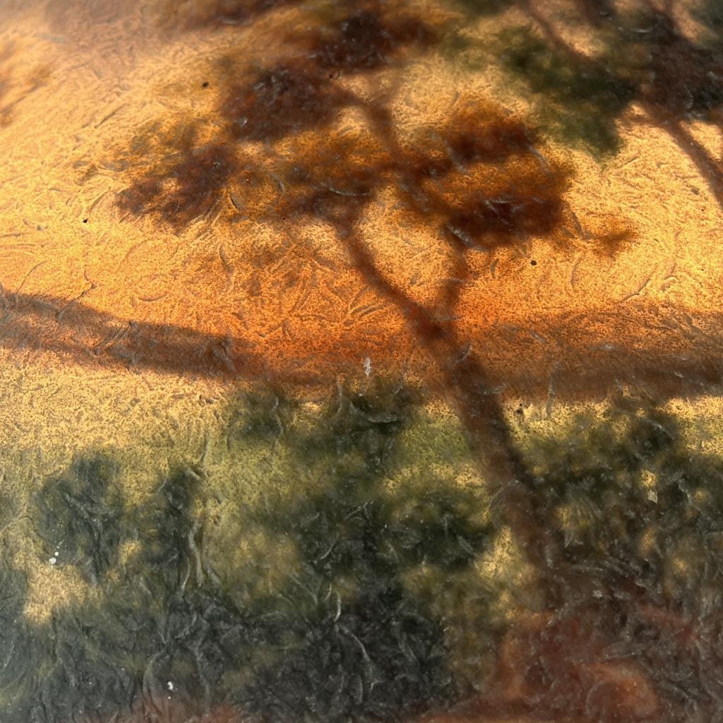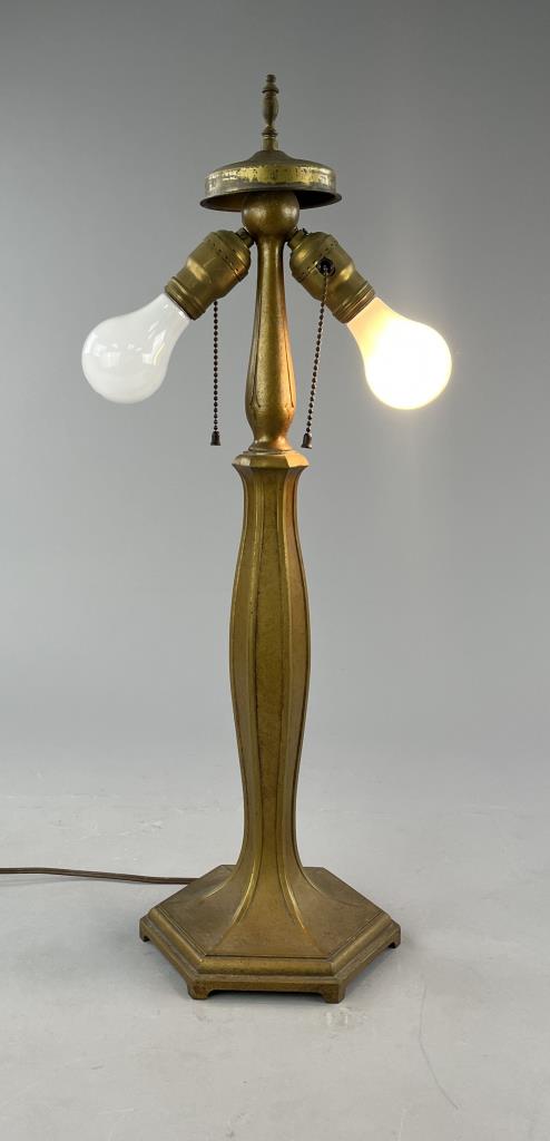 Jefferson Glass Company (Follansbee, West Virginia), Arts and Crafts Period table lamp #1896, with a domed reverse painted glass shade depicting a landscape with silhouette trees in the foreground and water and mountains in the background, over a hexagonal painted metal base with two pull-chain sockets, signed on inside of shade “1896 Jefferson Co”, circa 1910-1920, 18″ (D) x 25 (H). CONDITION: Please Refer to Photos and Description for Condition. SHIPPING: In-House Shipping is available on this item. PLEASE read our Shipping Policies and our full Terms and Conditions prior to bidding.