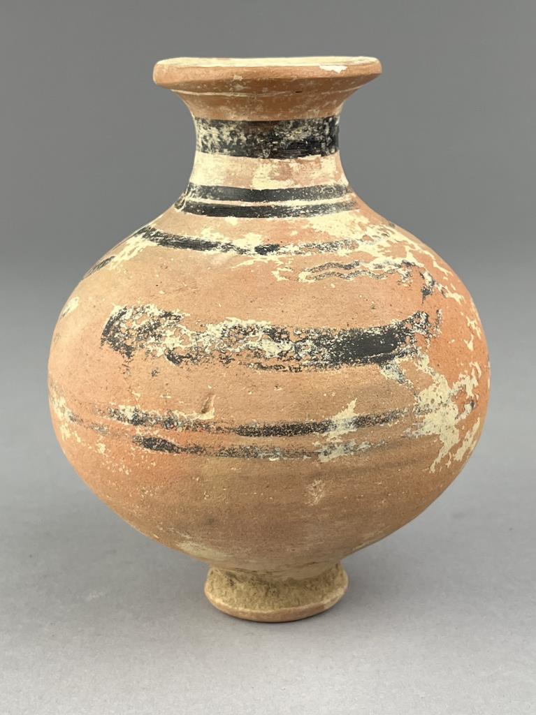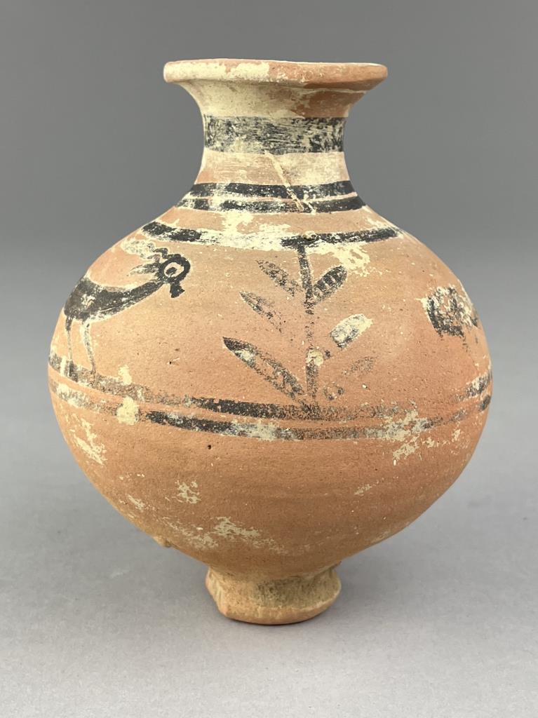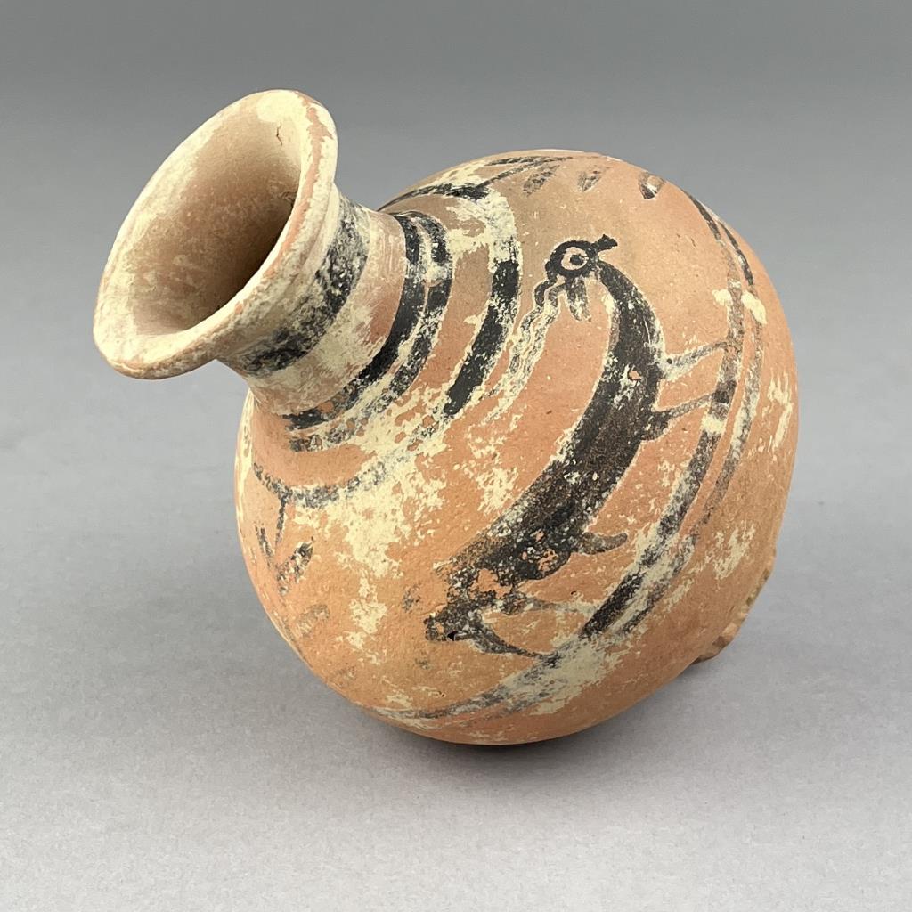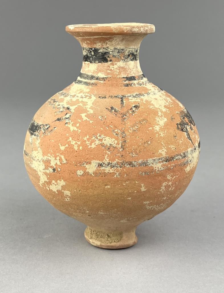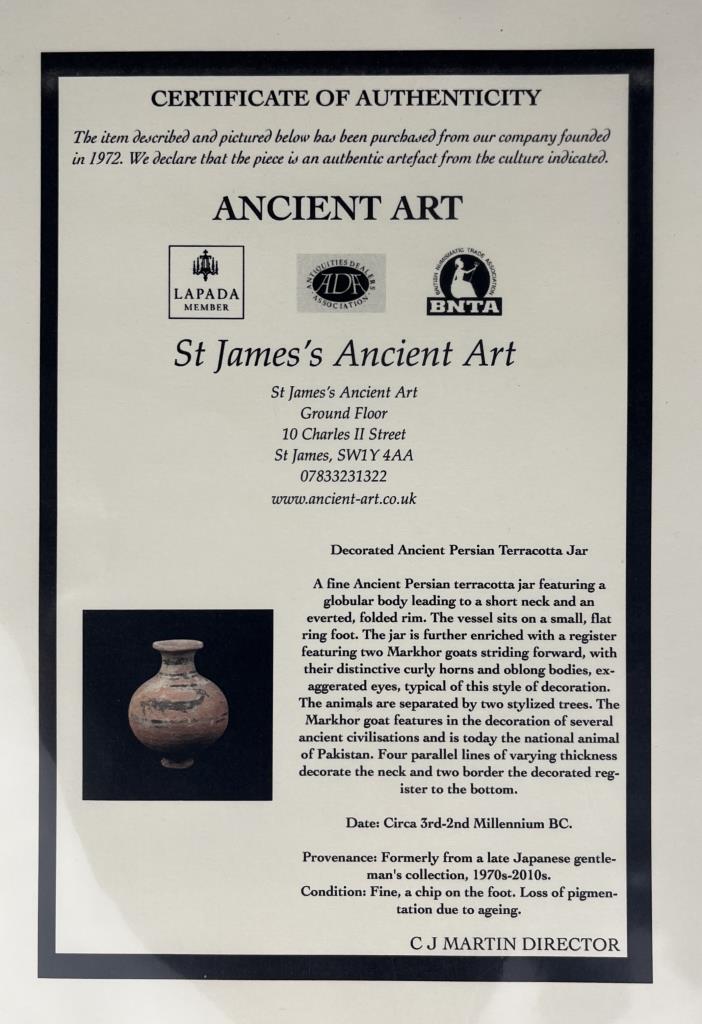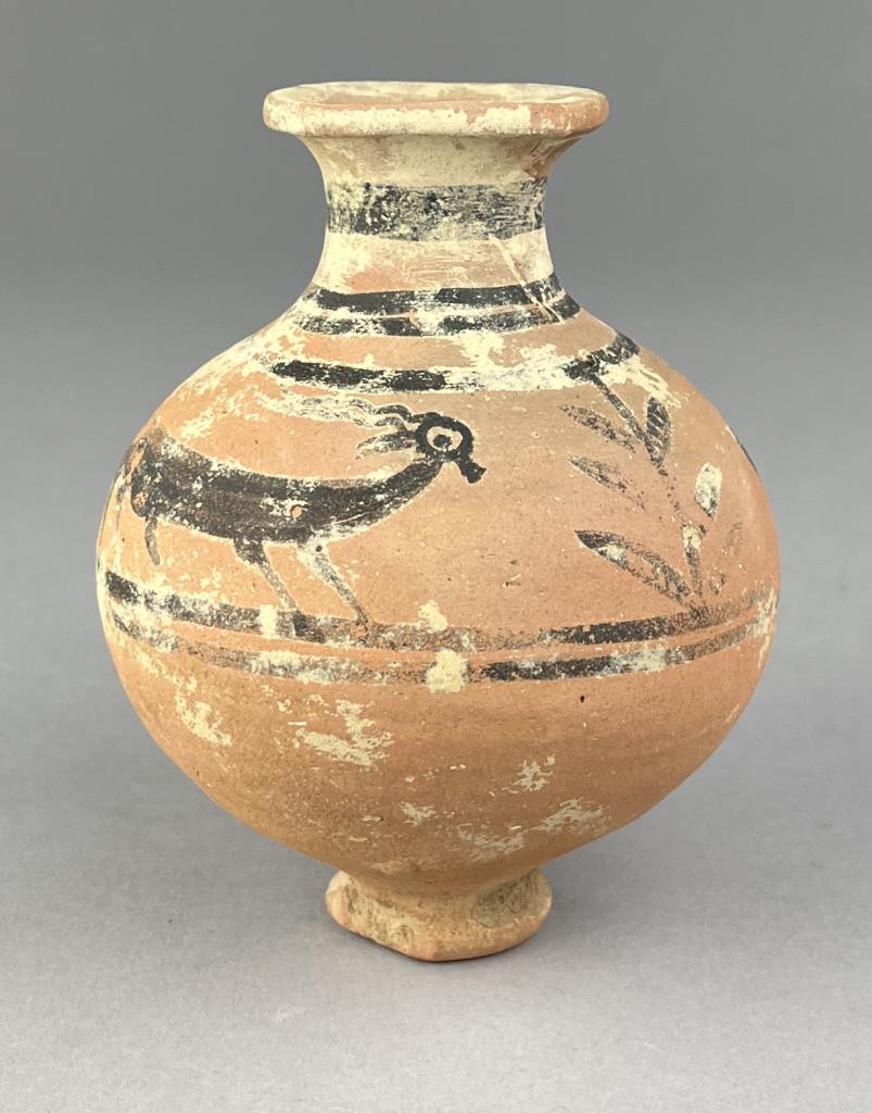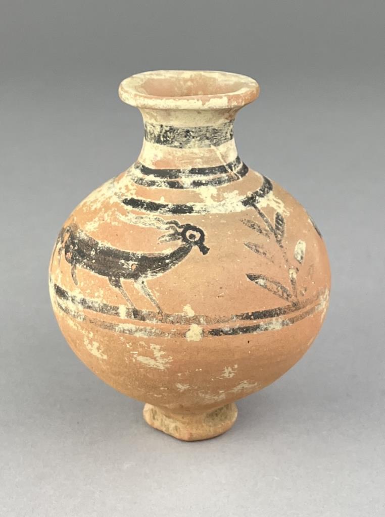 Ancient Persian terracotta jar, with a globular body leading to a short neck and an elevated folded rim, decorated with two Markhor goats, separated by two stylized trees, and all framed between parallel lines of varying thickness, circa 3rd to 2nd Millennium BCE, 5-1/8″ (H). Provenance: ex-private East Lansing, Michigan, USA collection of antiquities and relics; St. James Ancient Art London, UK (11/2022); a late Japanese gentleman’s collection assembled 1970s – 2010s. CONDITION: Please Refer to Photos and Description for Condition. SHIPPING: In-House Shipping is available on this item. PLEASE read our Shipping Policies and our full Terms and Conditions prior to bidding.