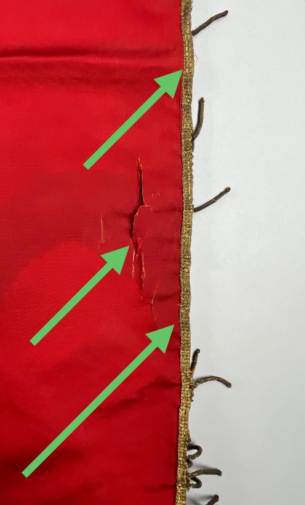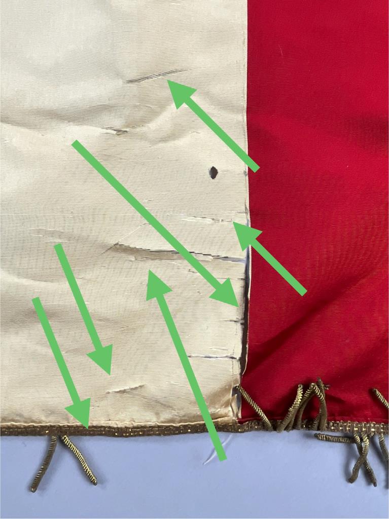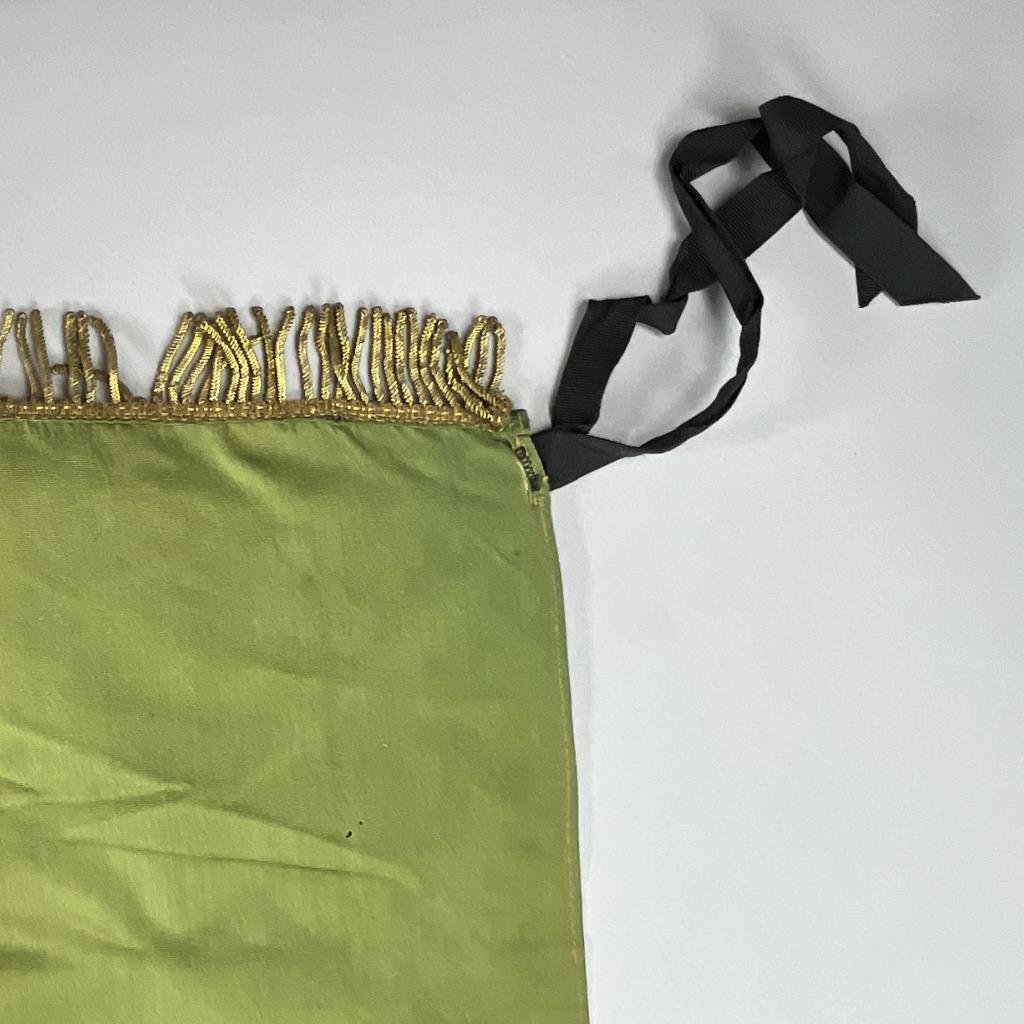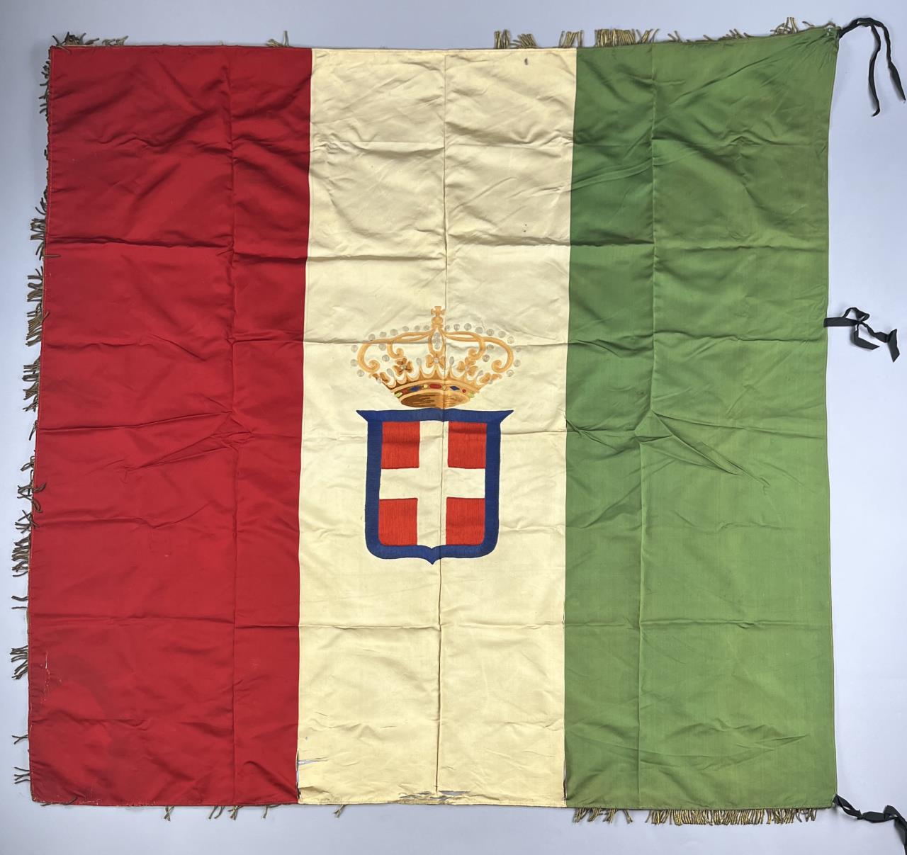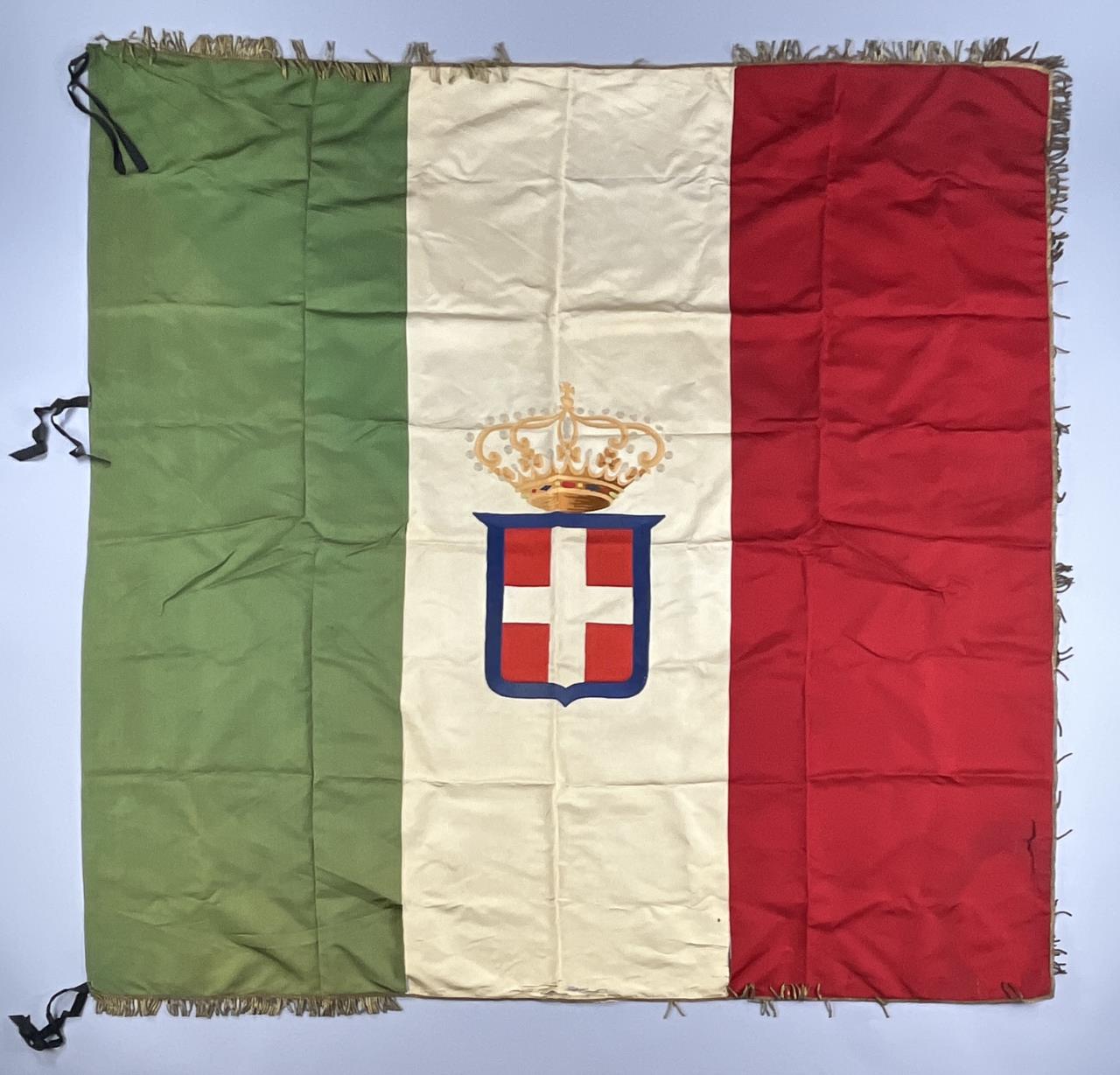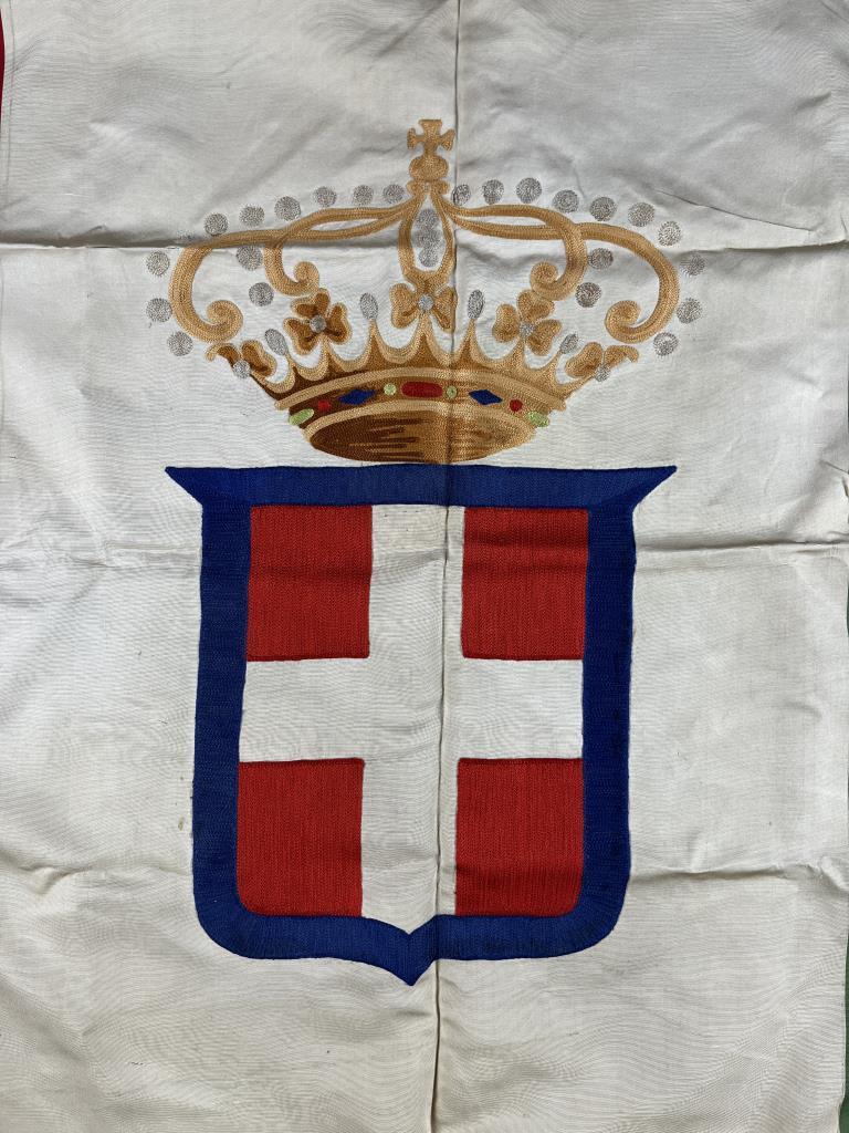 Kingdom of Italy flag, with the royal coat of arms of the House of Savoy, which was used between 1861 and 1946, embroidered fabric with metallic fringe decoration, approximately 56″x 58″ (not including fringe). CONDITION: Areas of tearing to fabric and areas of missing fringe, please see photos. SHIPPING: In-House Shipping is available on this item. PLEASE read our Shipping Policies and our full Terms and Conditions prior to bidding.
