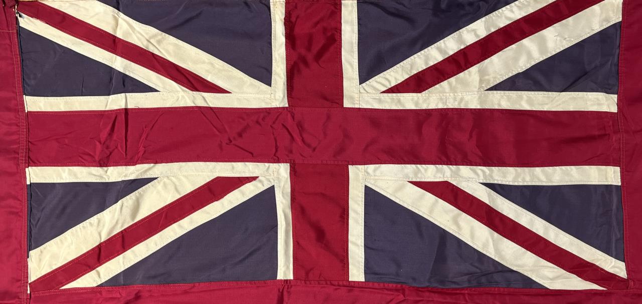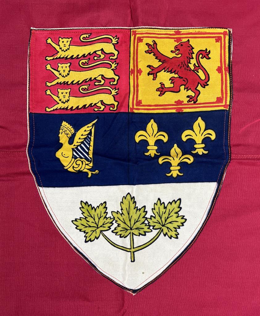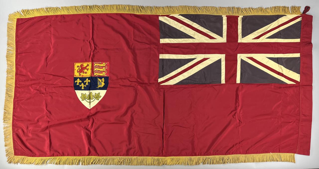 Canadian Red Ensign flag, with the Union Jack in the canton (upper left corner) and the shield of the Canadian Coat of Arms on the fly side (right side), which was in use from 1892-1965, approximately 34-1/2″ x 71″ (not including fringe). CONDITION: Please Refer to Photos and Description for Condition. SHIPPING: In-House Shipping is available on this item. PLEASE read our Shipping Policies and our full Terms and Conditions prior to bidding.