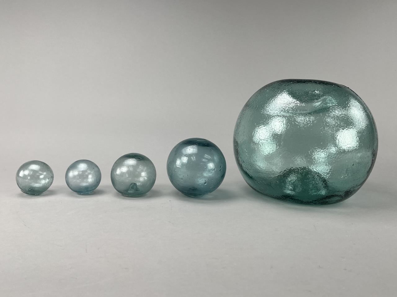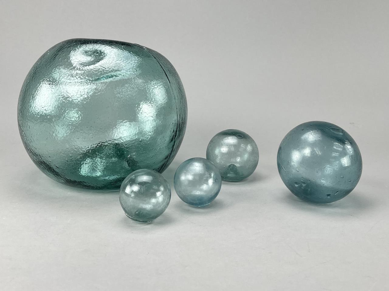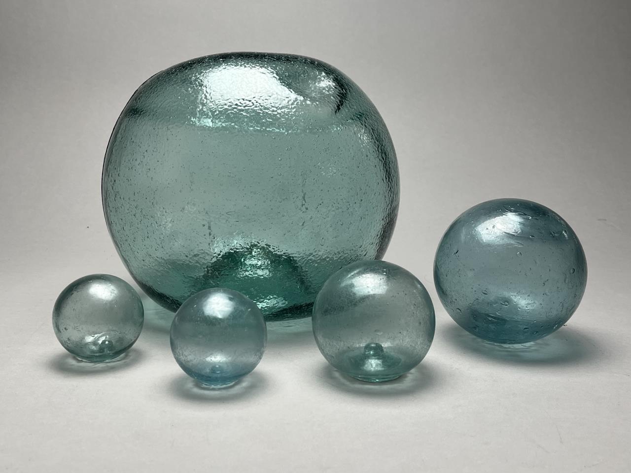Five blown glass fishing buoys, also known as Ukidama or Bindama, most likely Japanese and early to mid 20th Century, ranging approximately in size from 2-1/2″ – 9-1/2″ (D). CONDITION: Please Refer to Photos and Description for Condition. SHIPPING: In-House Shipping is available on this item. PLEASE read our Shipping Policies and our full Terms and Conditions prior to bidding.