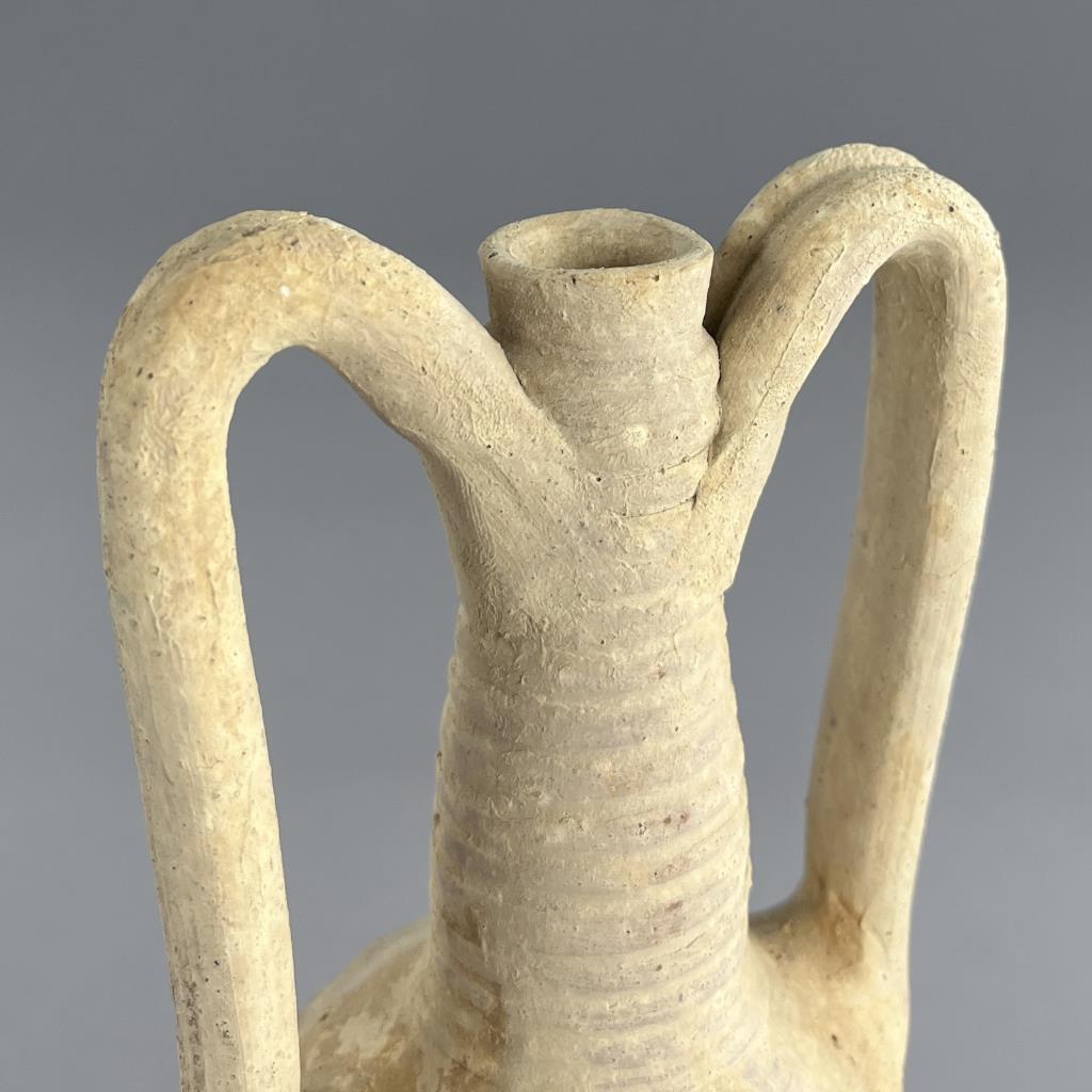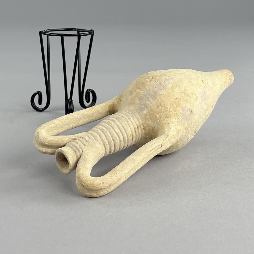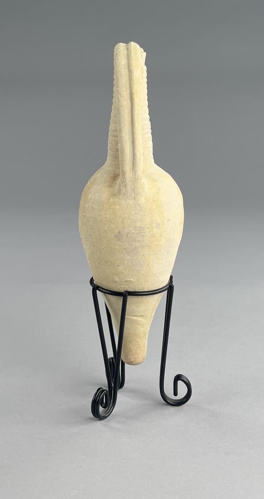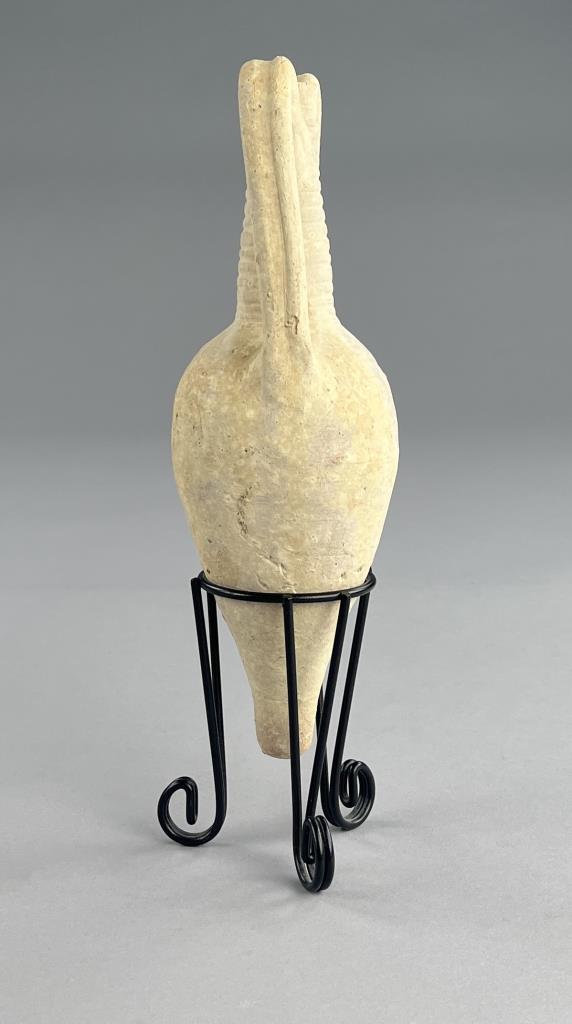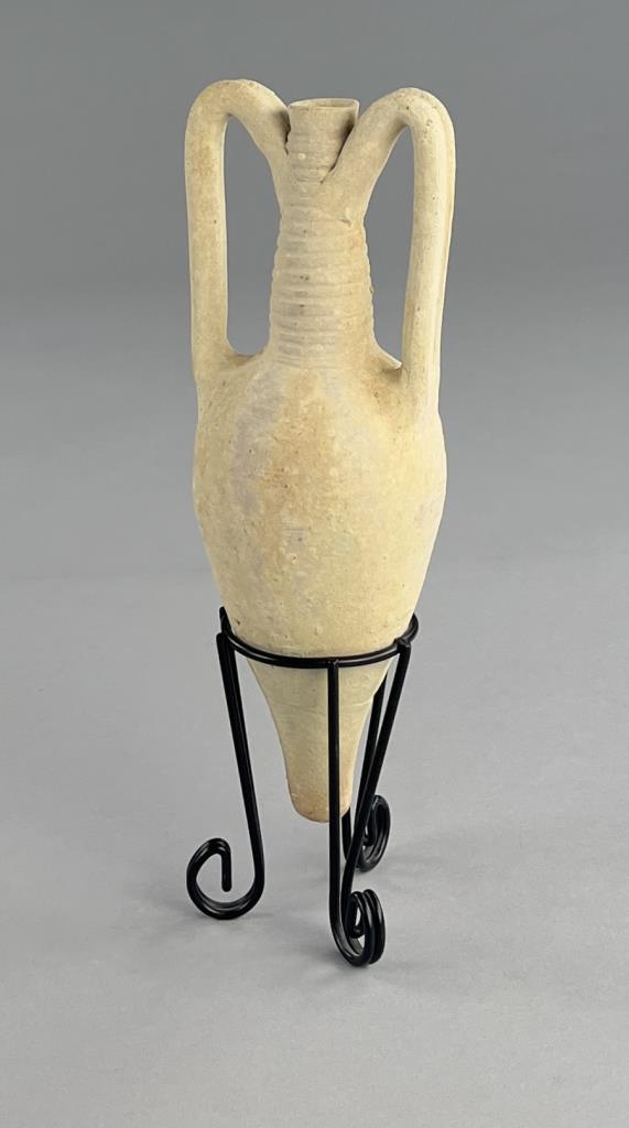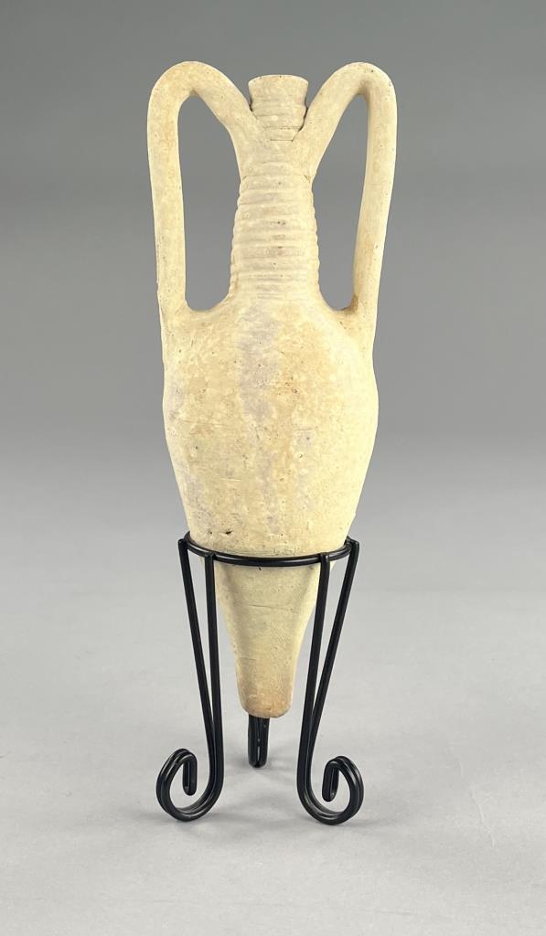 Terracotta amphora, most likely Roman and circa 100 CE – 300 CE, 9-1/2″ (L) not including stand. Includes metal stand. Provenance: ex-private East Lansing, Michigan, USA collection of antiquities and ancient relics, not authenticated. CONDITION: Please Refer to Photos and Description for Condition. SHIPPING: In-House Shipping is available on this item. PLEASE read our Shipping Policies and our full Terms and Conditions prior to bidding.