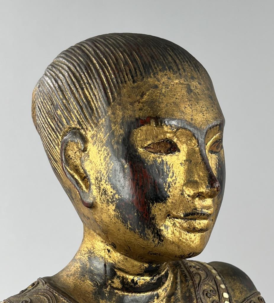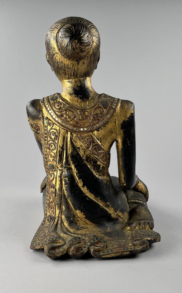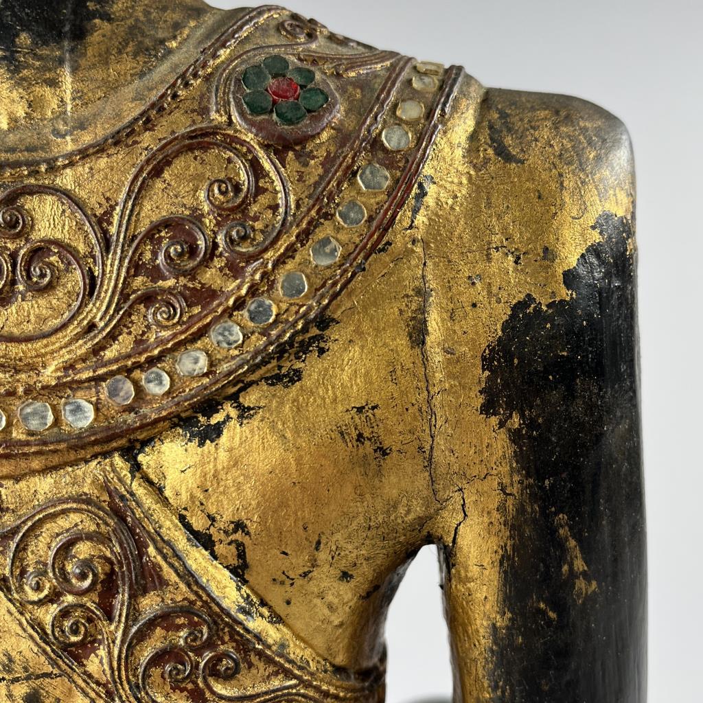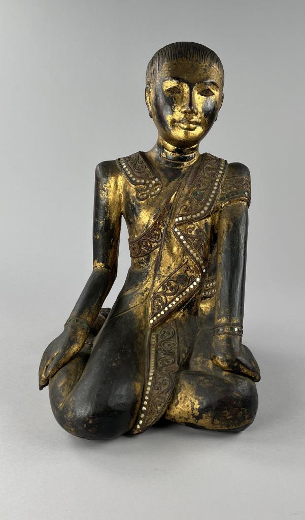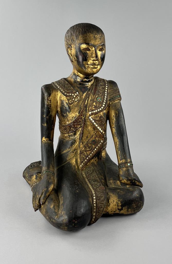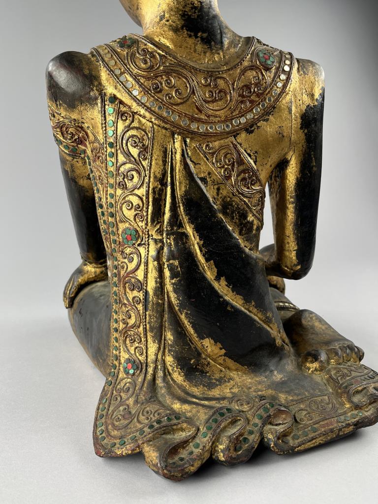 Antique Burmese Mandalay style gilt and lacquered carved wood figure of a seated Buddhist monk, with applied and inset mirrored and glass jewels, circa late 19th Century / early 20th Century, approximately 19-1/4″ H. CONDITION: Some of applied and inset mirrored and glass jewels are loose or missing, one inset eye is missing and the other may be a later replacement. SHIPPING: In-House Shipping is available on this item. PLEASE read our Shipping Policies and our full Terms and Conditions prior to bidding.