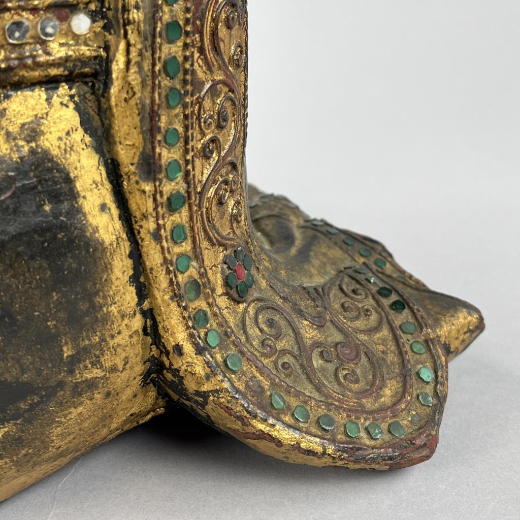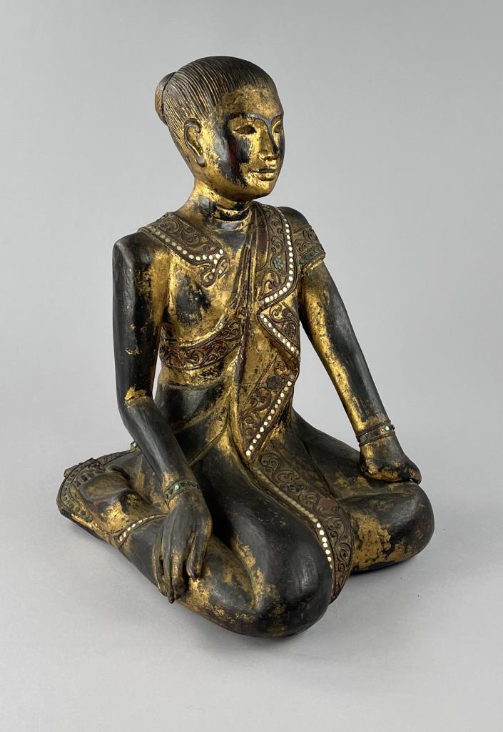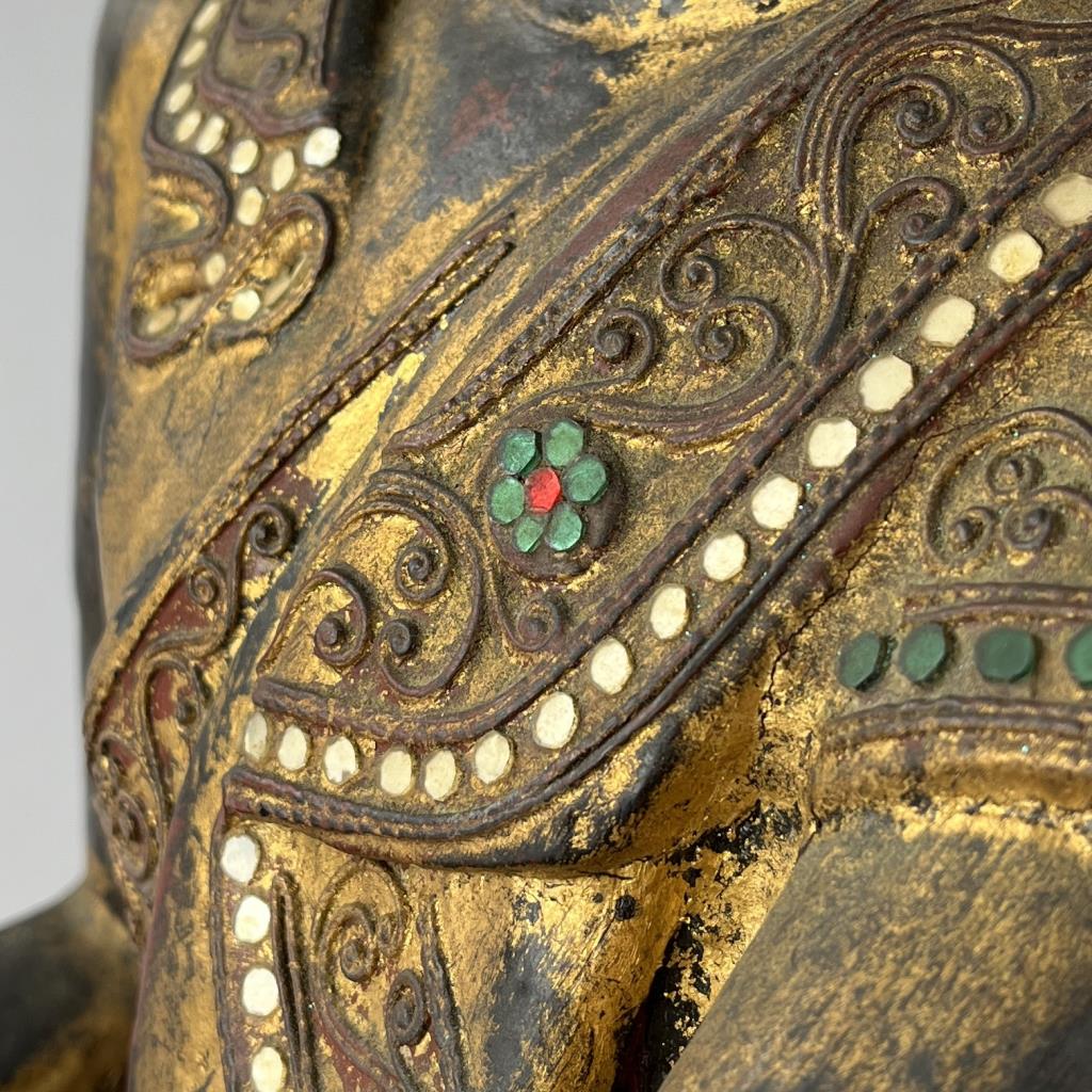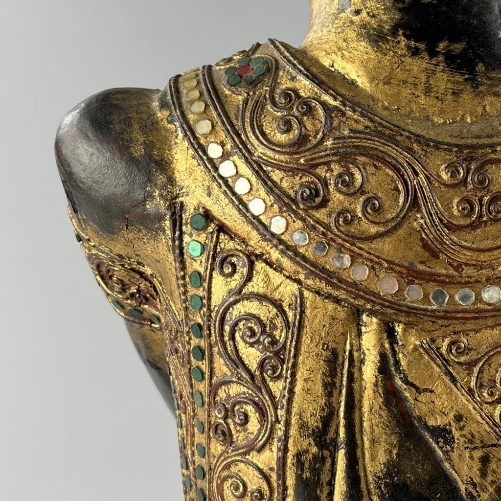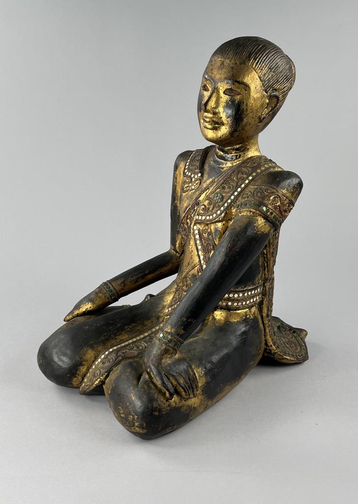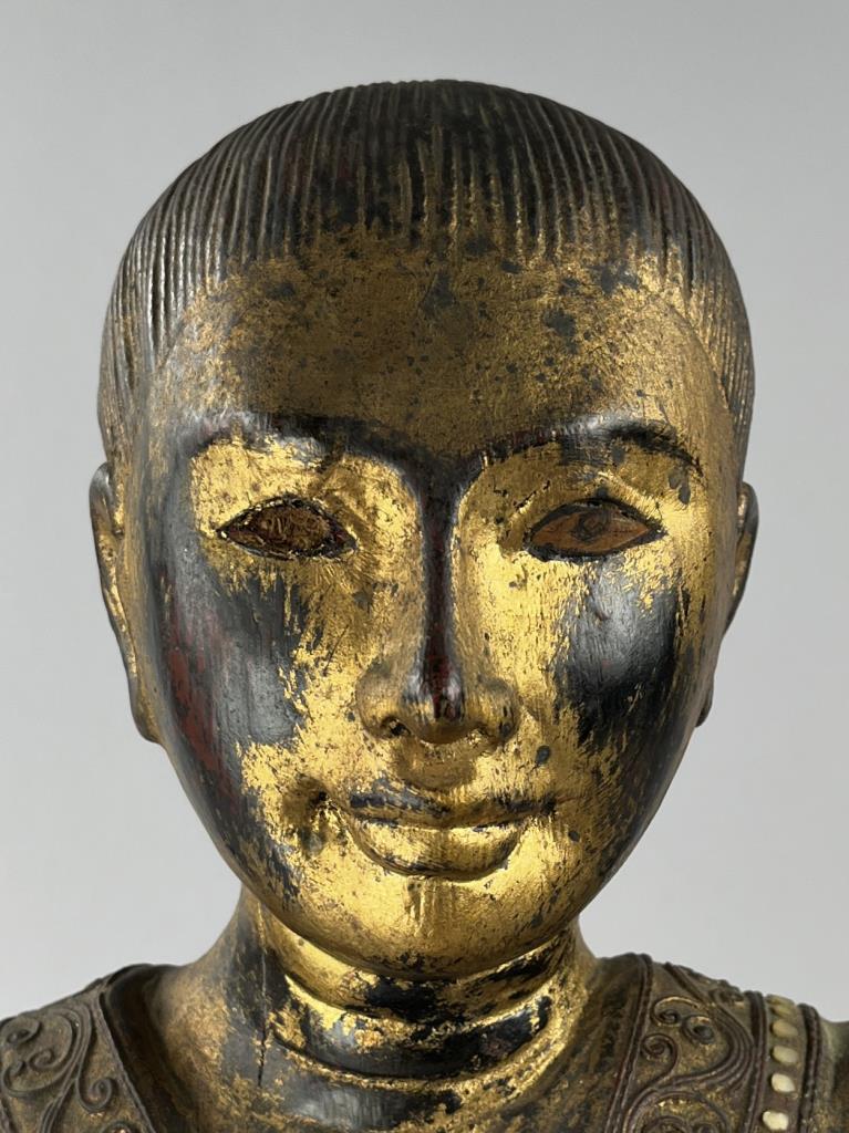 Antique Burmese Mandalay style gilt and lacquered carved wood figure of a seated Buddhist monk, with applied and inset mirrored and glass jewels, circa late 19th Century / early 20th Century, approximately 19-1/4″ H. CONDITION: Some of applied and inset mirrored and glass jewels are loose or missing, one inset eye is missing and the other may be a later replacement. SHIPPING: In-House Shipping is available on this item. PLEASE read our Shipping Policies and our full Terms and Conditions prior to bidding.