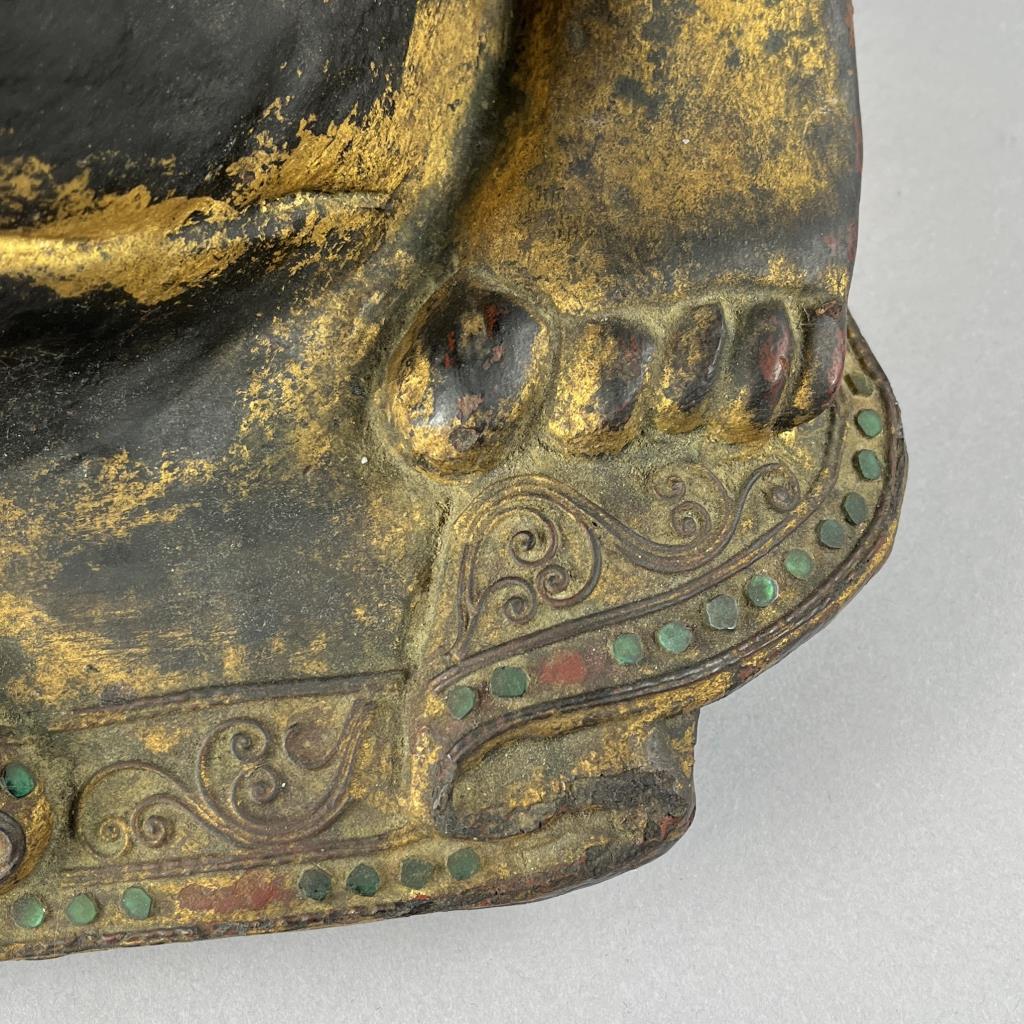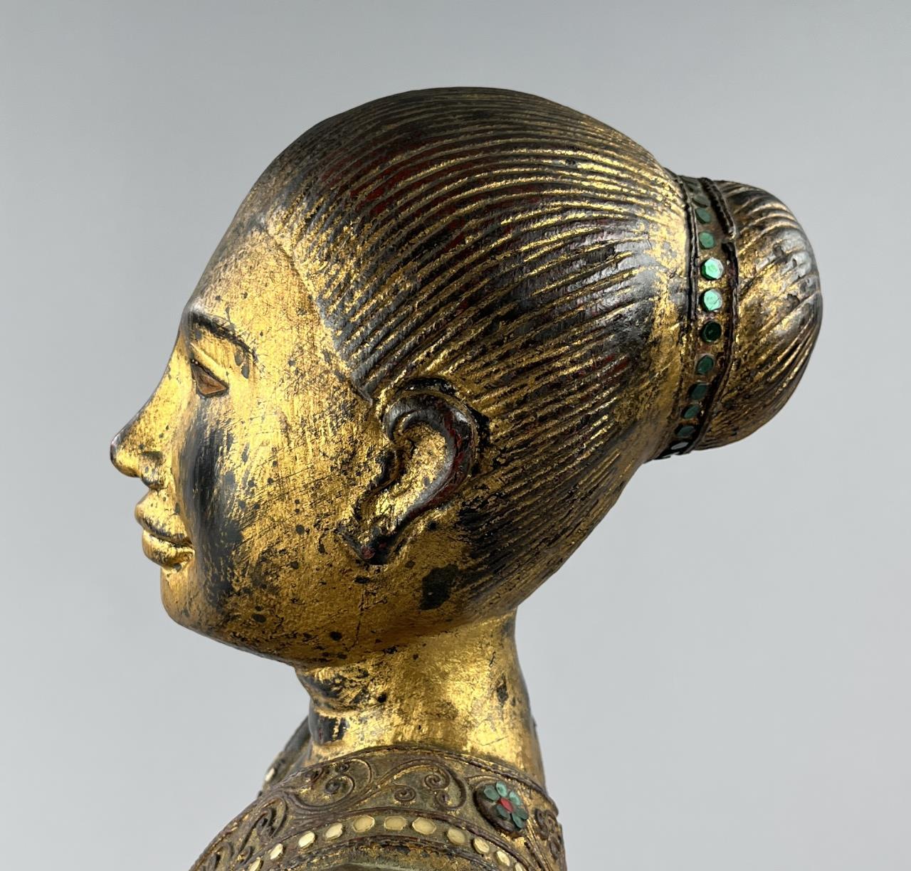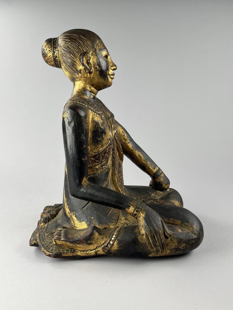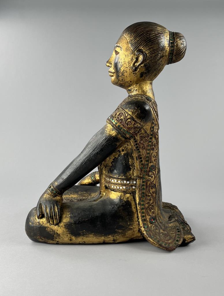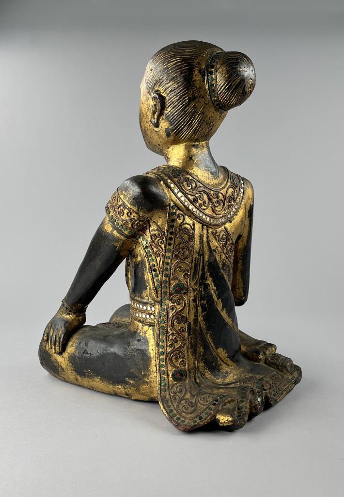 Antique Burmese Mandalay style gilt and lacquered carved wood figure of a seated Buddhist monk, with applied and inset mirrored and glass jewels, circa late 19th Century / early 20th Century, approximately 19-1/4″ H. CONDITION: Some of applied and inset mirrored and glass jewels are loose or missing, one inset eye is missing and the other may be a later replacement. SHIPPING: In-House Shipping is available on this item. PLEASE read our Shipping Policies and our full Terms and Conditions prior to bidding.