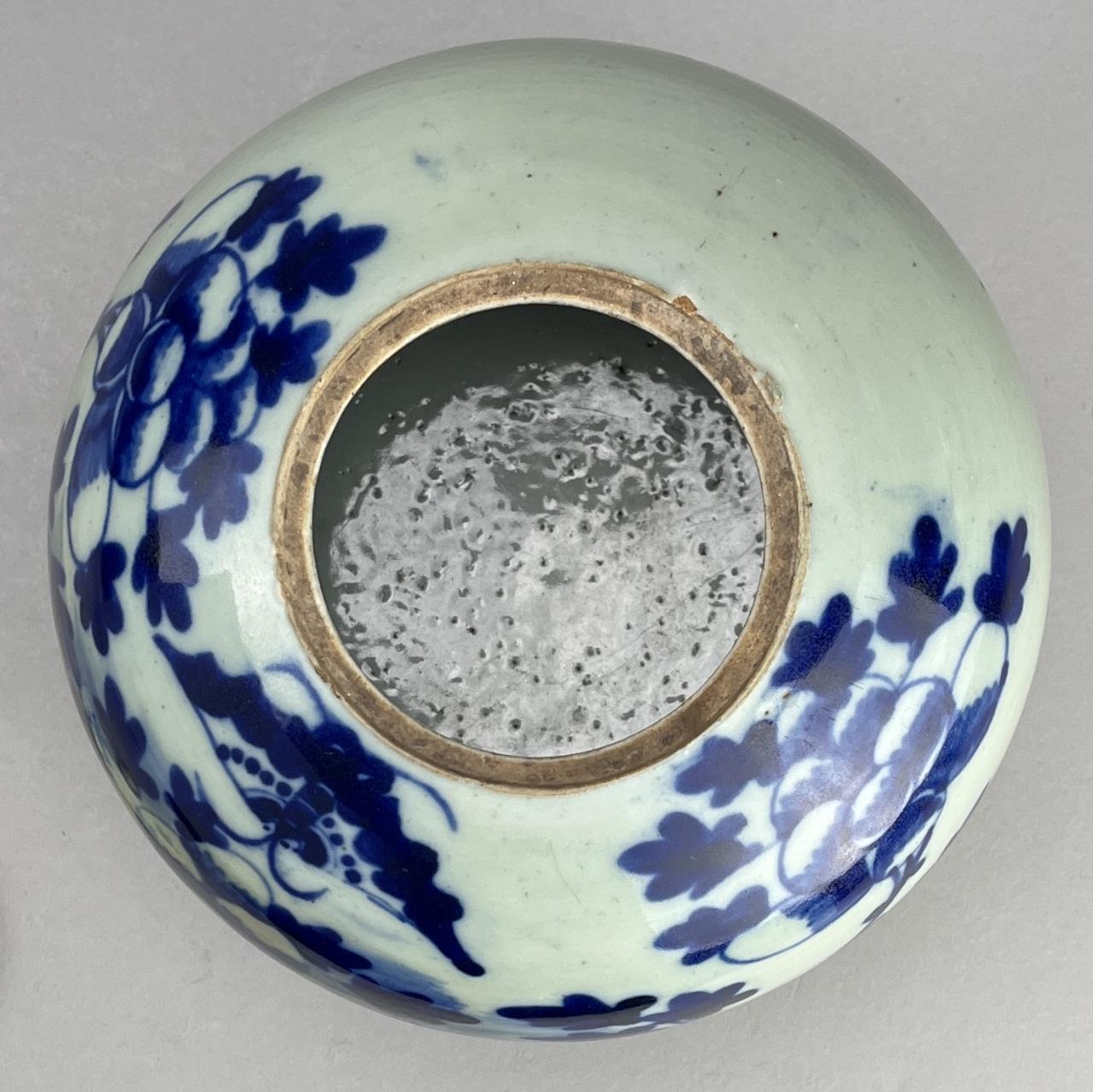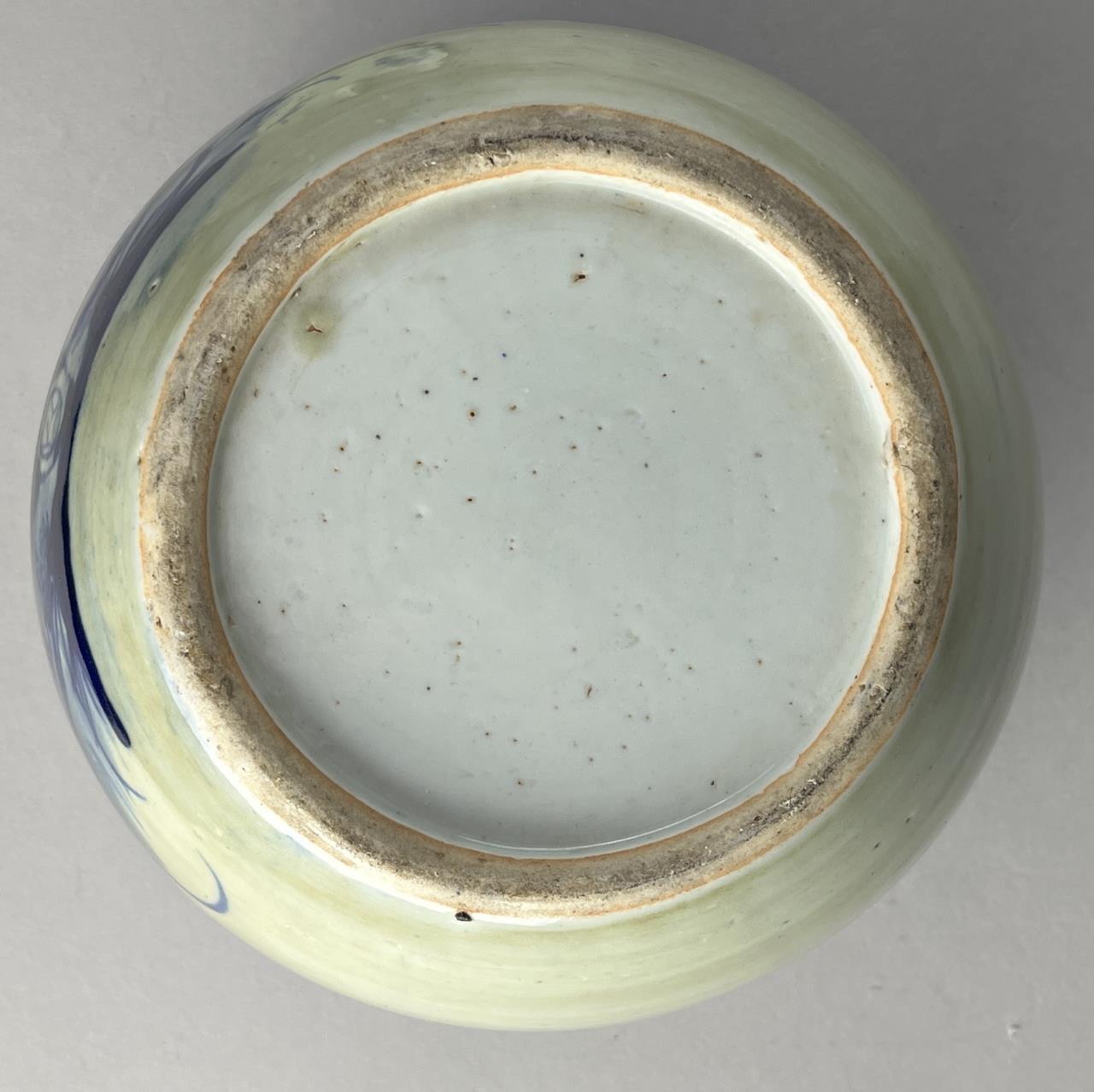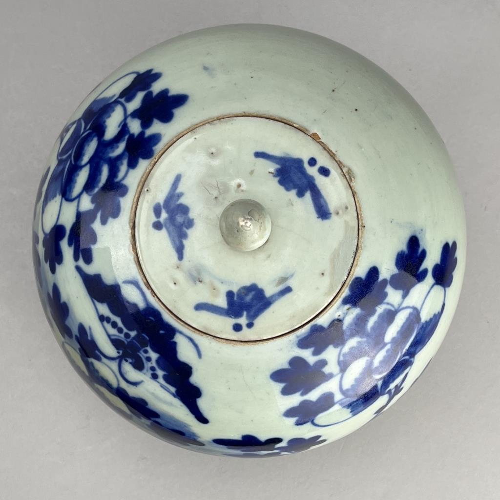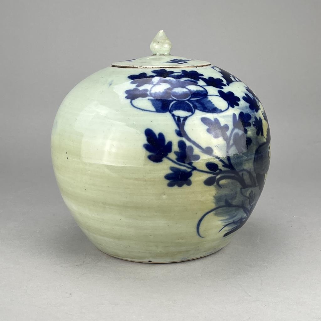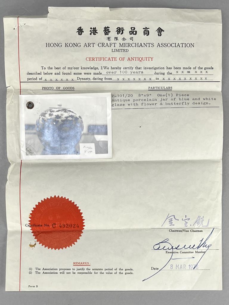 Antique Chinese ginger jar, blue and white glazed porcelain decorated with flowers and a butterfly, late Ching Dynasty, 8-1/2″ (H) x 9″ (D). Provenance: ex-private Saint Johns, Michigan, USA collection; Hong Kong, 08/1976. Includes paperwork. CONDITION: One possible small chip on rim, please see photos. SHIPPING: In-House Shipping is available on this item. PLEASE read our Shipping Policies and our full Terms and Conditions prior to bidding.