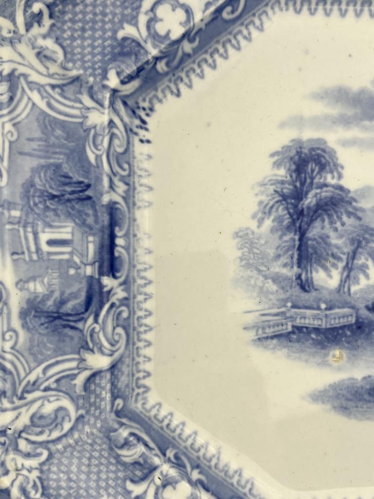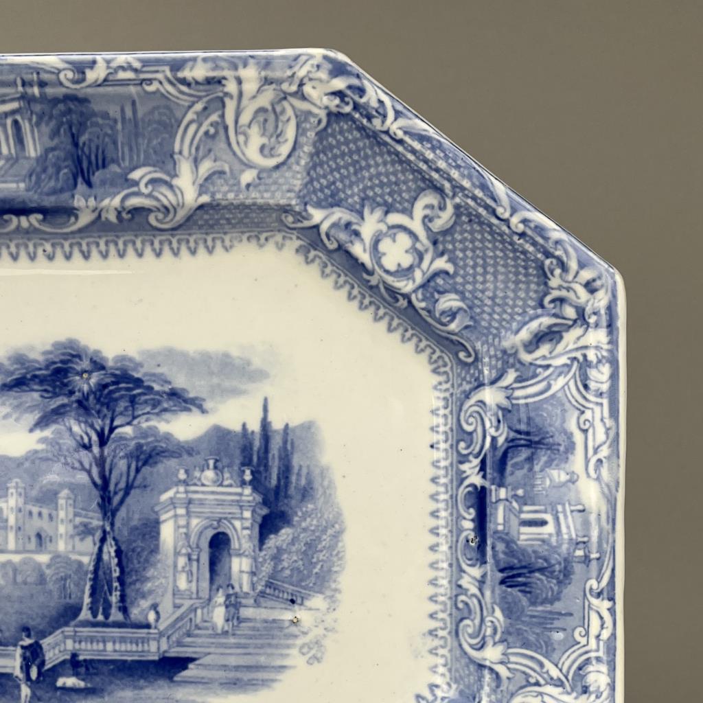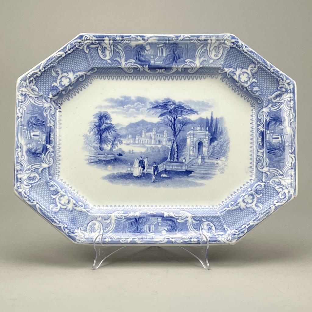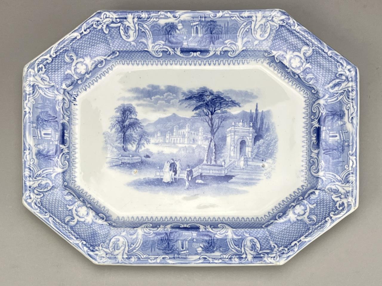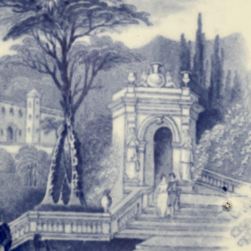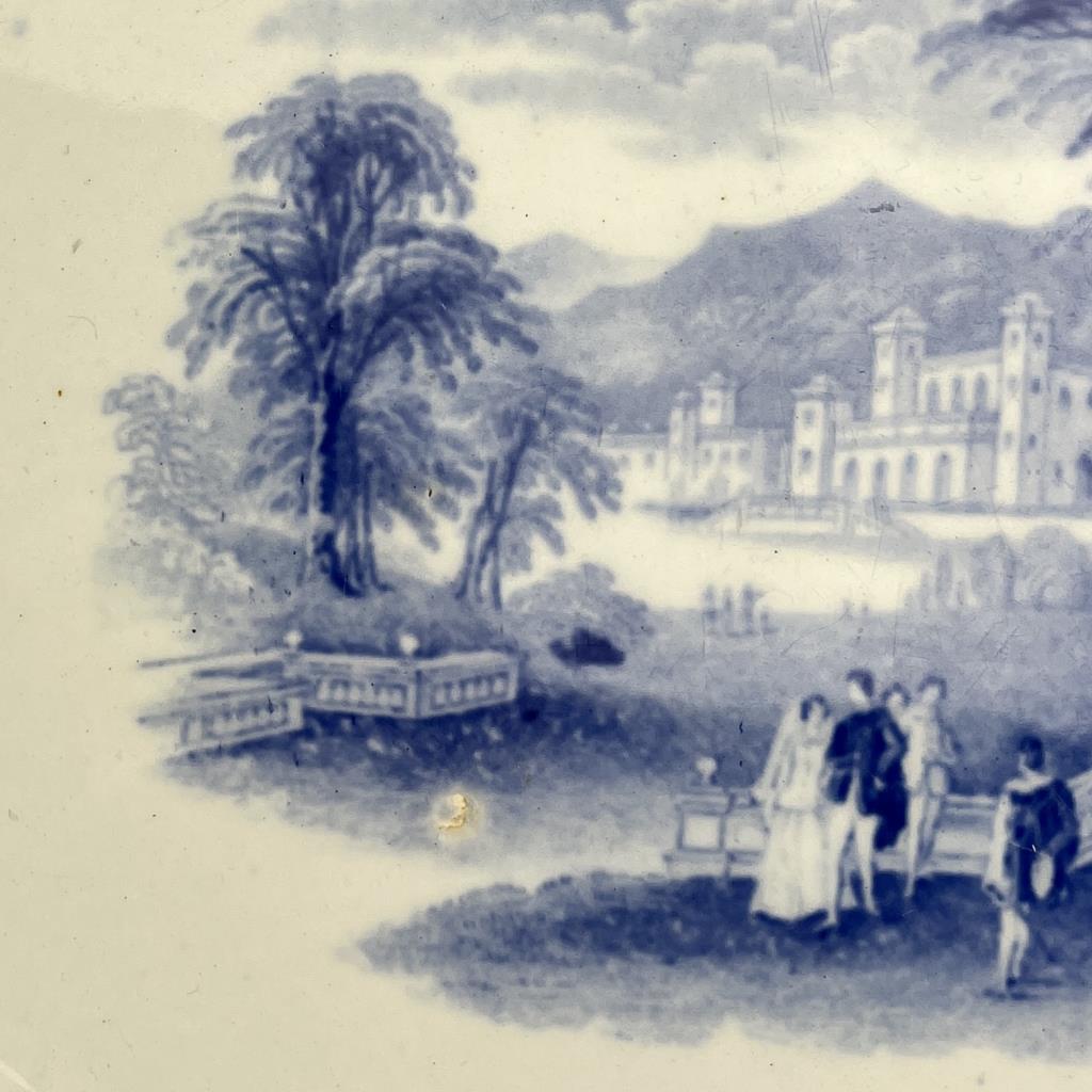 Antique blue and white transferware platter, depicting a romantic scene of young lovers admits classical ruins, ironstone earthenware, most likely from Staffordshire (England) and circa 1830s-1850s, 15-1/2″ x 11-3/4″. CONDITION: Some minor scratches and a couple of blister spots in the glaze. SHIPPING: In-House Shipping is available on this item. PLEASE read our Shipping Policies and our full Terms and Conditions prior to bidding.