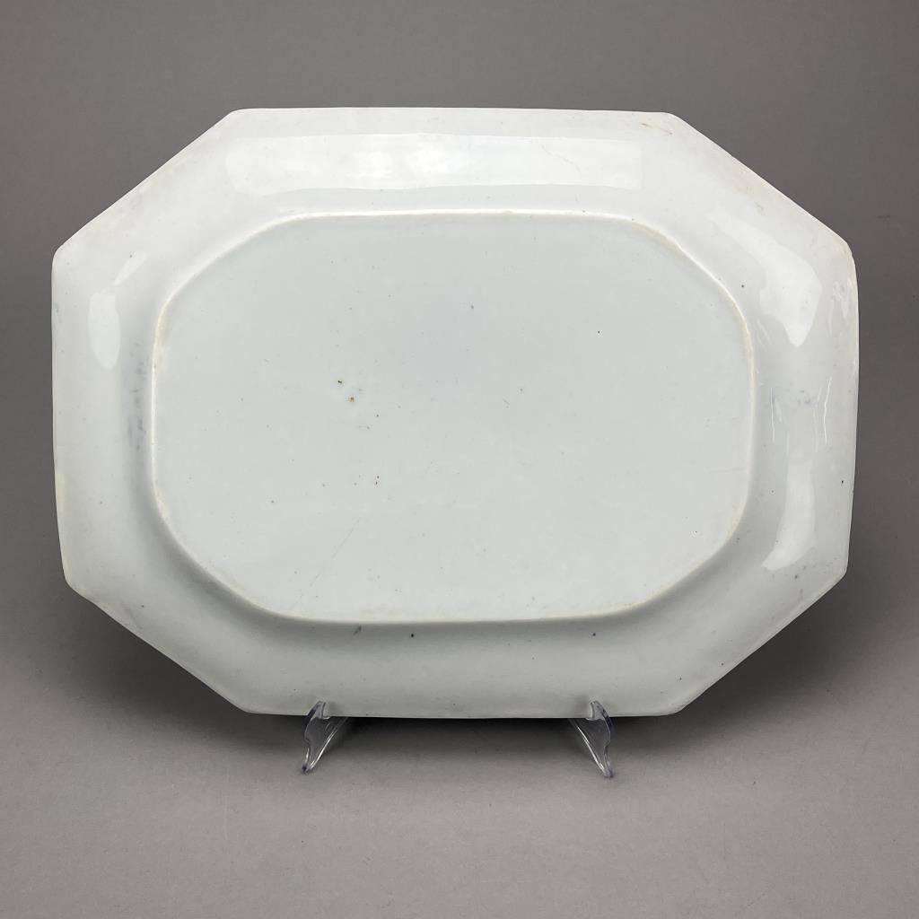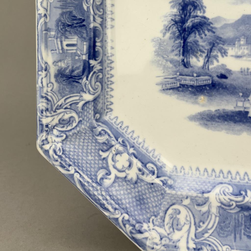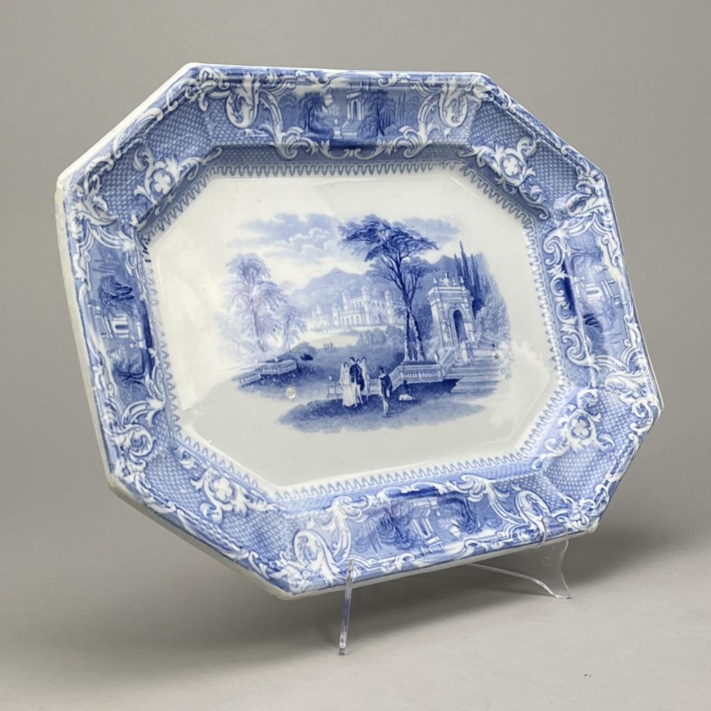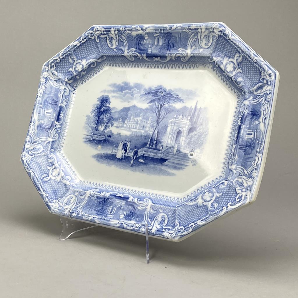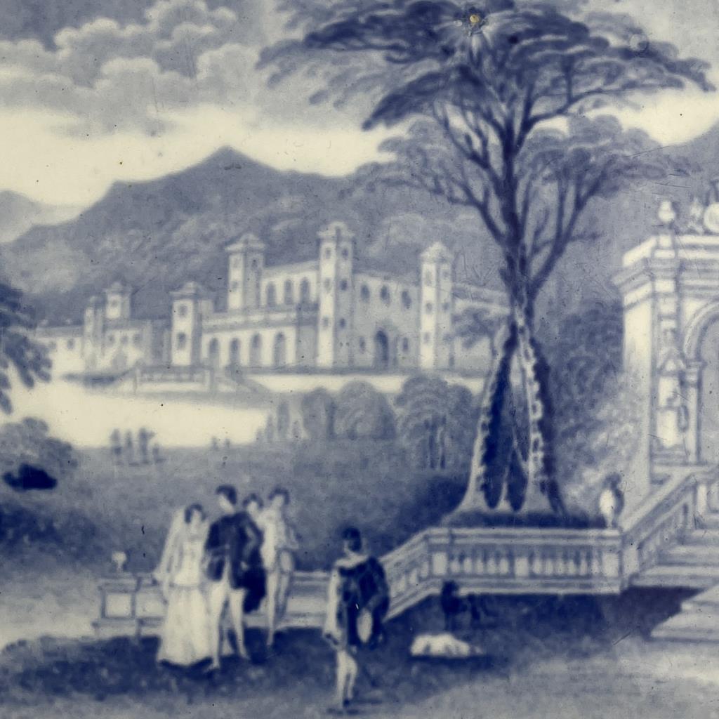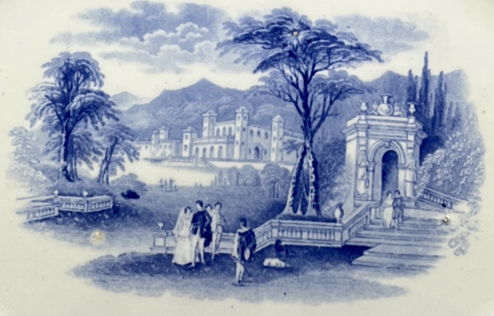 Antique blue and white transferware platter, depicting a romantic scene of young lovers admits classical ruins, ironstone earthenware, most likely from Staffordshire (England) and circa 1830s-1850s, 15-1/2″ x 11-3/4″. CONDITION: Some minor scratches and a couple of blister spots in the glaze. SHIPPING: In-House Shipping is available on this item. PLEASE read our Shipping Policies and our full Terms and Conditions prior to bidding.