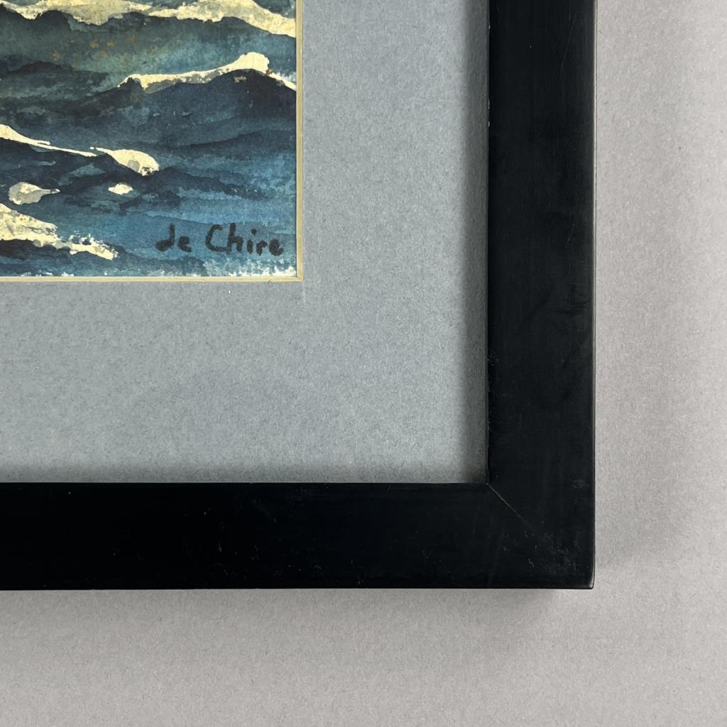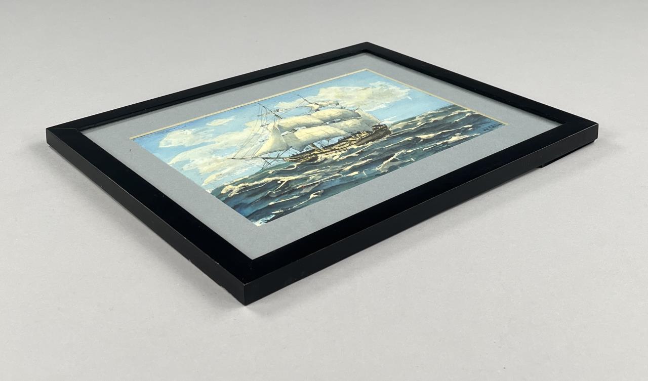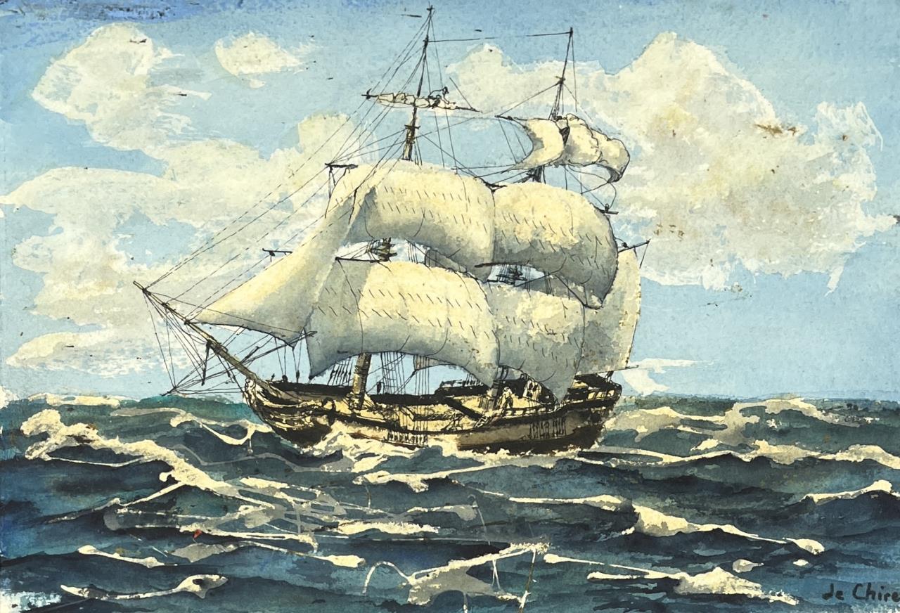 Signed marine watercolor painting on paper, most probably of a late 18th / early 19th Century frigate warship, signed lower right “Je Chire”, 20th Century, in a later black wood frame measuring 12-1/8″ x 15-3/16″. CONDITION: Not examined out of mat. SHIPPING: In-House Shipping is available on this item. PLEASE read our Shipping Policies and our full Terms and Conditions prior to bidding.