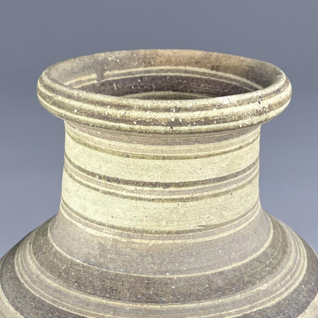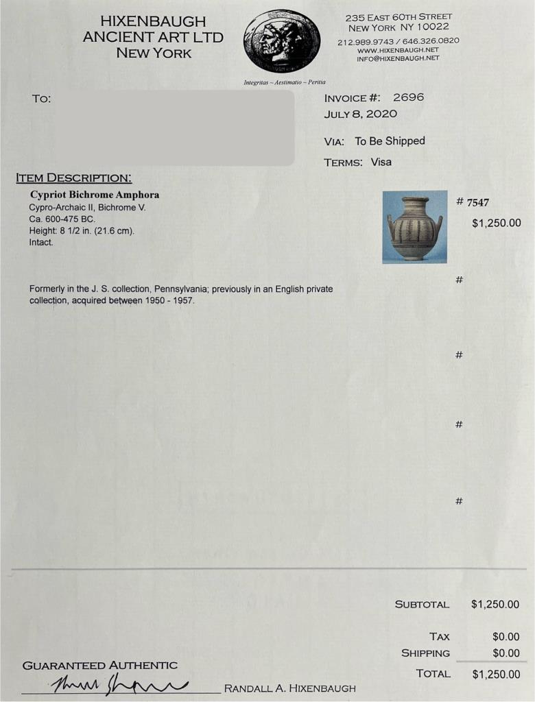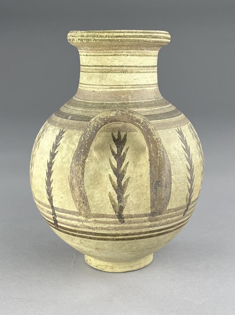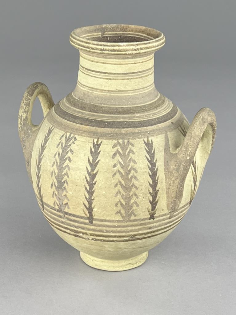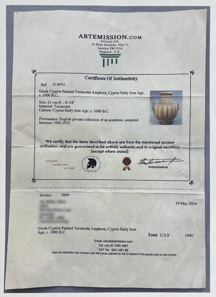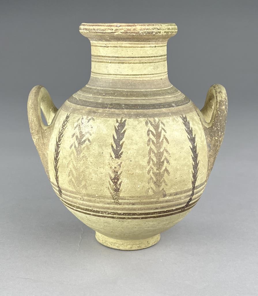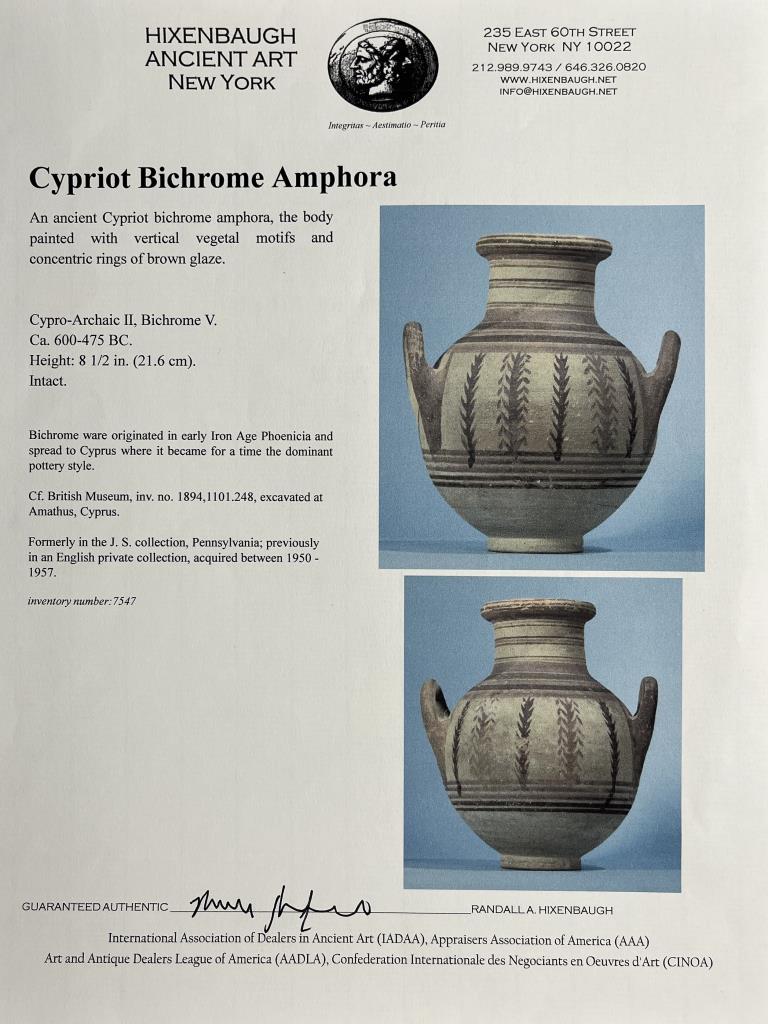 An ancient Cypriot bichrome amphora, the body painted with vertical vegetal motifs and concentric rings of brown glaze, Iron Age, circa 600-475 BCE, 8-1/2″ (H). Provenance: ex-private collection of antiquities and ancient relics, East Lansing, Michigan, USA ; Hixenbaugh Ancient Art, New York City, USA (7/2020); J. S. Collection, Pennsylvania, USA; Artemission, London UK (5/2014); English private collection, acquired between 1950–1957. CONDITION: Please Refer to Photos and Description for Condition. SHIPPING: In-House Shipping is available on this item. PLEASE read our Shipping Policies and our full Terms and Conditions prior to bidding.