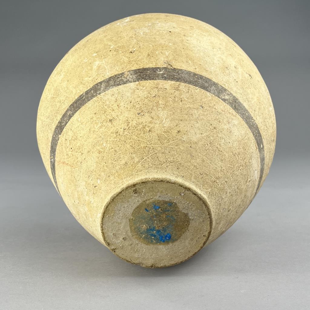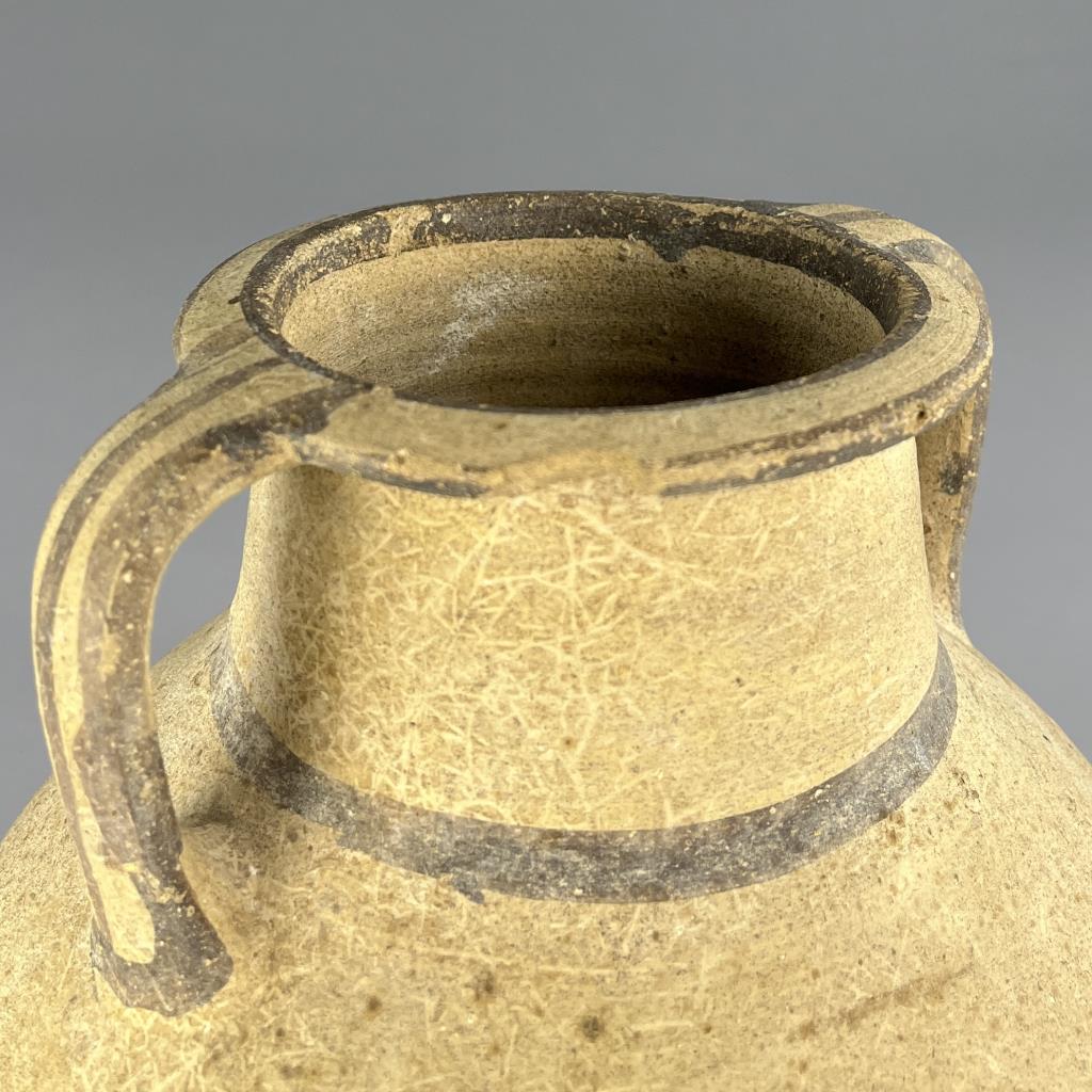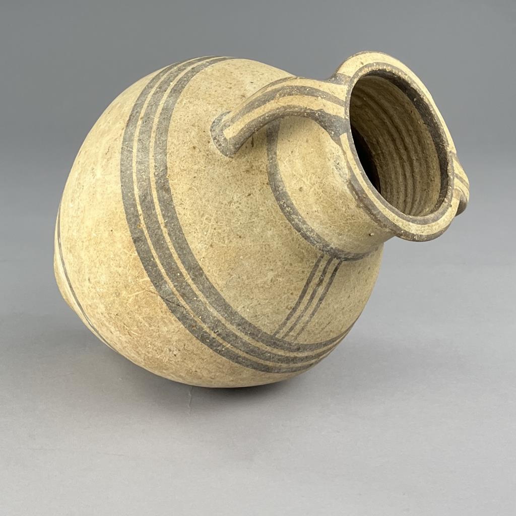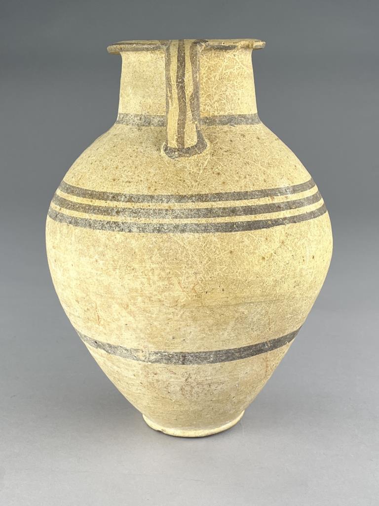 An ancient Cypriot light terracotta amphora, painted with geometric lines in black pigment encircling the body and decorating the handles, Iron Age, circa 800-600 BCE, 11-1/2″ (H). Provenance: ex-private collection of antiquities and ancient relics, East Lansing, Michigan, USA; Ancient Art, London UK. CONDITION: Please Refer to Photos and Description for Condition. SHIPPING: In-House Shipping is available on this item. PLEASE read our Shipping Policies and our full Terms and Conditions prior to bidding.