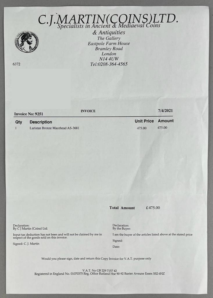 Ancient Luristan bronze macehead, circa 1500-1000 BCE, 2-1/8″ (D), on a custom made oak stand. Provenance: ex-private East Lansing, Michigan, USA collection of antiquities and ancient relics; C. J. Martin Ltd., London, UK (7/2021). CONDITION: Please Refer to Photos and Description for Condition. SHIPPING: In-House Shipping is available on this item. PLEASE read our Shipping Policies and our full Terms and Conditions prior to bidding.