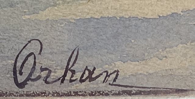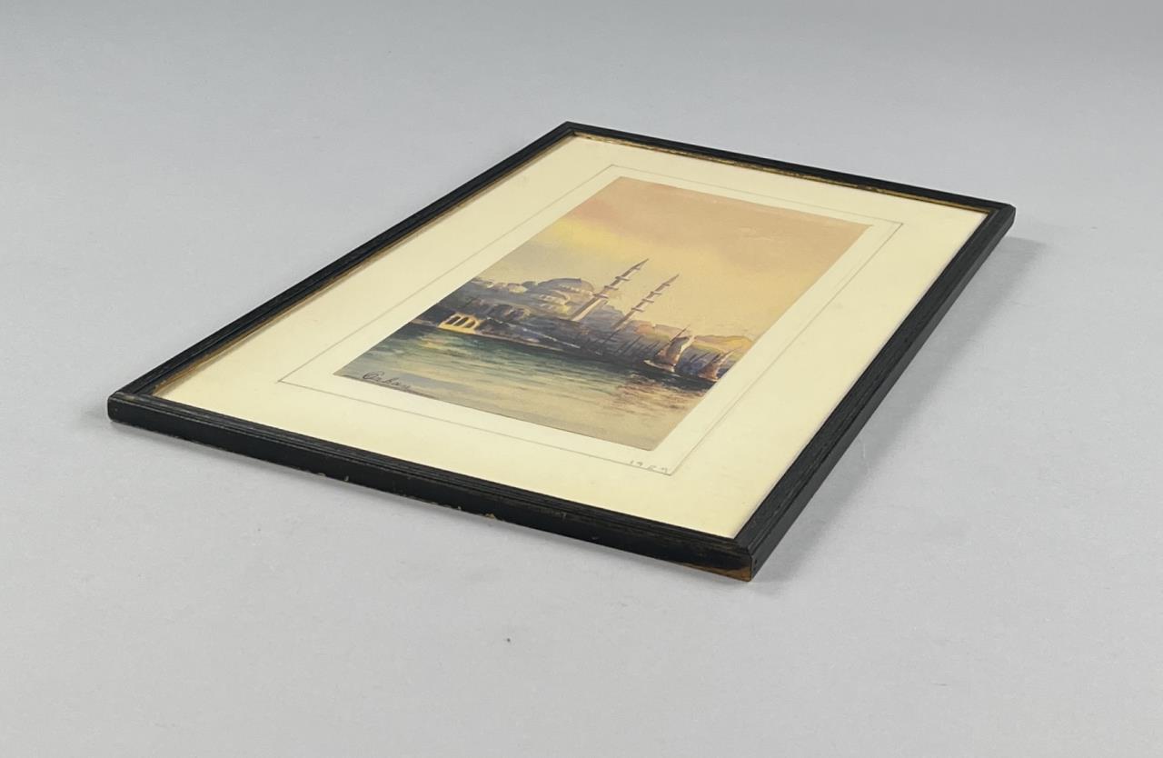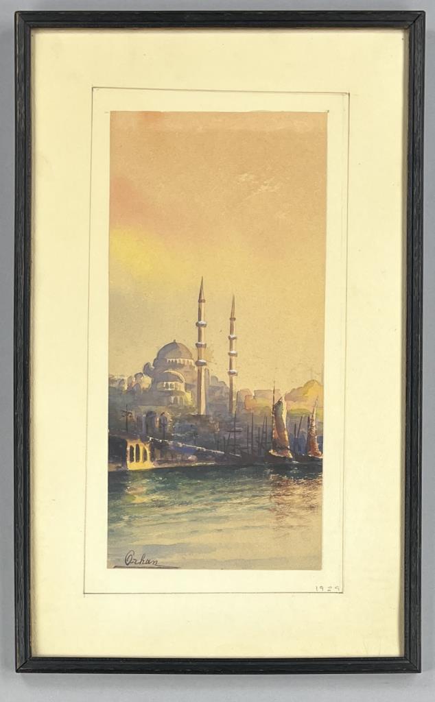 Watercolor painting on paper, depicting Constantinople (Istanbul) Turkey and specifically the Sultan Ahmed Mosque, also known as the Blue Mosque, from the Bosphorus Strait, signed lower left “Ohran” and dated lower right “1929”, in a stained and gilded wood frame measuring 19-5/8″ x 12-3/16″. CONDITION: Not examined out of frame. SHIPPING: In-House Shipping is available on this item. PLEASE read our Shipping Policies and our full Terms and Conditions prior to bidding.