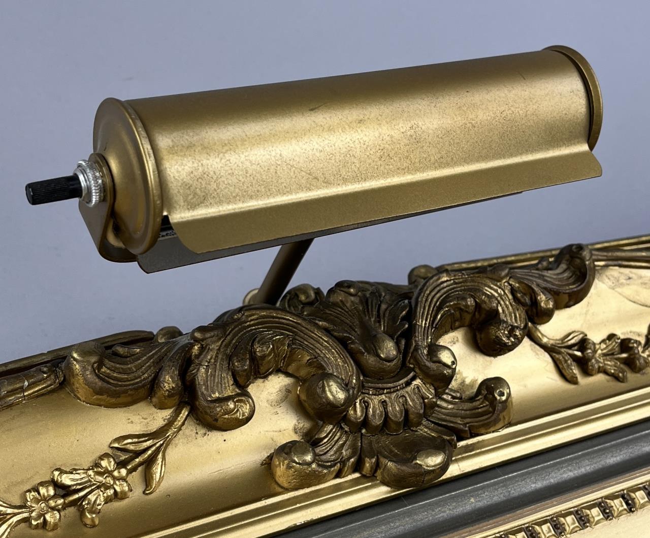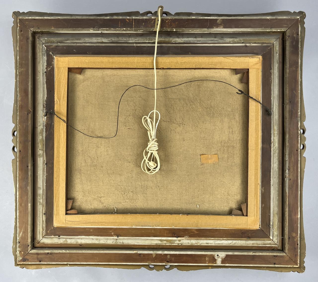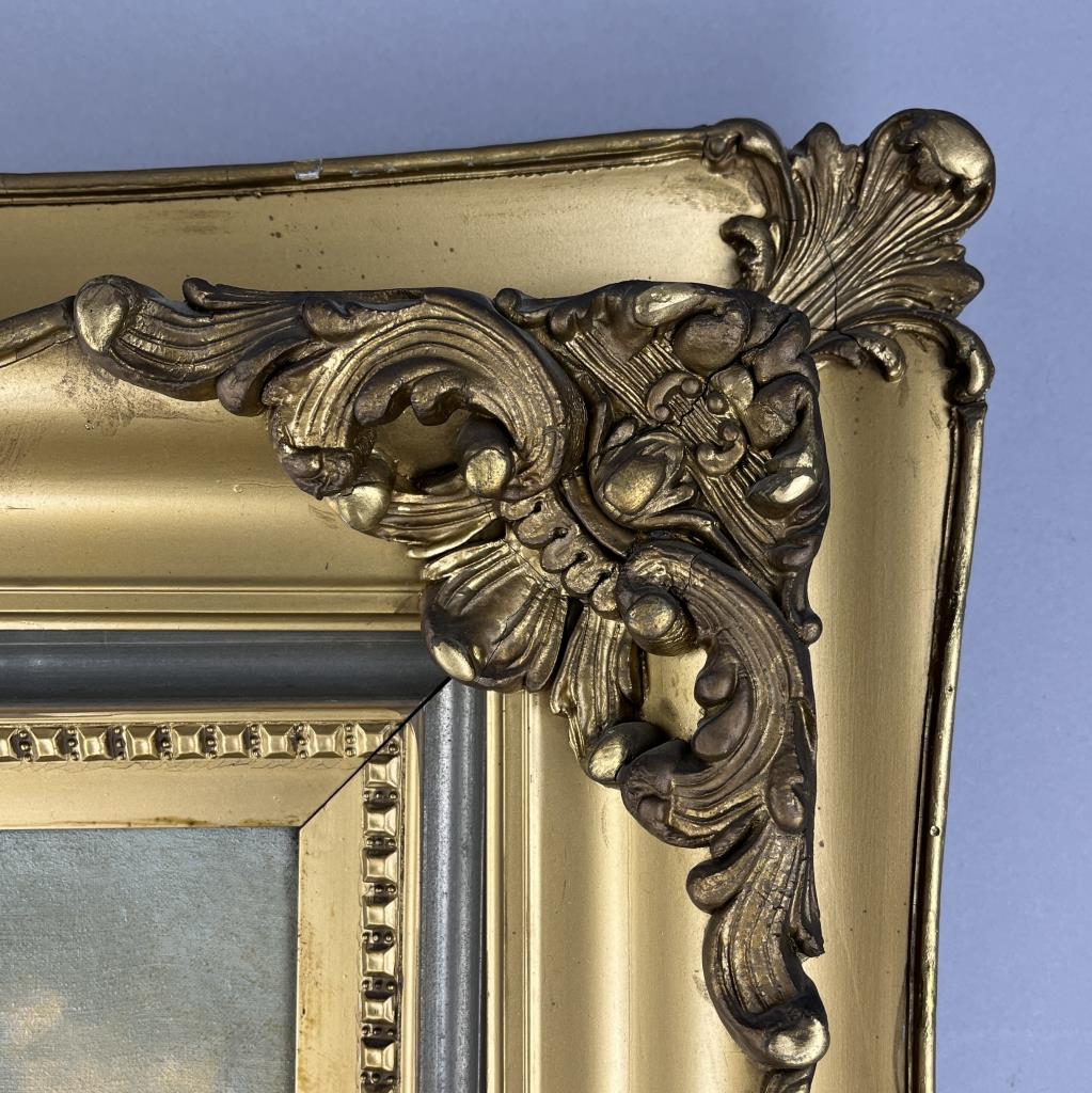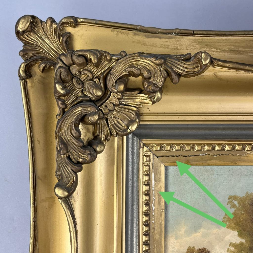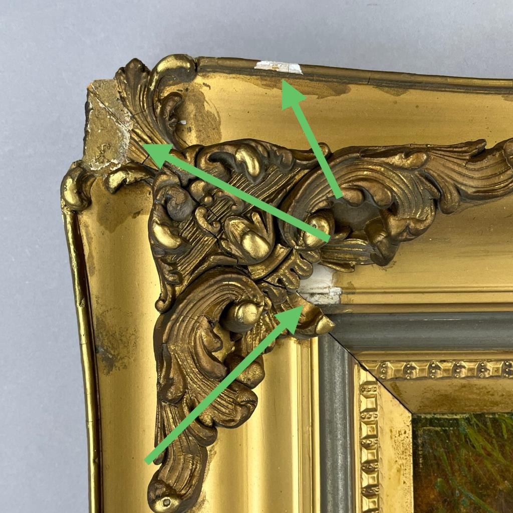 H. Flambeau oil painting on stretched canvas (20″ x 24″) depicting a pastoral scene with sheep, signed lower left “H. Flambeau”, in a gilt wood and gesso frame measuring approximately 31-3/4″ x 36″. CONDITION: Painting not examined out of frame. There is 3/4″ tear in canvas that has been partially stabilized from the reverse. Damage to frame especially on lower corners. Please see photos. SHIPPING: Local pick-up or third party shipping only for this lot. Please see the Shipping Policy for information on suggested shippers. We recommend the Pak Mail Store of Battle Creek to assist you. Please contact the shipper of your choice for shipping estimates on this lot. Refer to the Shipping section in our full Terms and Conditions for all information on shipping.