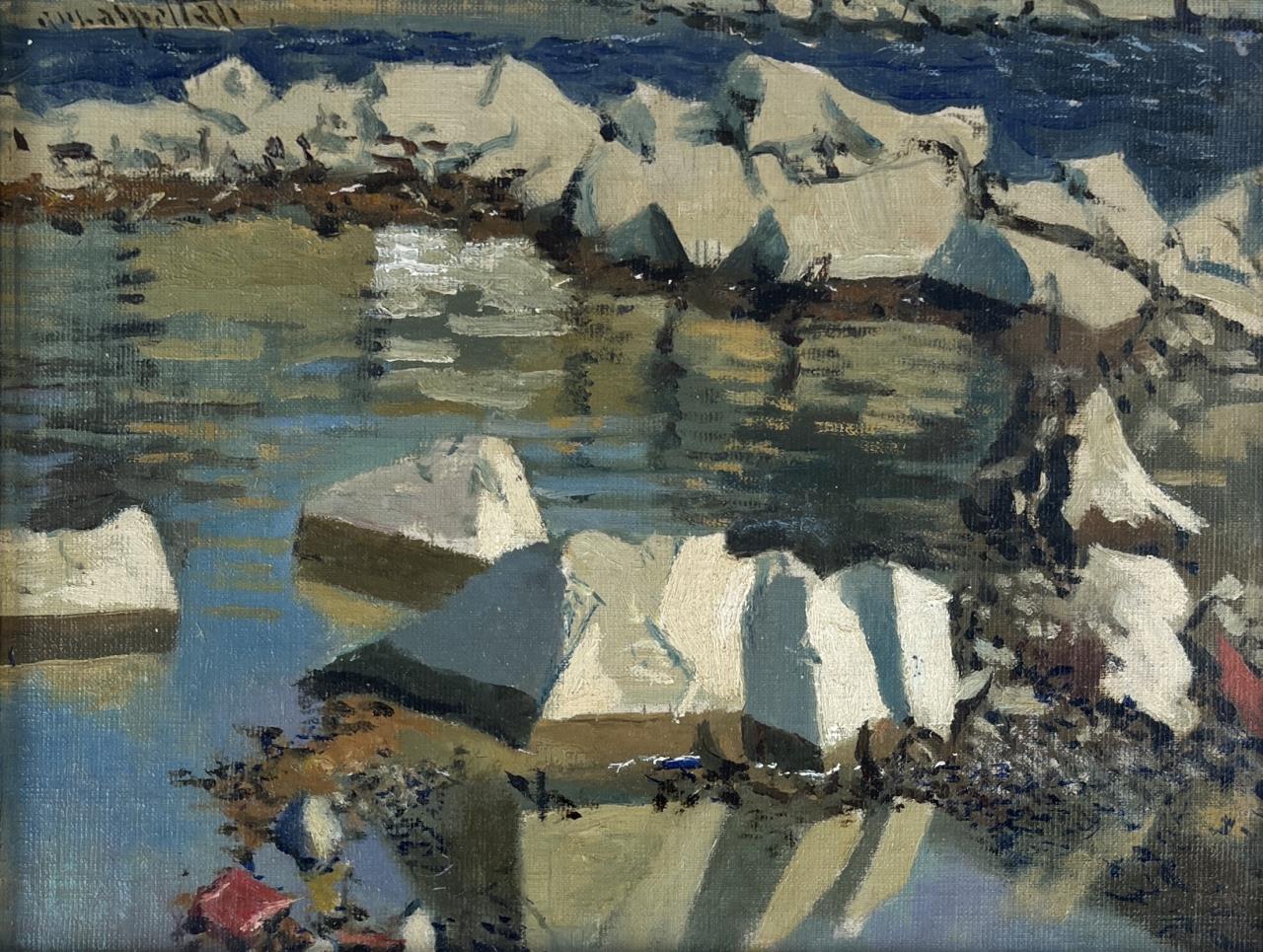 Antonio Mario Aspettati (Italian, 1880-1949) oil painting on canvas, depicting a costal scene, signed upper left, further information on back, early 20th Century, under glass in a period gilt gesso and wood frame measuring 14-5/8″ x 17-1/16″. CONDITION: Not examined out of frame. SHIPPING: In-House Shipping is available on this item. PLEASE read our Shipping Policies and our full Terms and Conditions prior to bidding.
