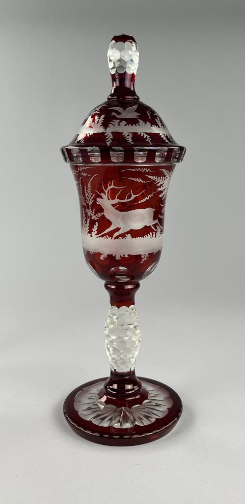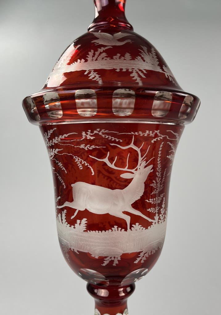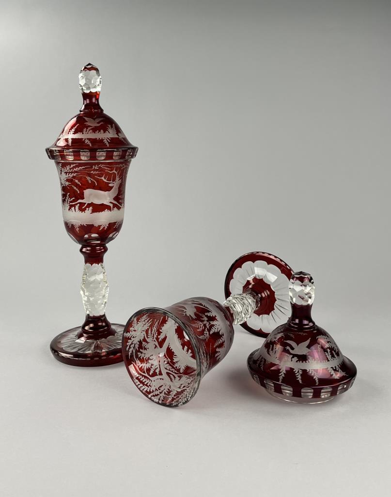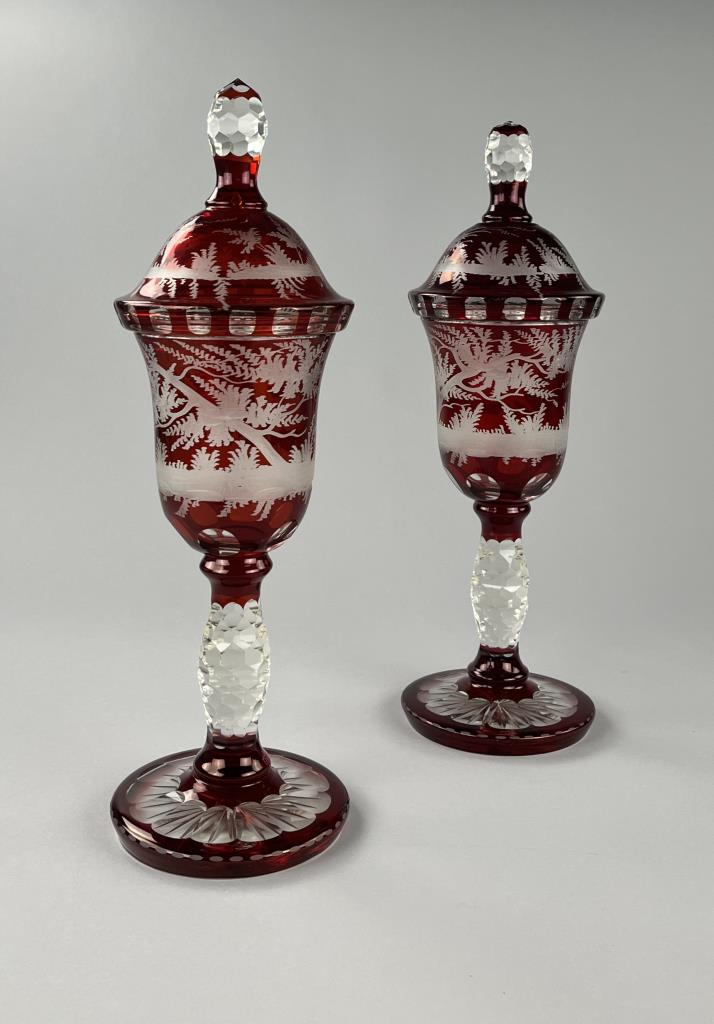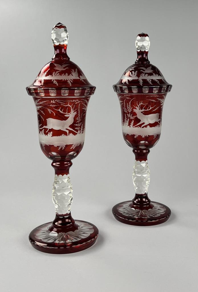 Pair of Bohemian (Czechoslovakia / Czech Republic) ruby cut to clear glass pokals, or pedestal covered goblets, featuring hunting scenes with elk or stags and geese, facet cut knob stems and finials, on star cut bases, early to mid 20th Century, each 19-1/2″ (H). CONDITION: One very minor chip on the top of one finial. SHIPPING: In-House Shipping is available on this item. PLEASE read our Shipping Policies and our full Terms and Conditions prior to bidding.