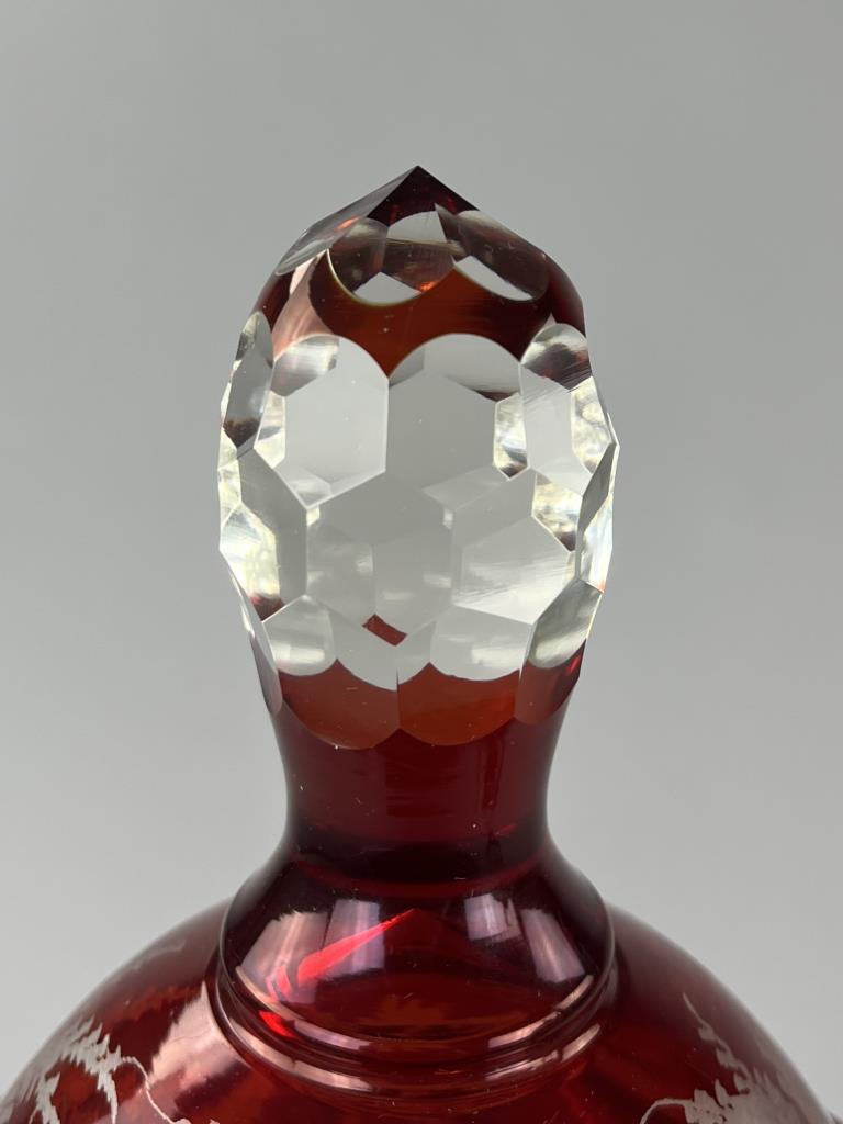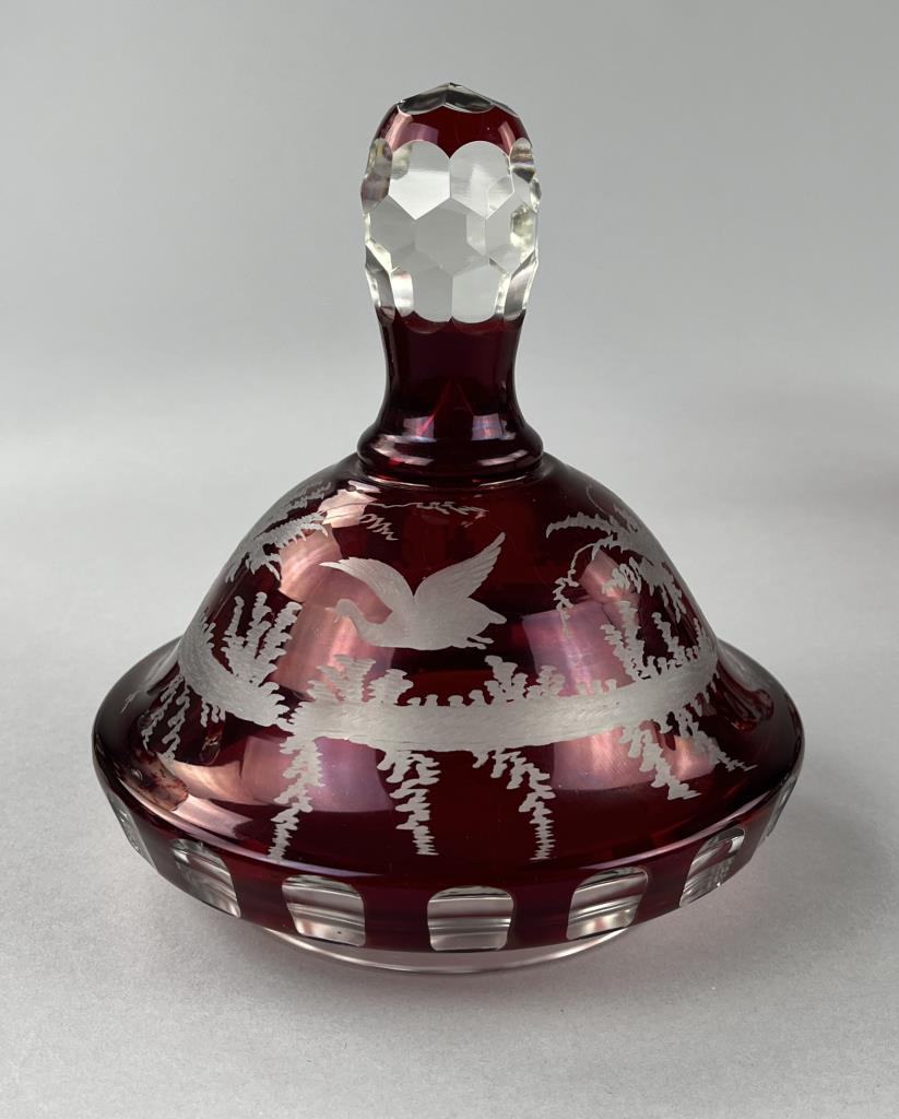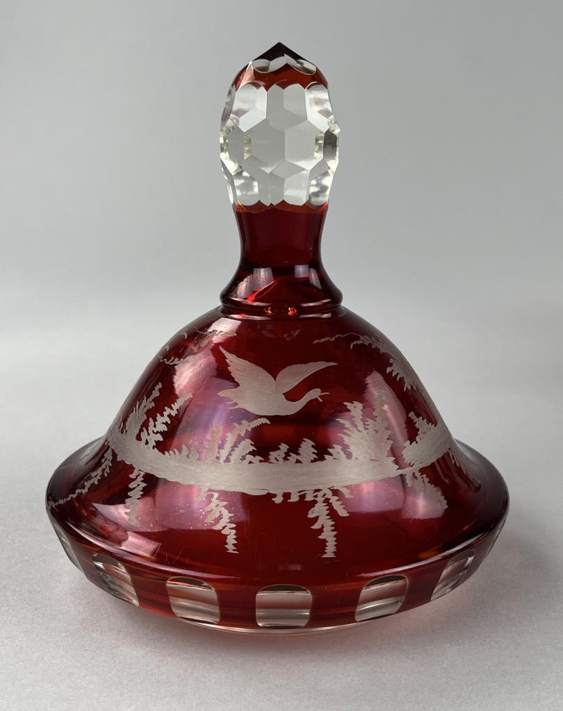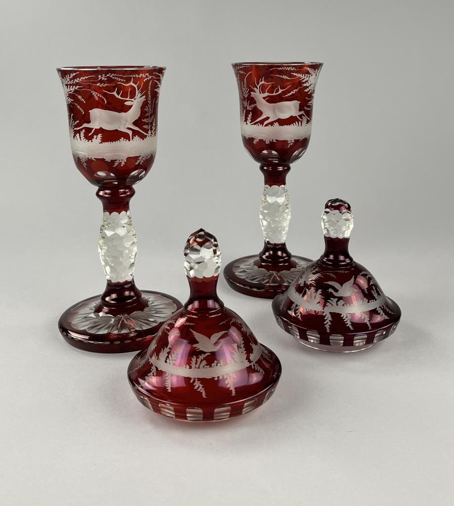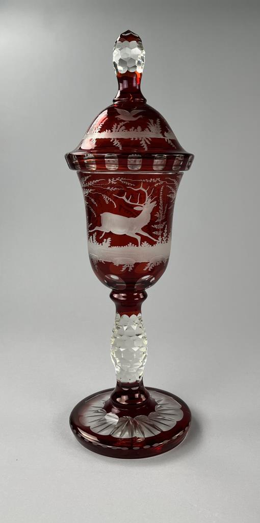 Pair of Bohemian (Czechoslovakia / Czech Republic) ruby cut to clear glass pokals, or pedestal covered goblets, featuring hunting scenes with elk or stags and geese, facet cut knob stems and finials, on star cut bases, early to mid 20th Century, each 19-1/2″ (H). CONDITION: One very minor chip on the top of one finial. SHIPPING: In-House Shipping is available on this item. PLEASE read our Shipping Policies and our full Terms and Conditions prior to bidding.