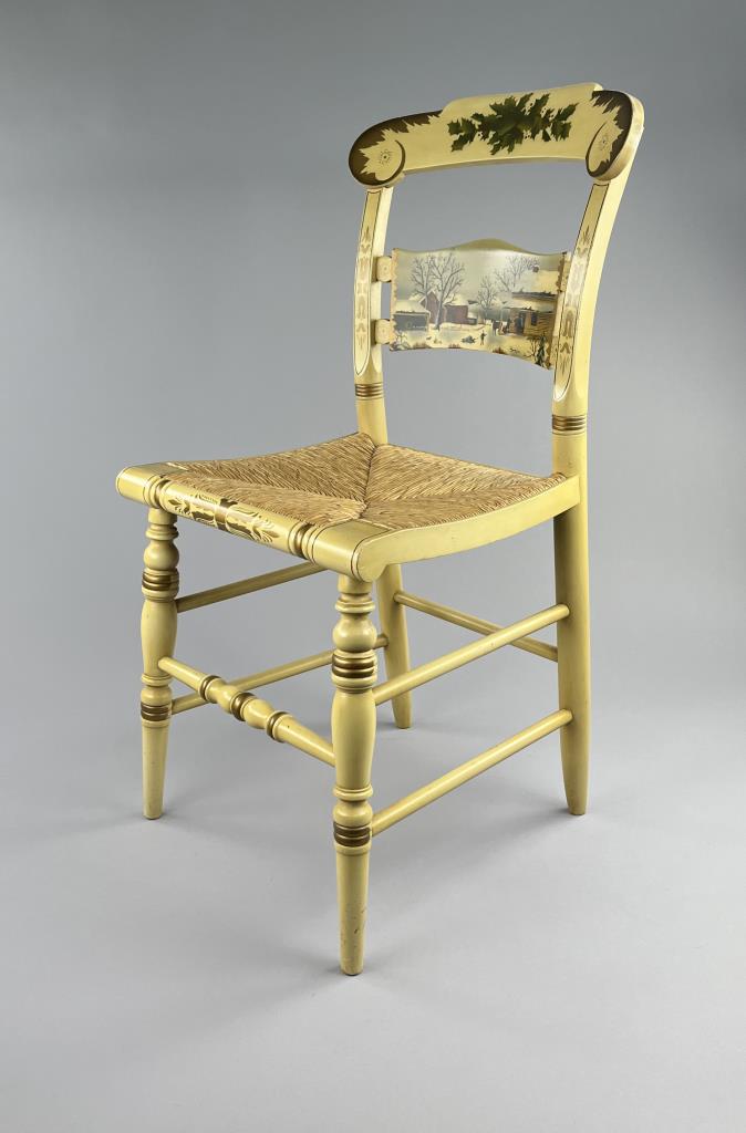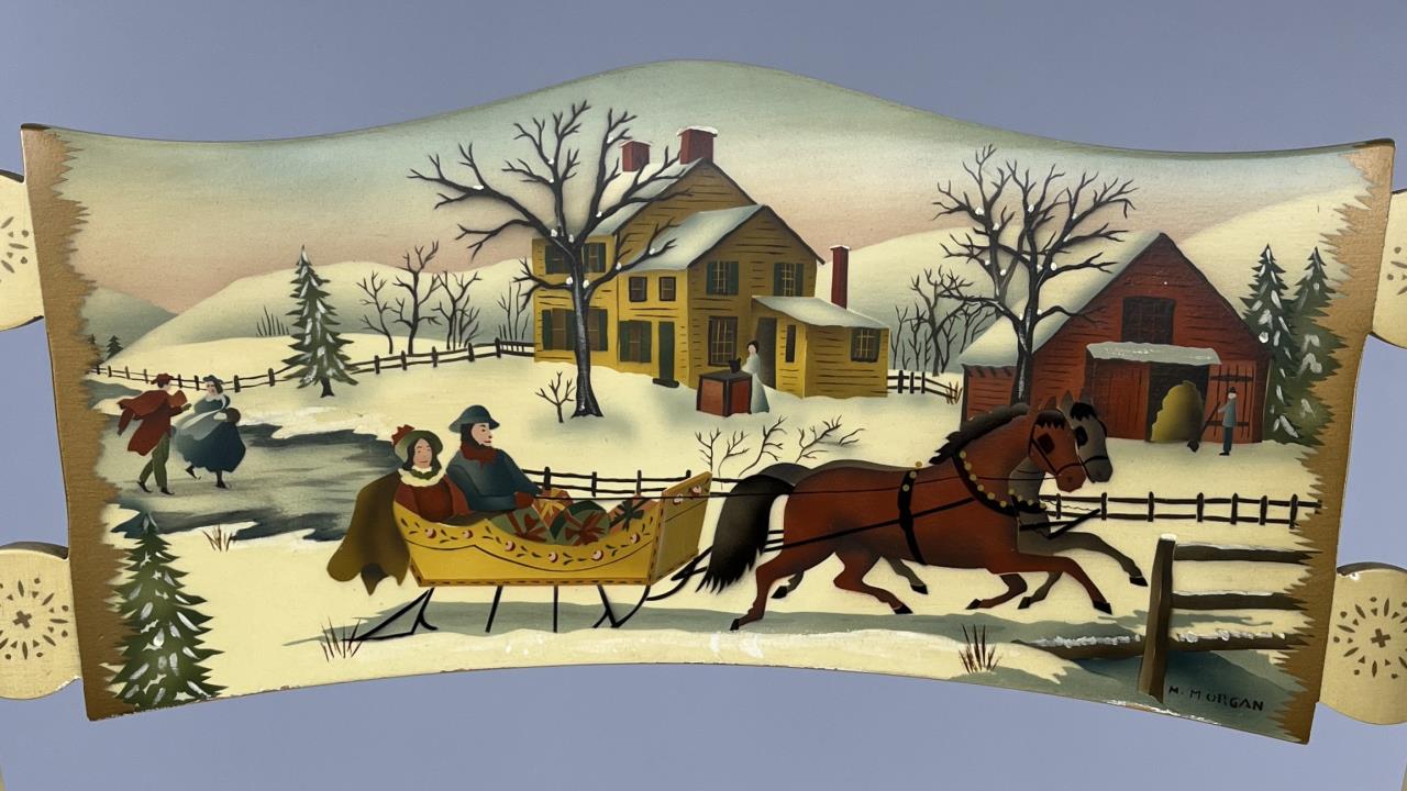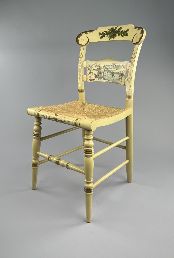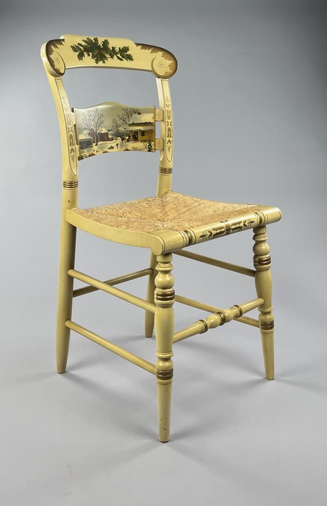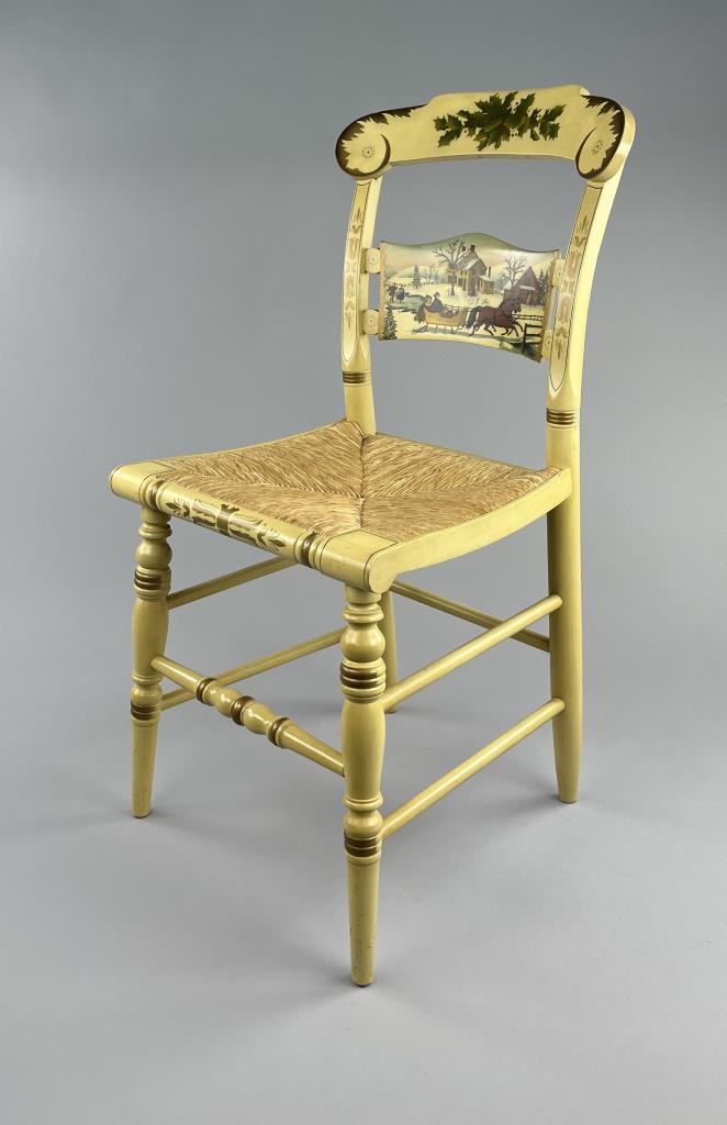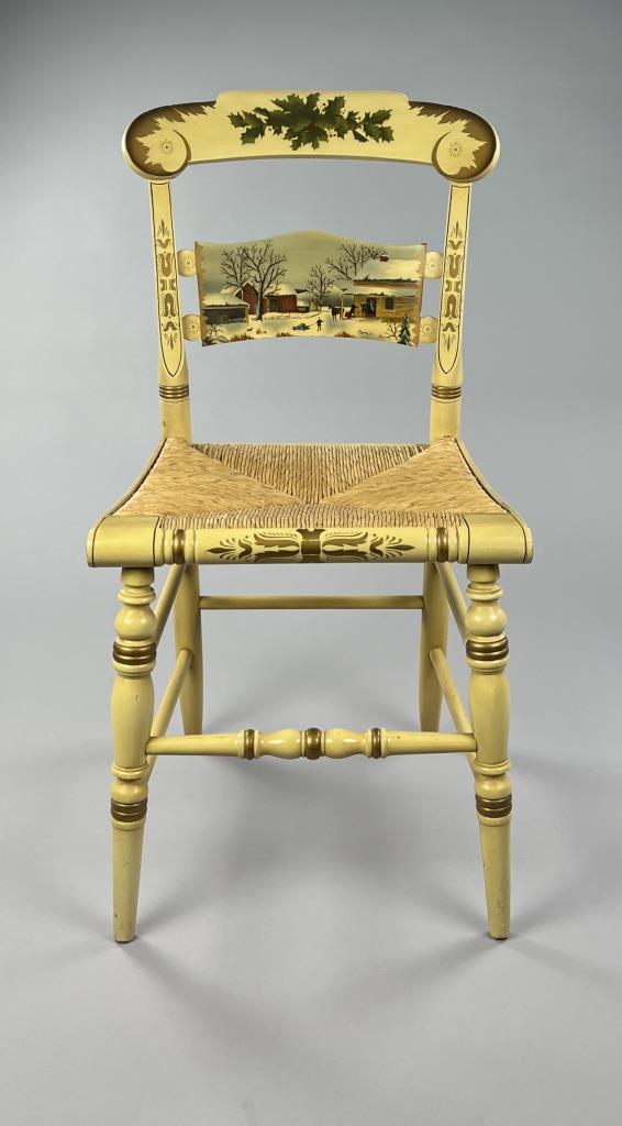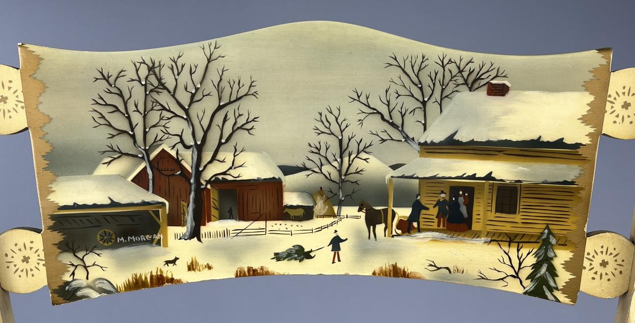 Set of four L. Hitchcock (Riverton, Connecticut) limited edition Christmas fancy side chairs, for 1972 (“124” or “12 H”), 1973 (#85/100), 1974 (#20/100), and 1975 (#27/100), hand-stencilled and hand-painted, each signed lower left “M. Morgan” for Mel Morgan, the Art Director at L. Hitchcock for many years. In addition, the 1974 and 1975 chairs are also marked on the underside of the back rung “Marshall Fields and Company Chicago”. Each chair measures approximately 18-5/8″ (L) x 18-5/8″ (W) x 35-3/8″ (H). CONDITION: Some minor scratches and scuffs commensurate with age and use, please see photos. SHIPPING: Local pick-up or third party shipping only for this lot. Please see the Shipping Policy for information on suggested shippers. We recommend the Pak Mail Store of Battle Creek to assist you. Please contact the shipper of your choice for shipping estimates on this lot. Refer to the Shipping section in our full Terms and Conditions for all information on shipping.